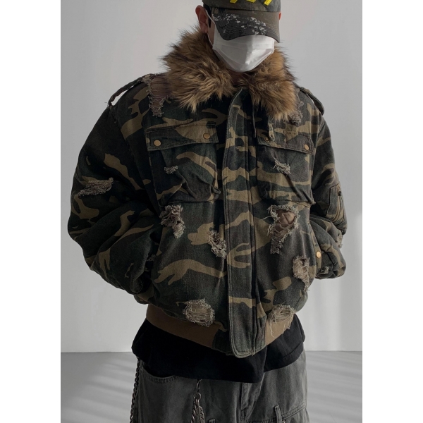 韓國 迷彩 全黑 絨毛領 重工 破壞 設計感 多口袋 重磅 工作外套 (2col...