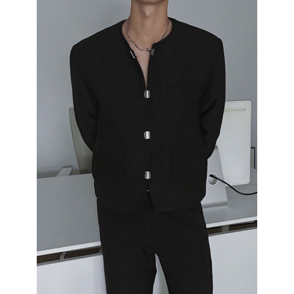 ASCLO 極簡 金屬扣 設計 素色 墊肩 短版 無領 西裝外套 (2color...