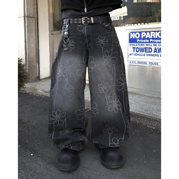 Cause closet 手繪 花朵 線條 設計感 水洗 寬版 牛仔褲 (2co...