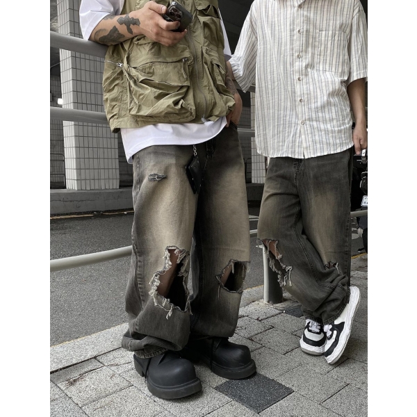 HOLY IN CODE 方形破壞 復古 水洗 刷色 寬版 黑牛仔褲