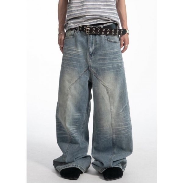 韓國 不規則 彎曲 拼接 裁片 泥汙 水洗 寬版 牛仔褲 (2color)