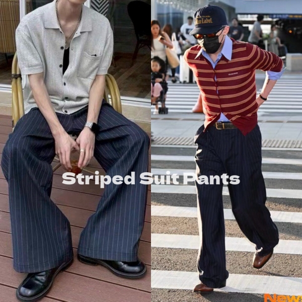 韓國 老錢風 直條紋 輪廓 垂墜感 寬版 西裝褲 GD機場相似款 (2color...