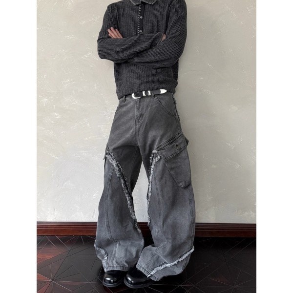 毛邊 破壞 設計感 立體 輪廓 水洗 寬版 牛仔褲
