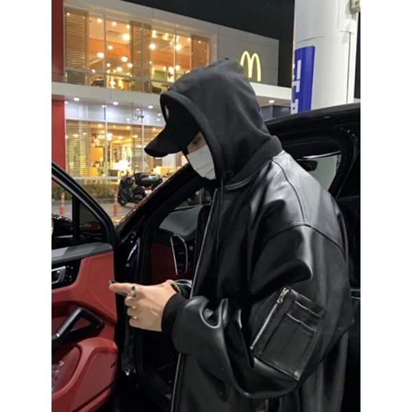 韓國 假兩件 高級感 工裝 拉鍊 大口袋 連帽 皮外套 皮夾克