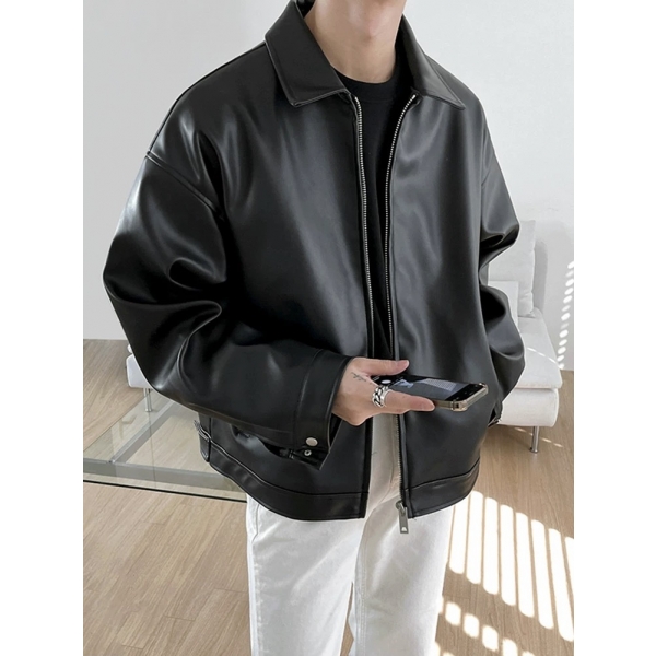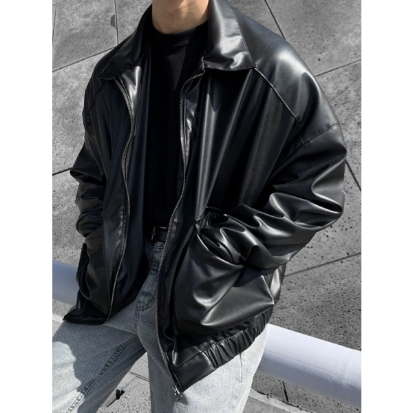 韓國 痞帥 光澤感 立體 重磅 素色 拉鍊 皮外套 皮夾克
