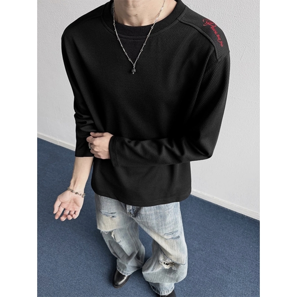 華夫格 肩部 刺繡 小文字 設計 單穿 打底 長袖 上衣 (2color)