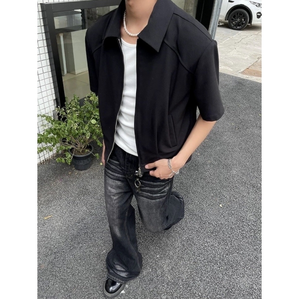 BOXY 墊肩 短版 翻領 素色 拉鍊 短袖襯衫 (2color)