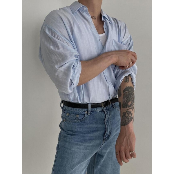 NTVT 亞麻 清爽 隱約 條紋 口袋 薄長袖襯衫 (3color)