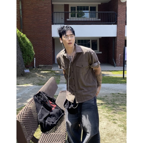 HOLY IN CODE 秋意 氛圍感 直條紋 反折設計 雙口袋 短袖襯衫 (2...