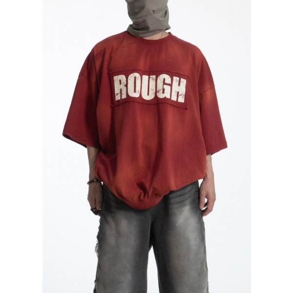 韓國 ROUGH 斑駁 貼布 衛衣式 落肩 短袖 上衣 (2color)
