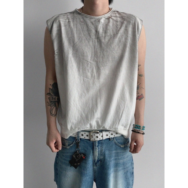 韓國 水洗 做舊 褪色感 寬肩 無袖 背心 上衣 (2color)