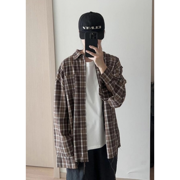 韓國 NEW 格紋 破壞 抽鬚下擺 口袋 薄長袖襯衫 (3color)