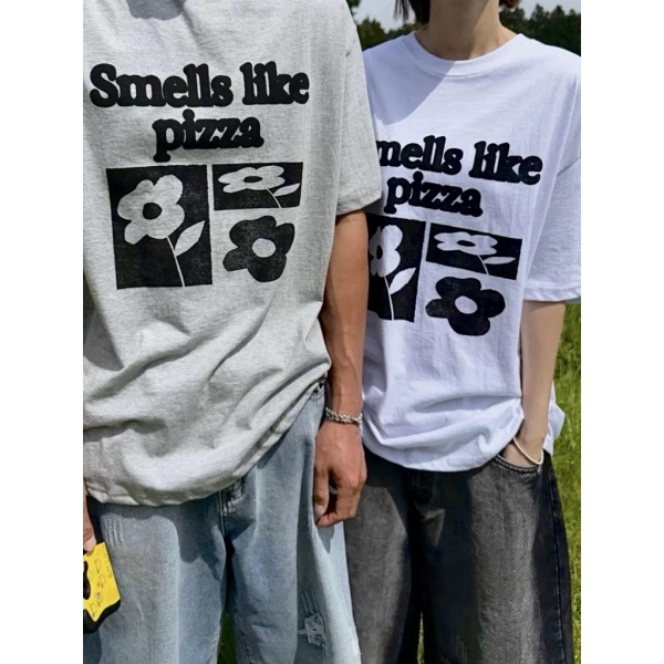 韓國 Smells Like Pizza 小花 照片 情侶 短T 短袖 上衣 (...