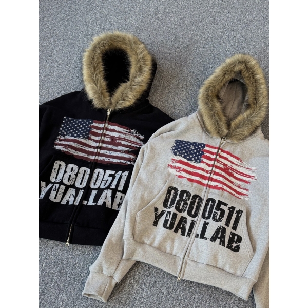 韓國 YUAI.LAB 美式 刷漆 BOXY 短版 素色 絨毛 拉鍊 連帽外套 ...