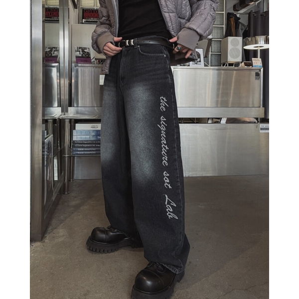 2PLAN SIGNATURE 手寫 文字 做舊感 水洗 寬版 黑牛仔褲