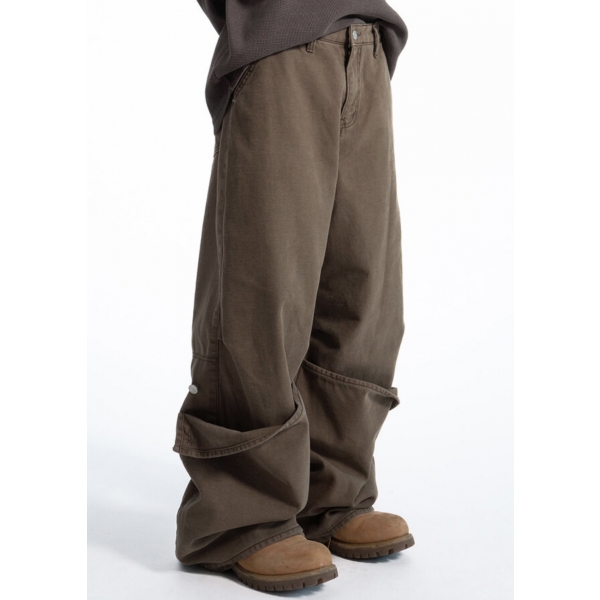 韓國 褲腳鈕扣 設計感 外折 層次 水洗 寬版 工作褲 (2color)