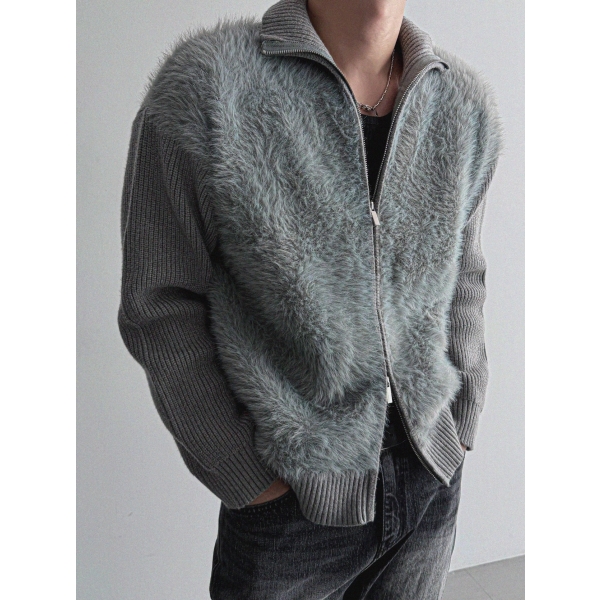 韓國 絨毛 皮草 針織 拼接 高貴感 短版 拉鍊外套 (2color)