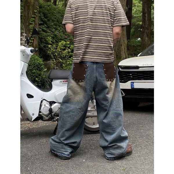 HOLY IN CODE 西部牛仔 特殊口袋 泥汙 做舊 設計感 水洗 寬版 牛...