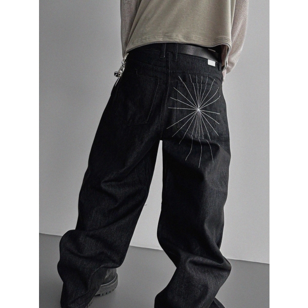 韓國 蜘蛛 刺繡 重磅 丹寧 寬版 牛仔褲 (2color)