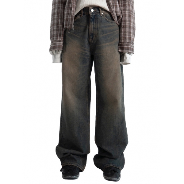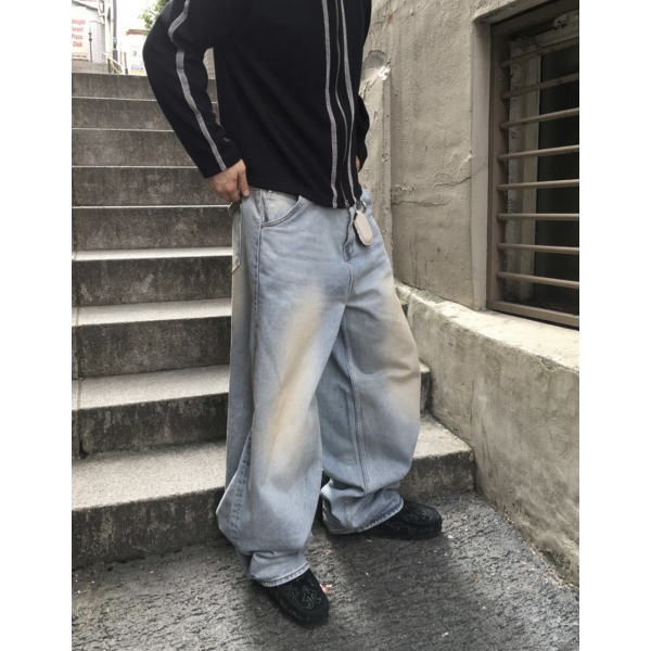 韓國 亞馬遜 沼澤 泥汙 做舊感 水洗 寬版 牛仔褲