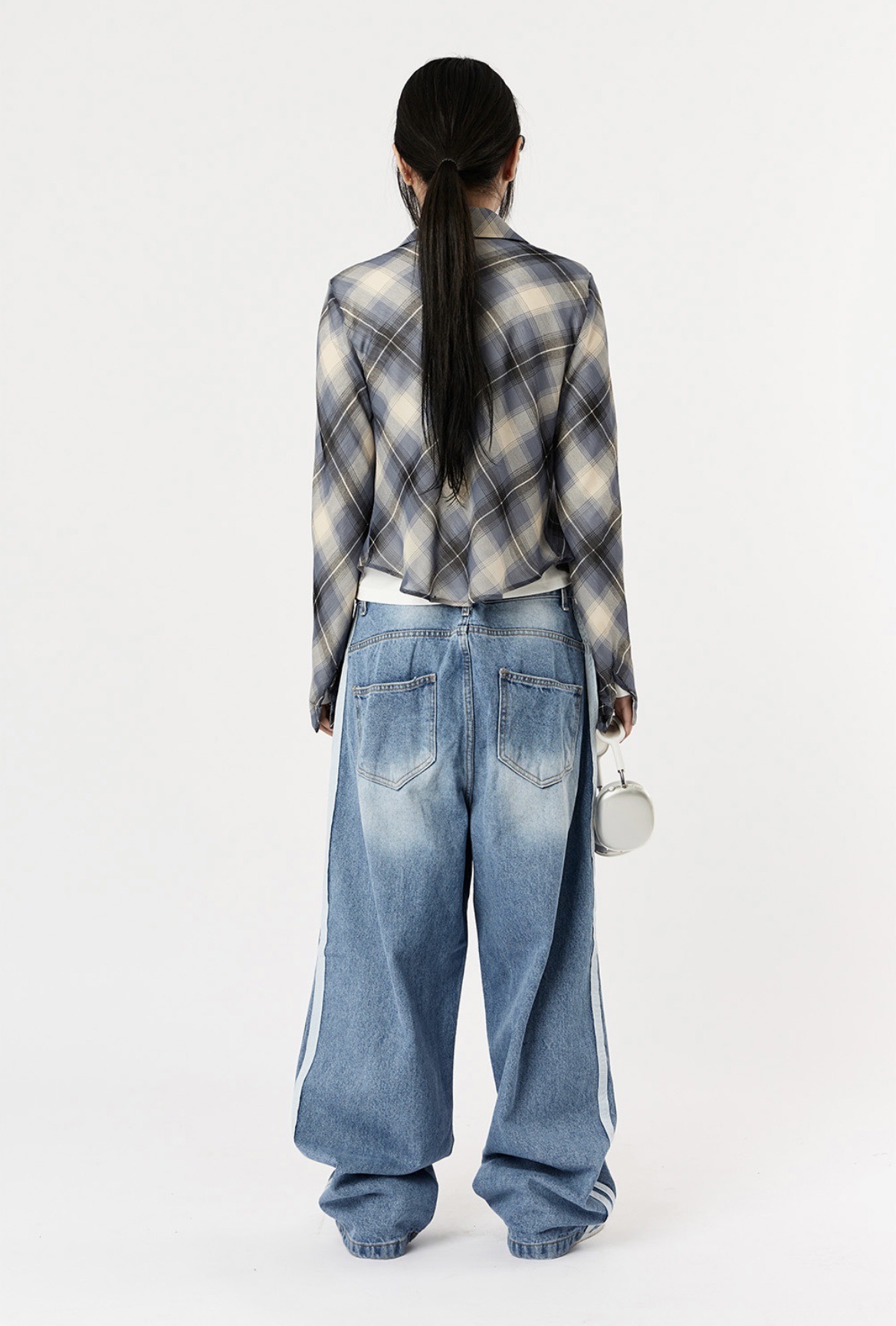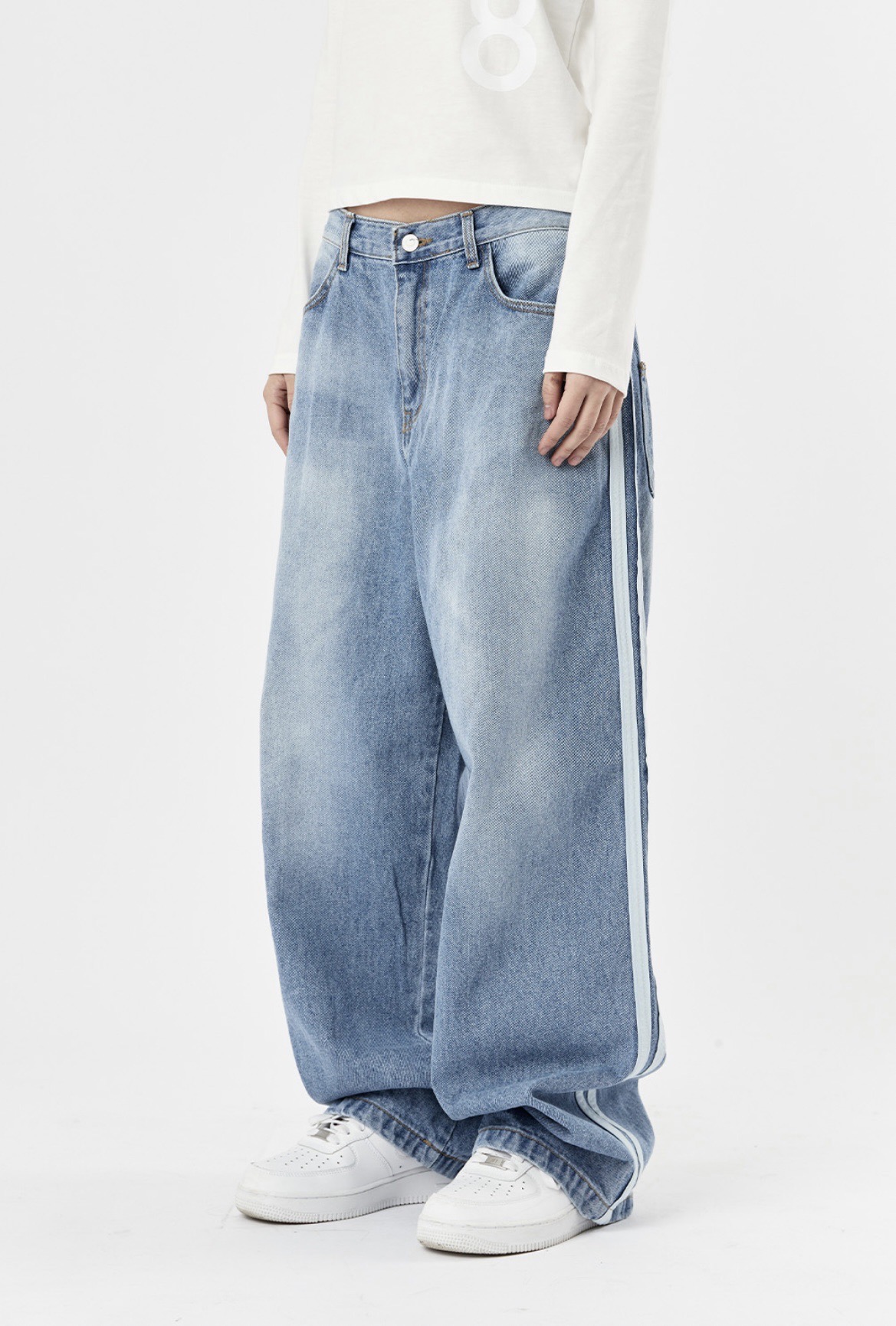 Rauco house 聯名感 雙線條 堆積感 水洗藍 寬版 牛仔褲