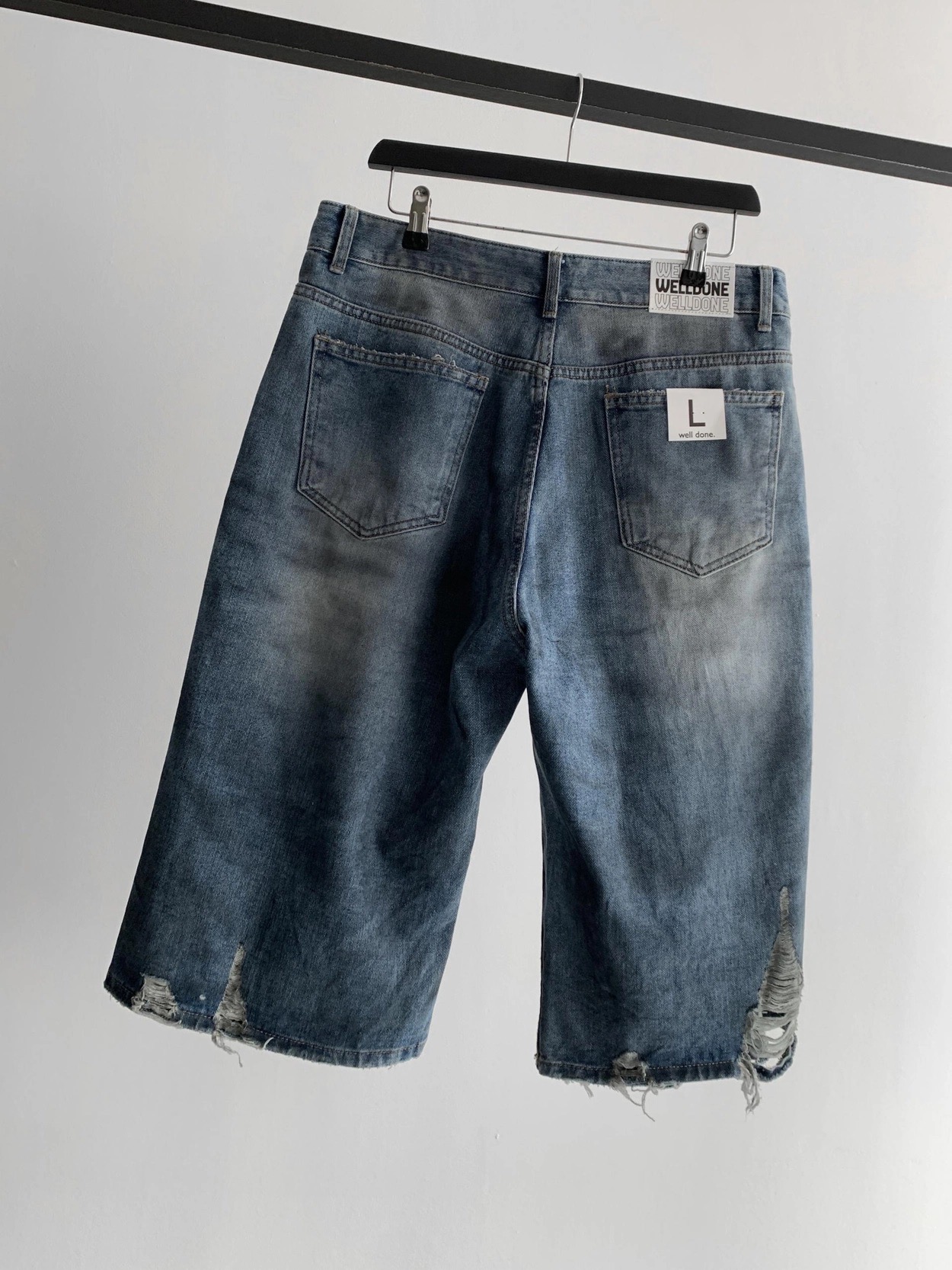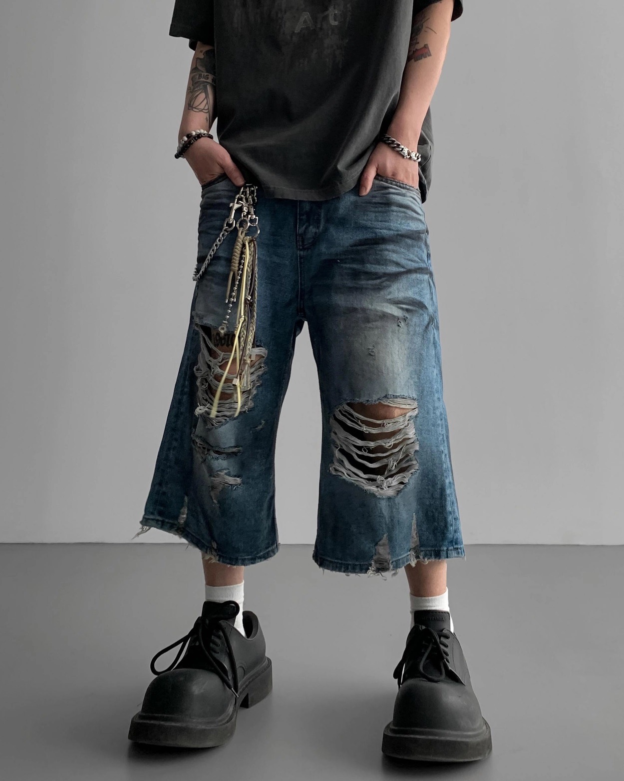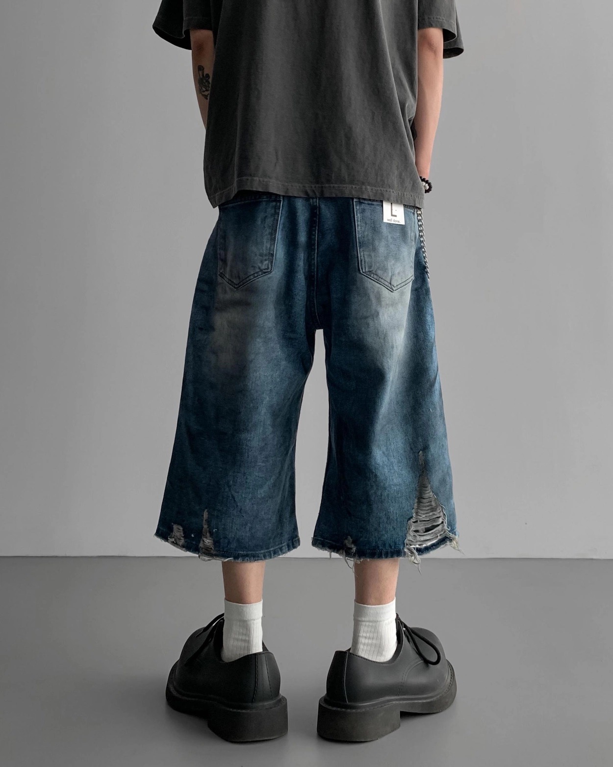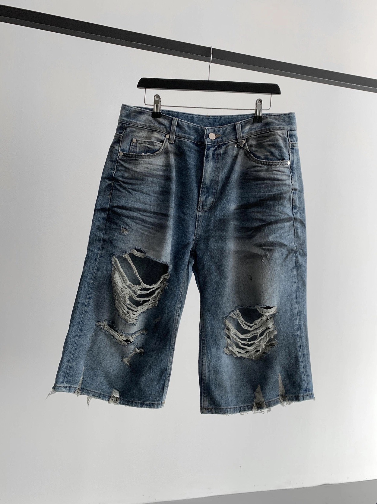 韓國 DAMAGED 大破壞 七分 做舊感 水洗 寬版 牛仔短褲