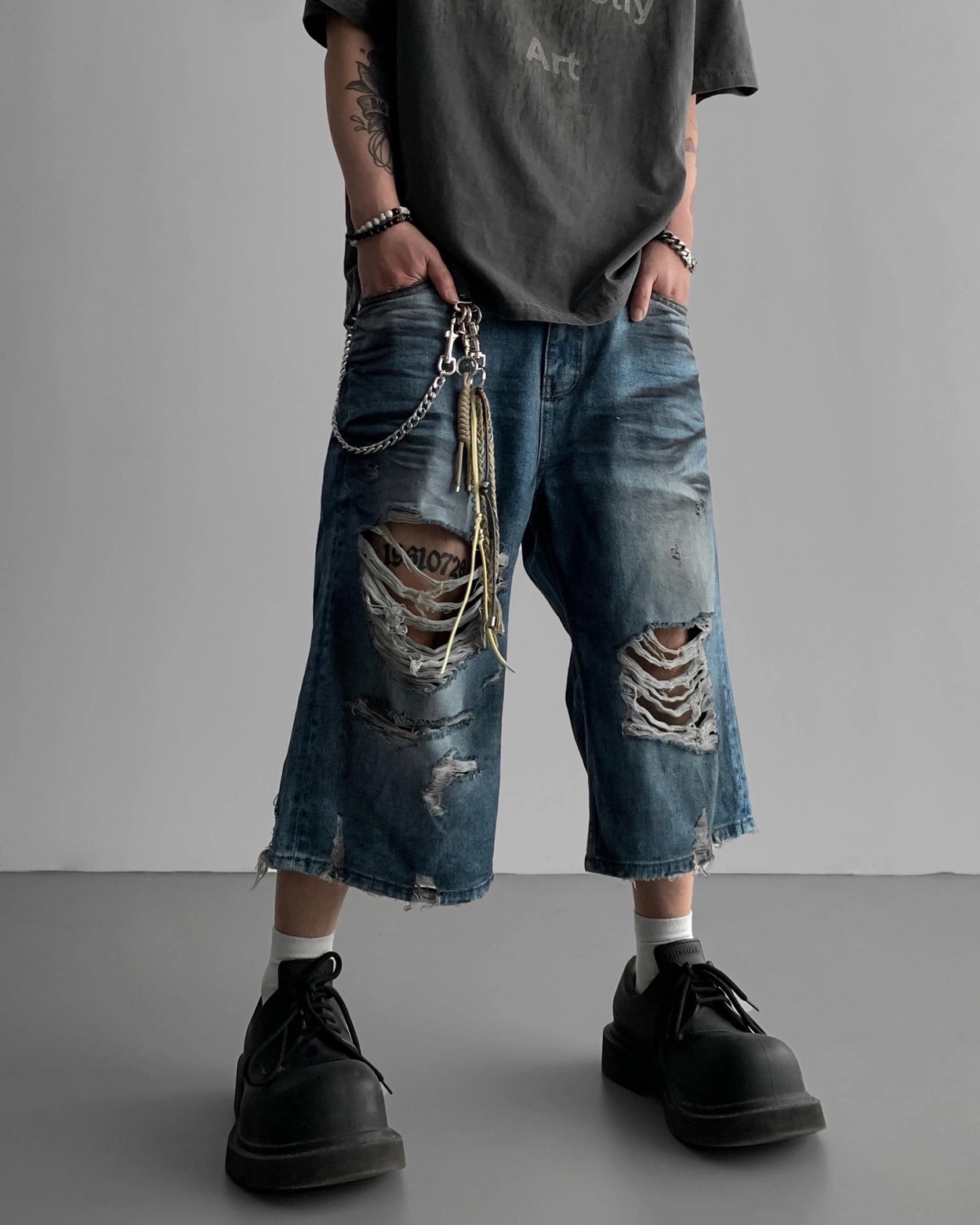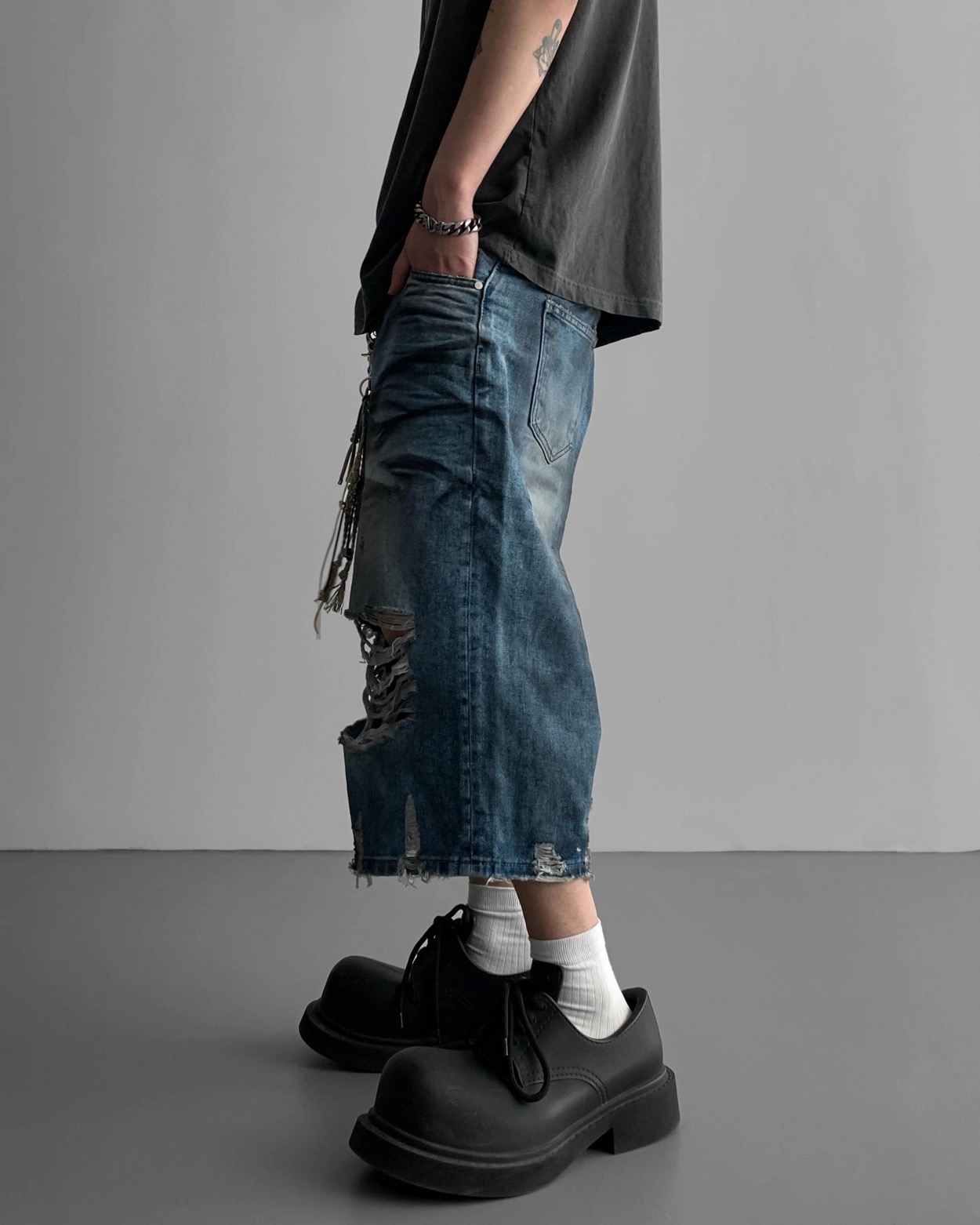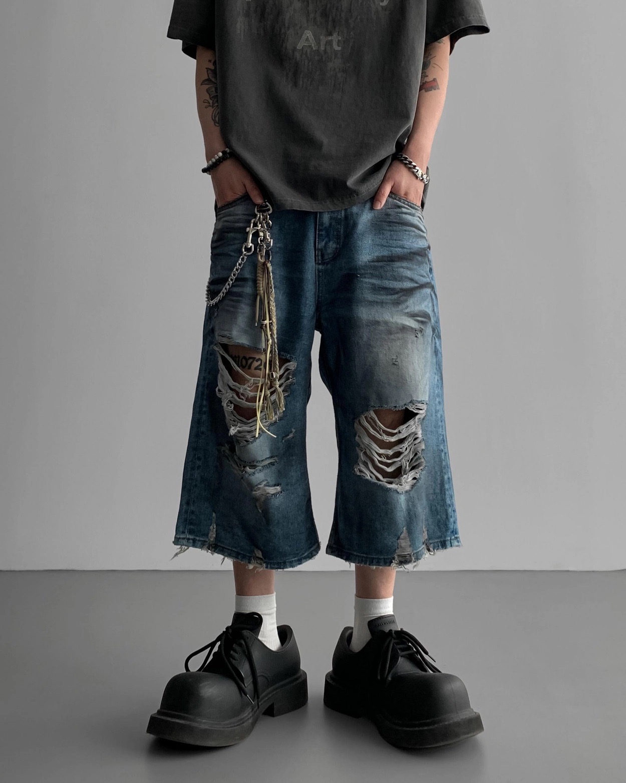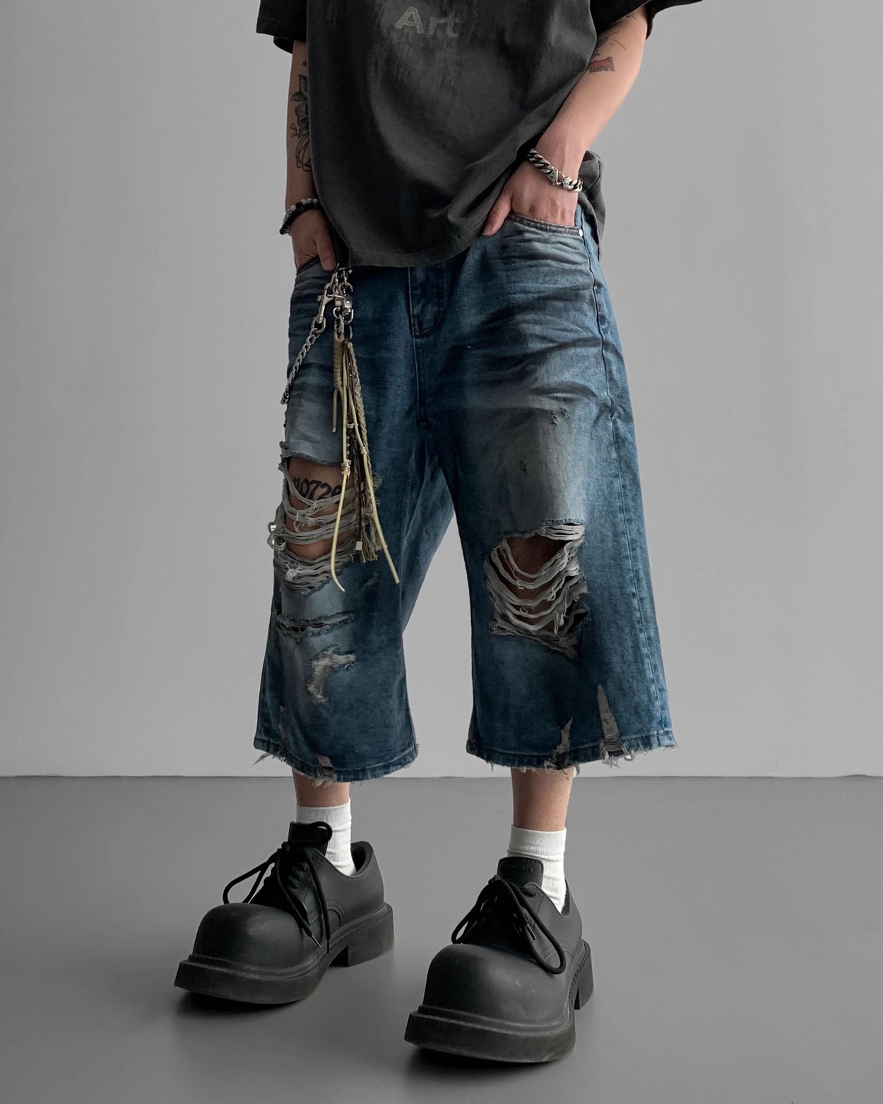 韓國 DAMAGED 大破壞 七分 做舊感 水洗 寬版 牛仔短褲