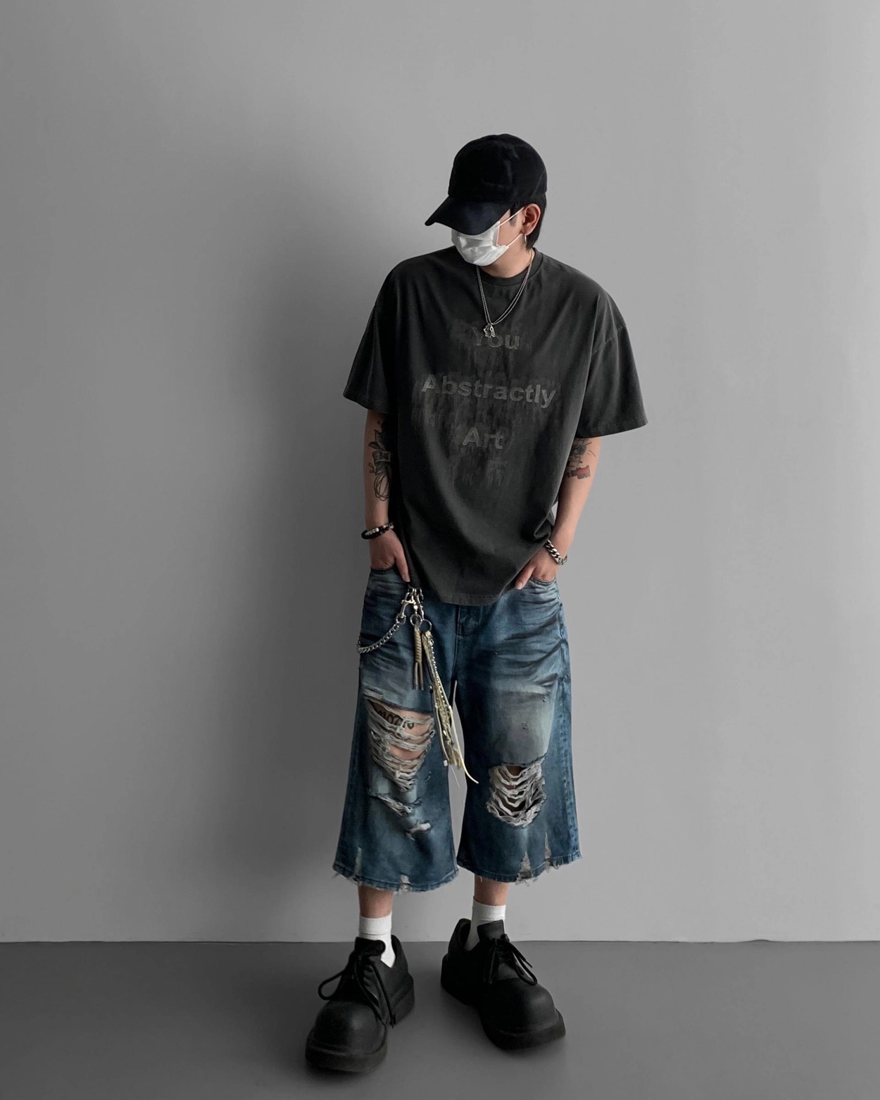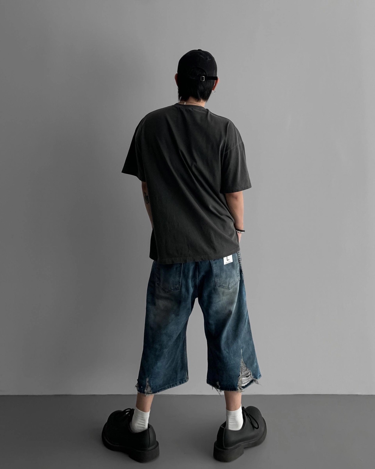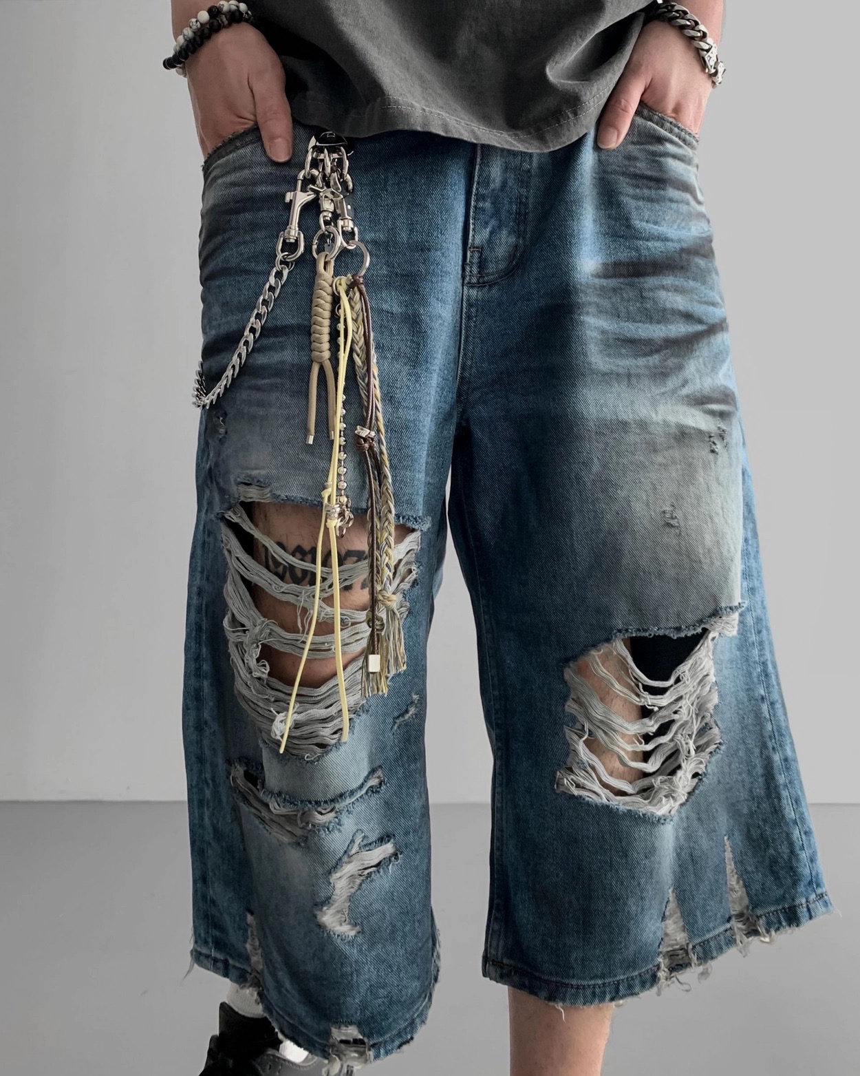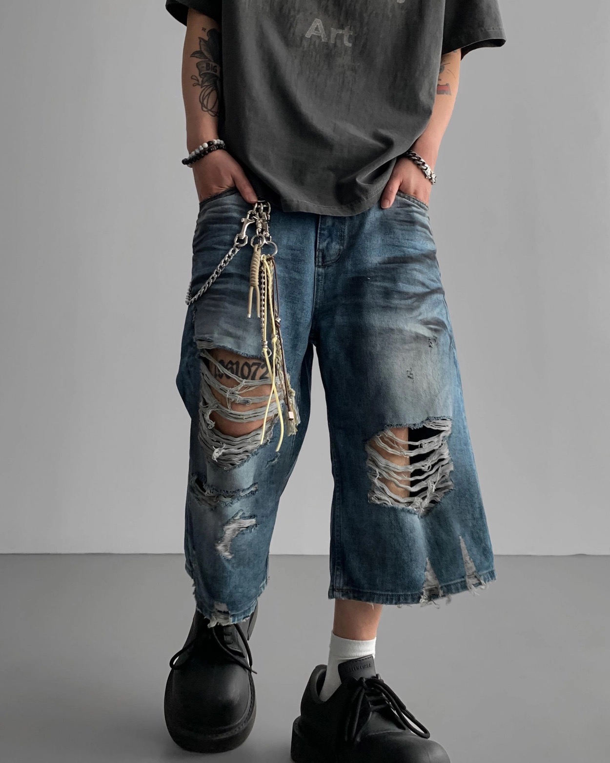 韓國 DAMAGED 大破壞 七分 做舊感 水洗 寬版 牛仔短褲