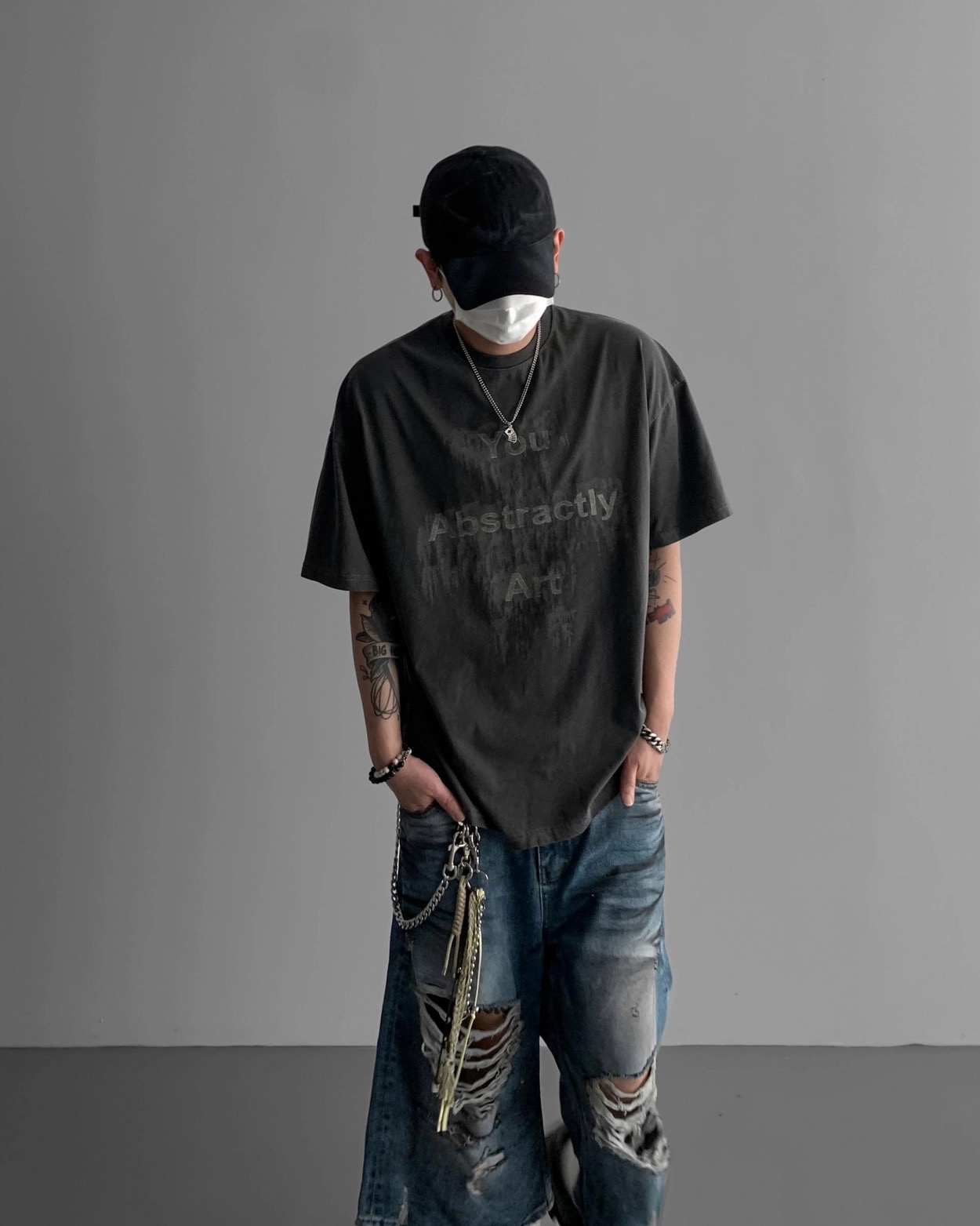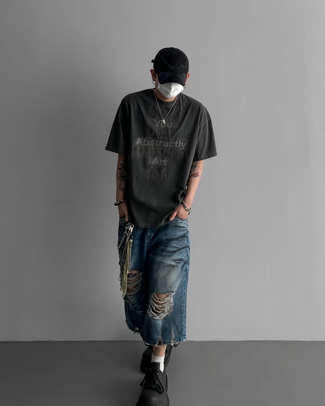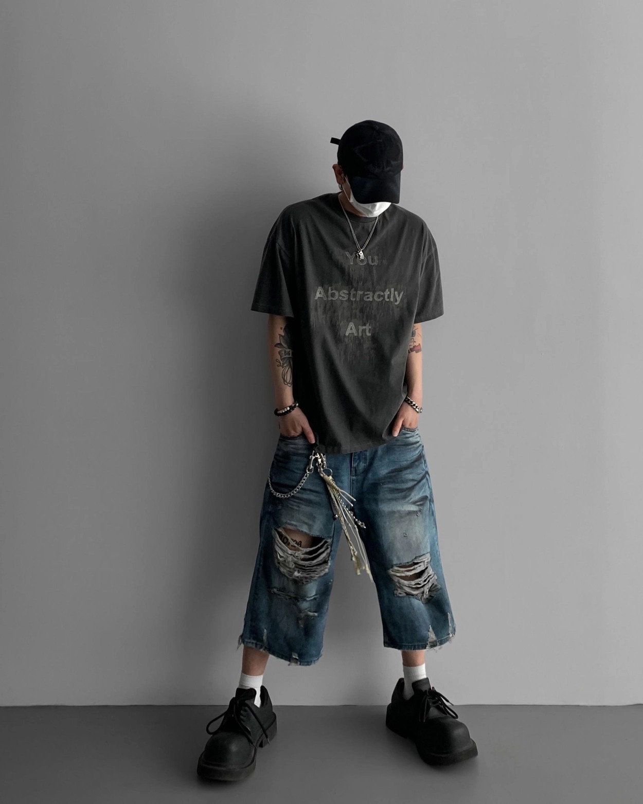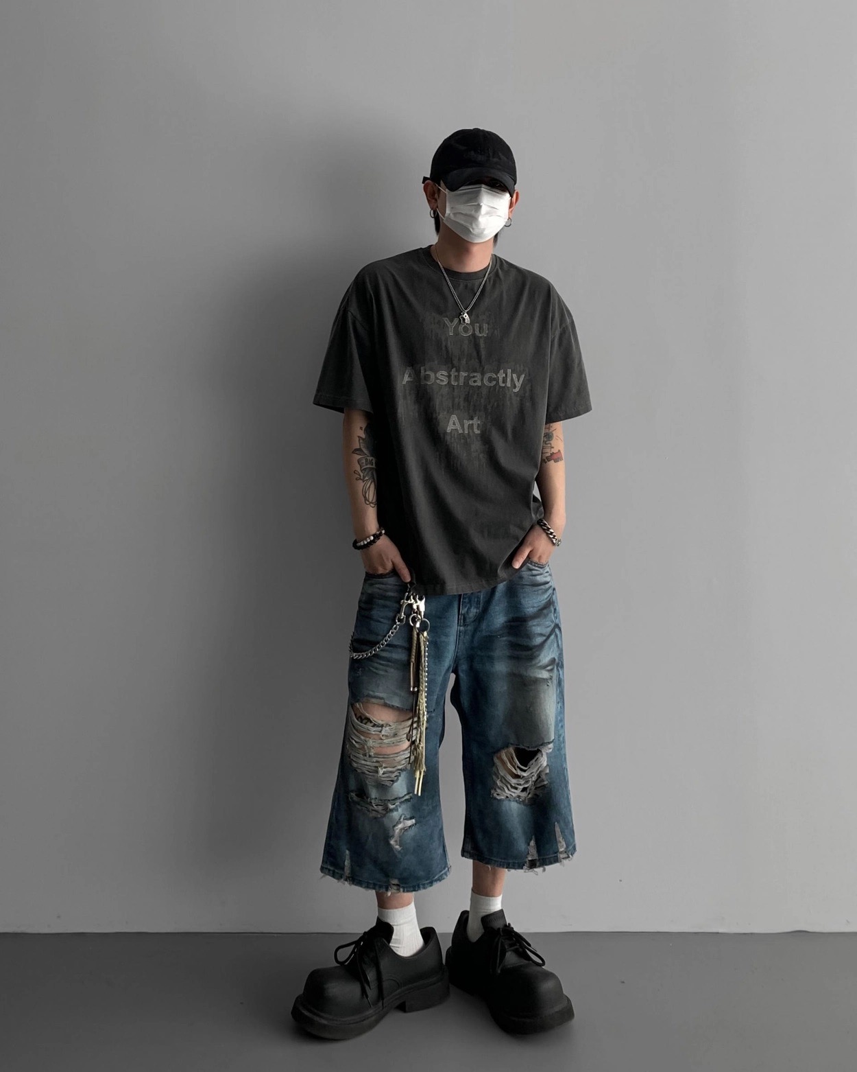 韓國 DAMAGED 大破壞 七分 做舊感 水洗 寬版 牛仔短褲