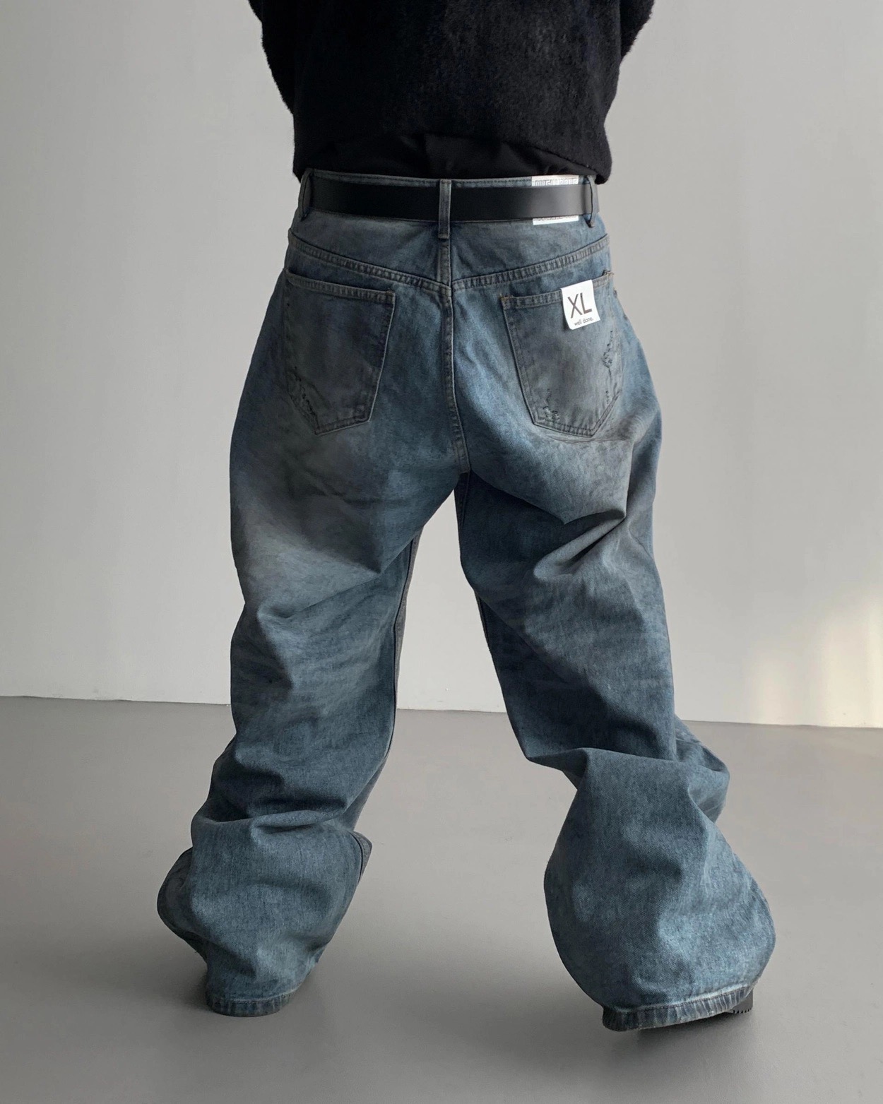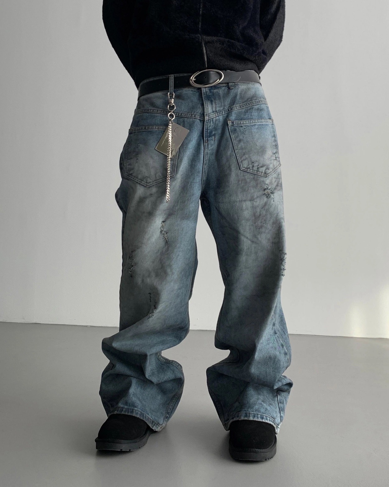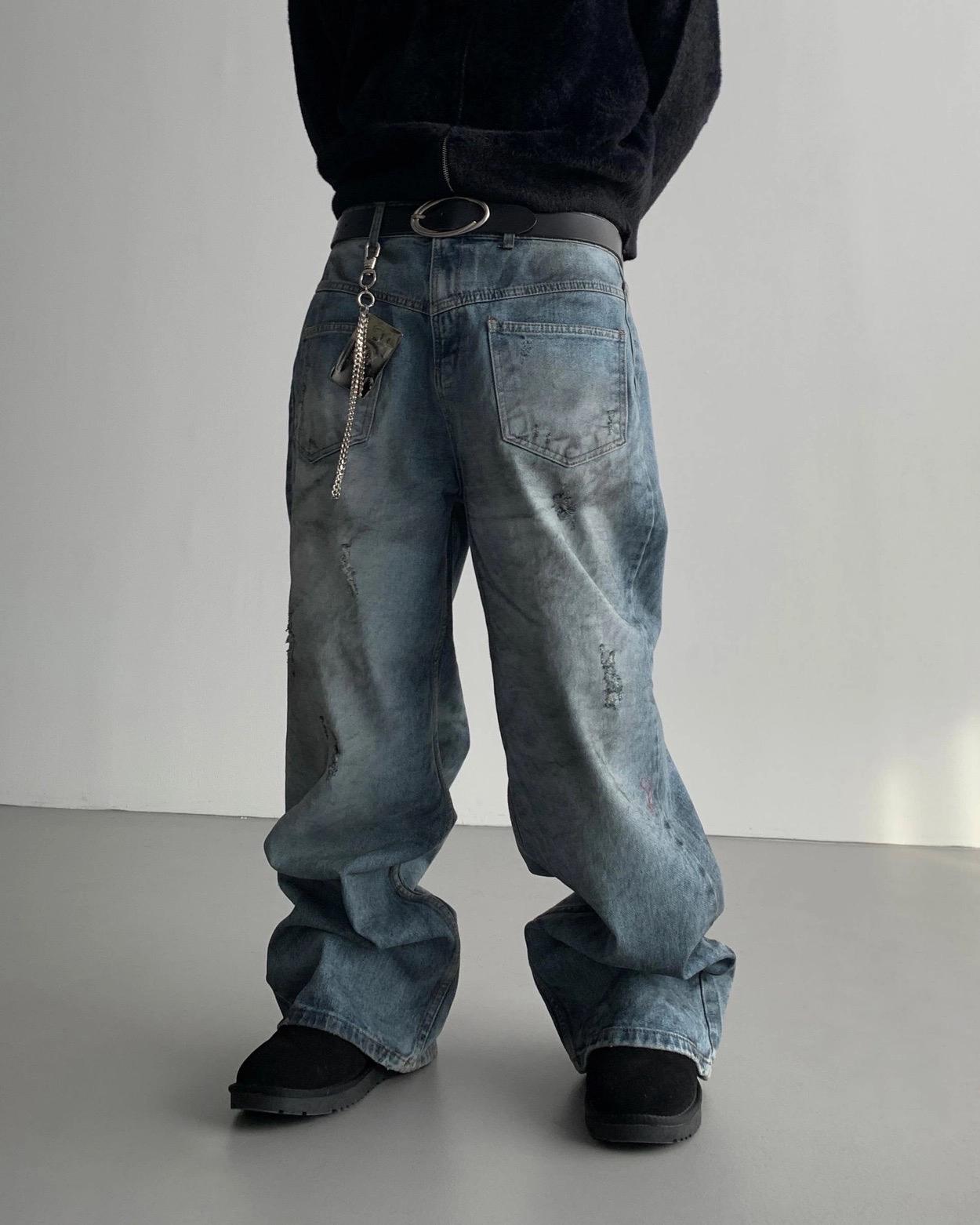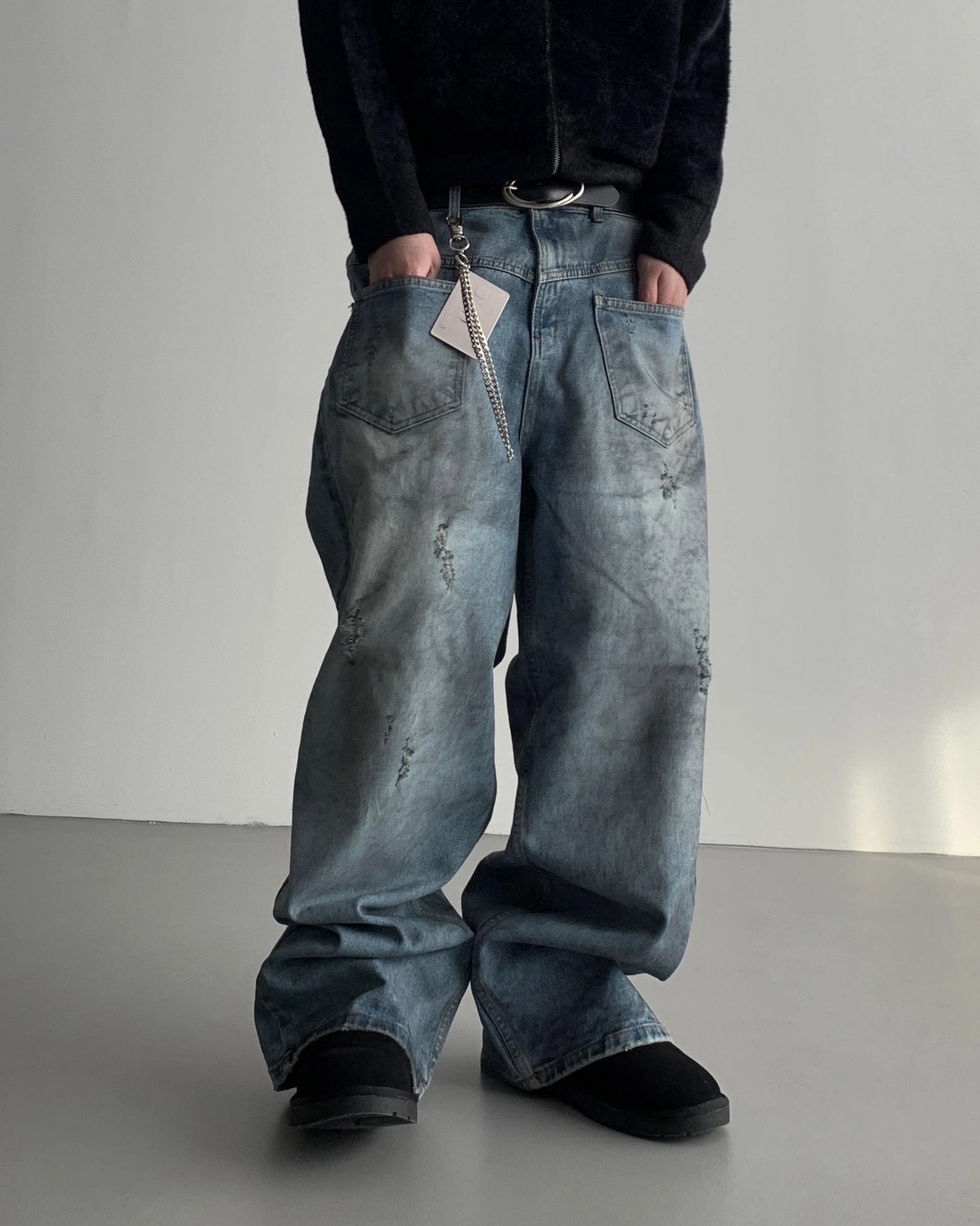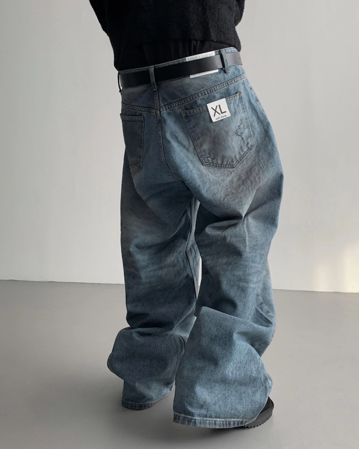 韓國 口袋 翻轉 髒汙 水洗 寬版 牛仔褲
