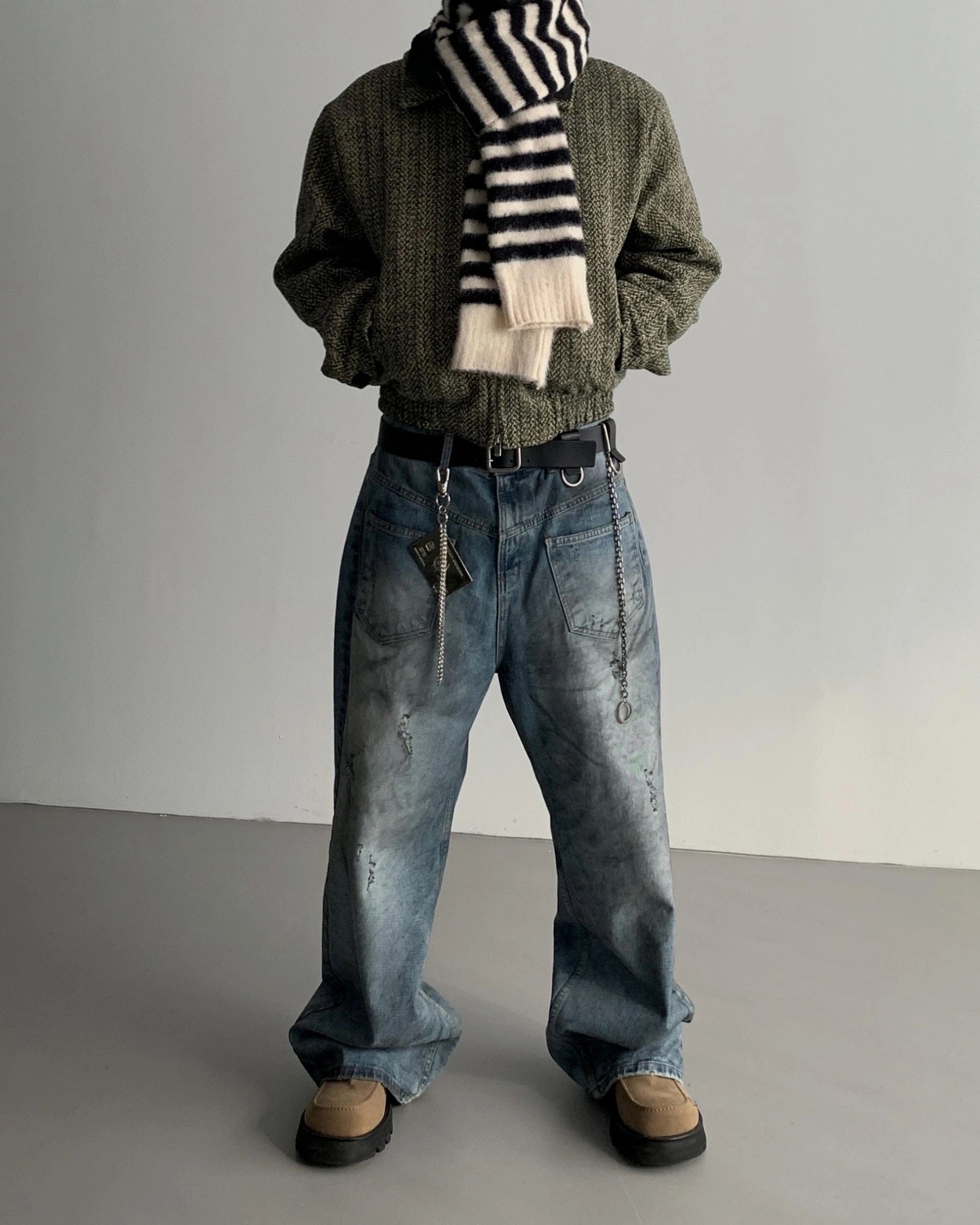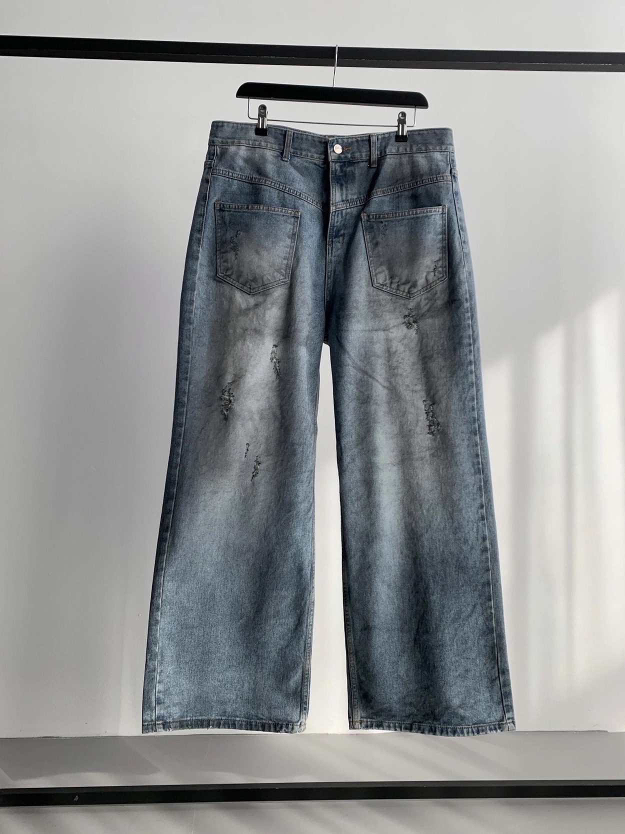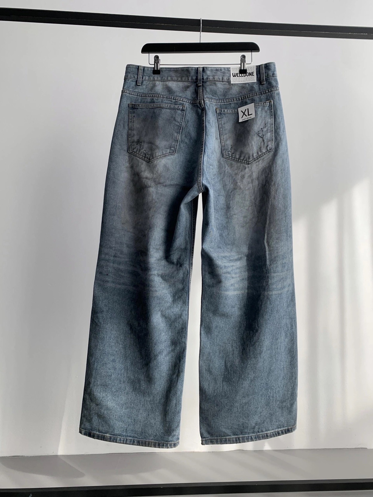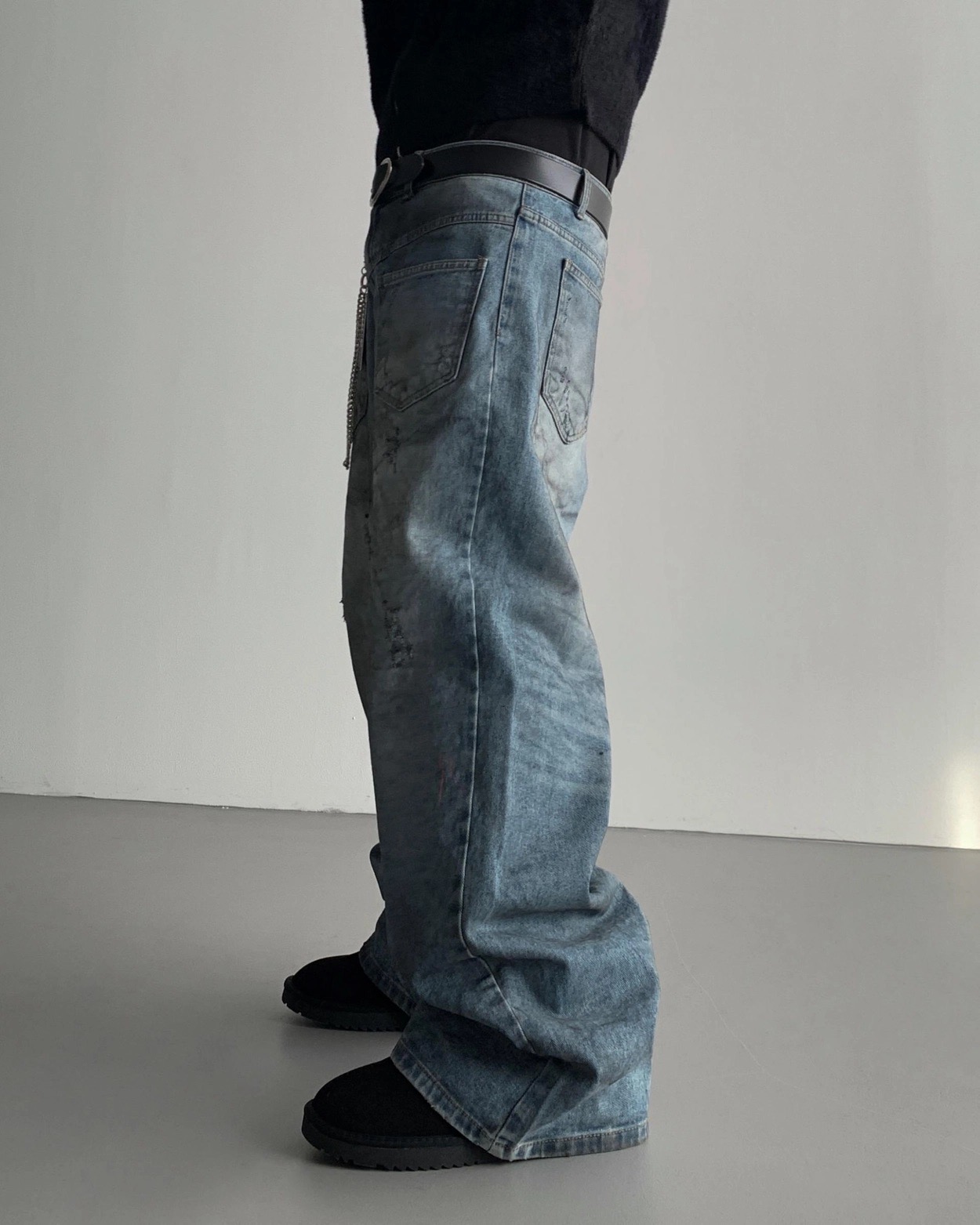 韓國 口袋 翻轉 髒汙 水洗 寬版 牛仔褲