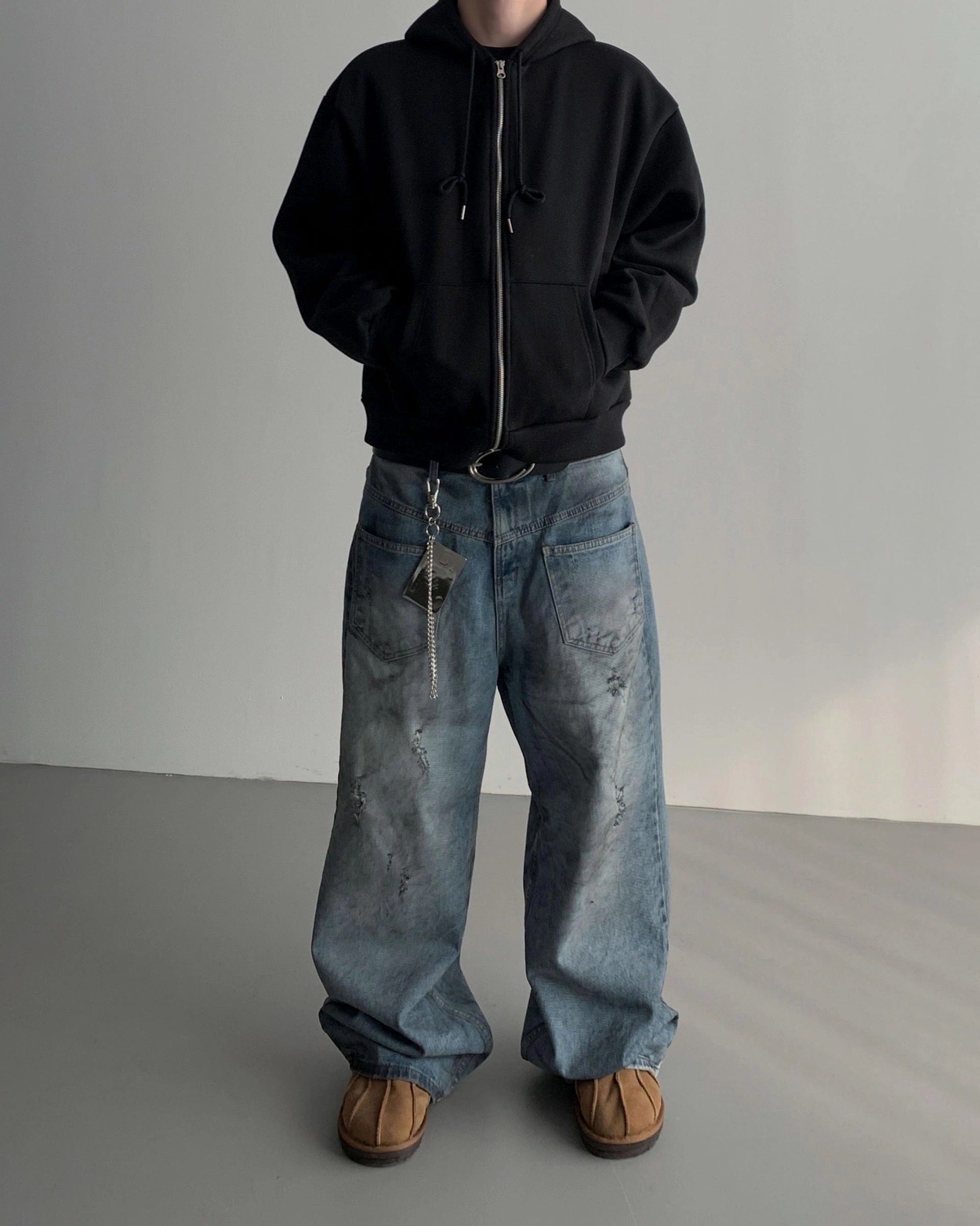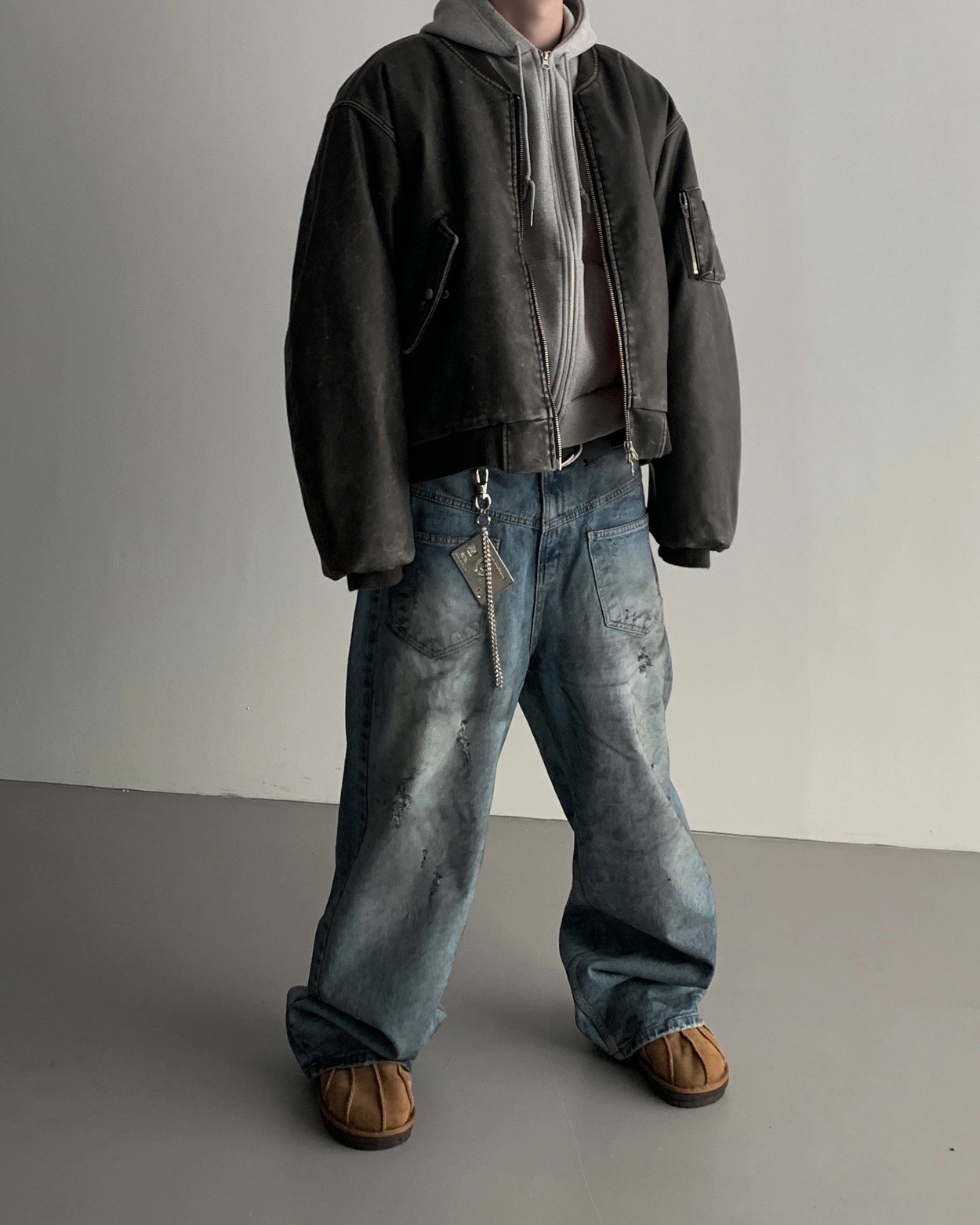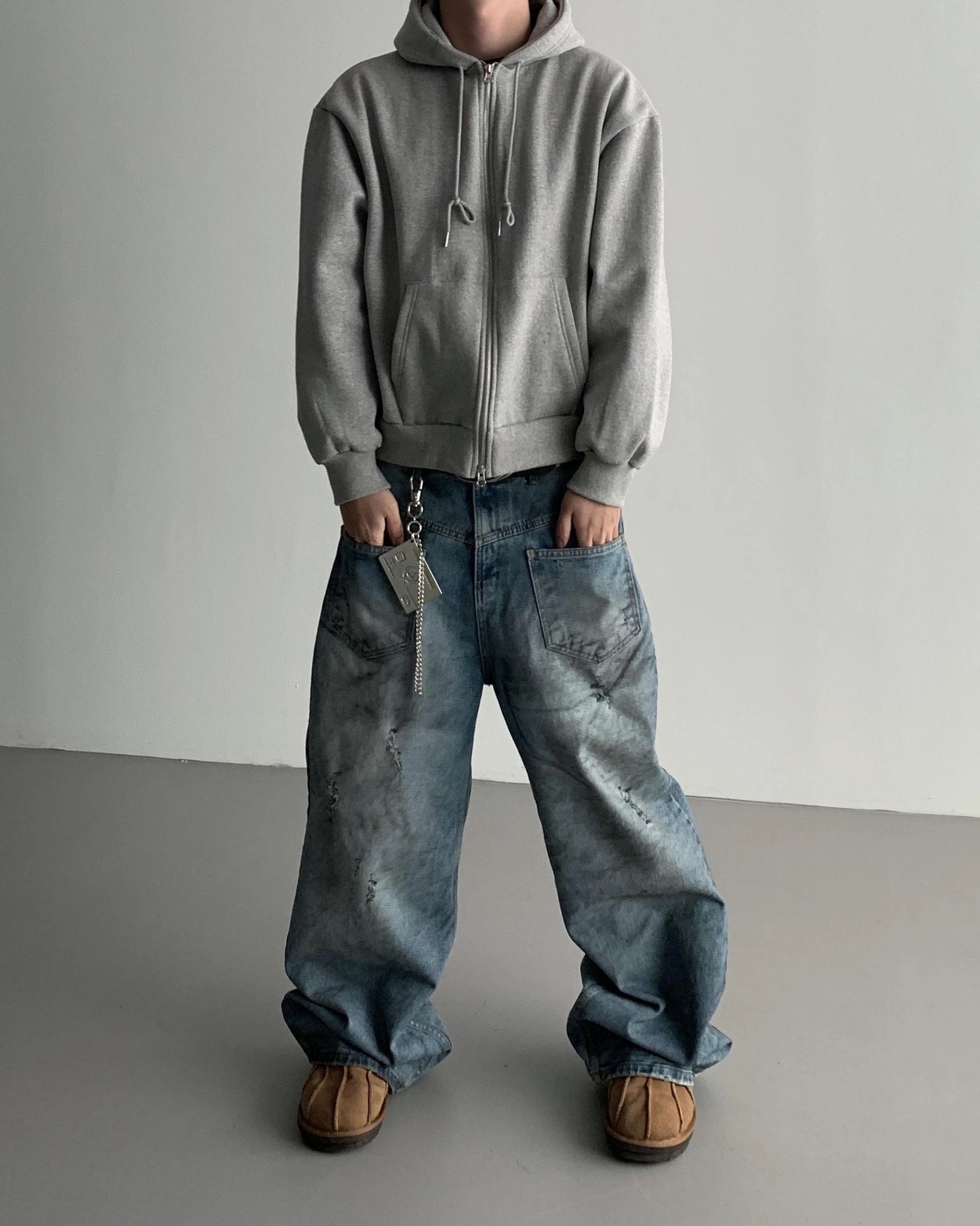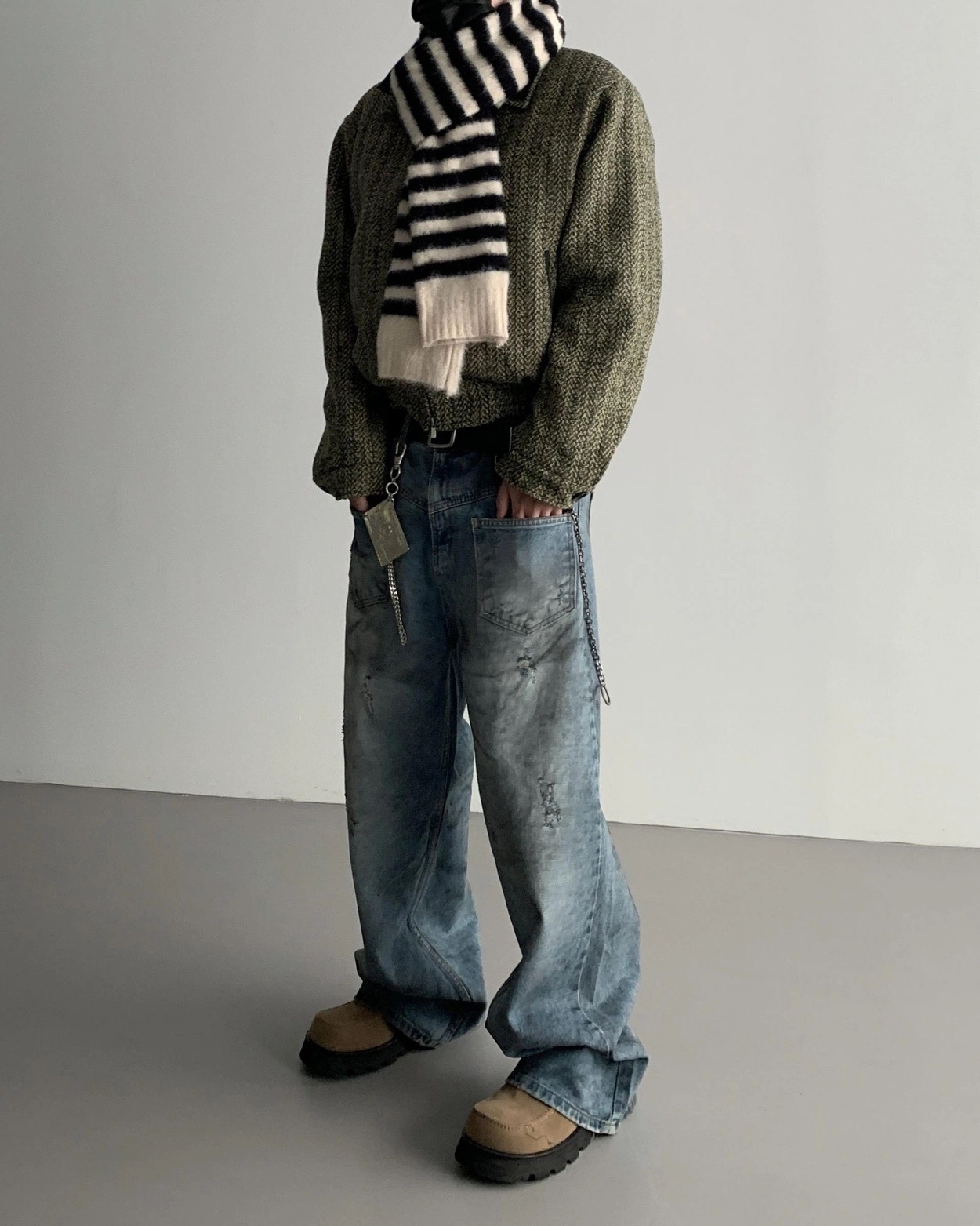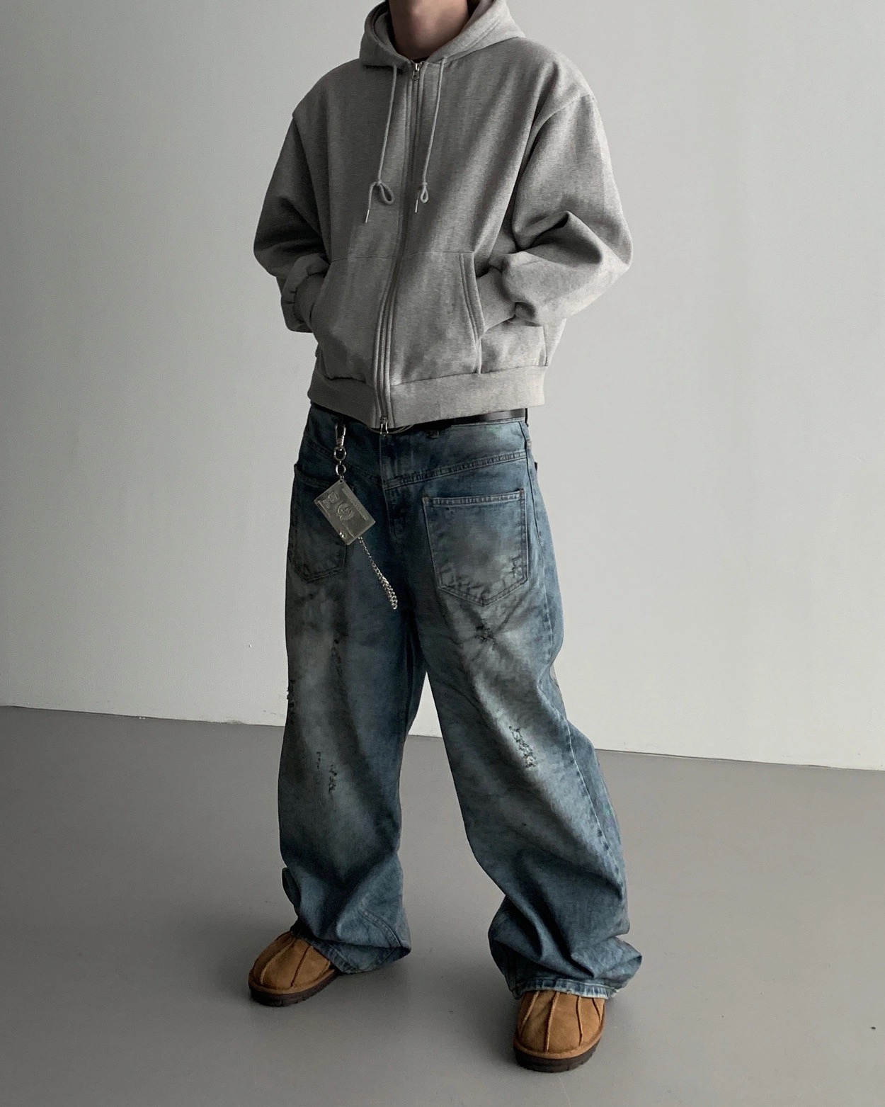 韓國 口袋 翻轉 髒汙 水洗 寬版 牛仔褲