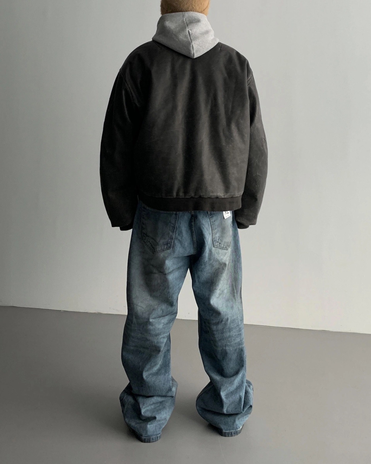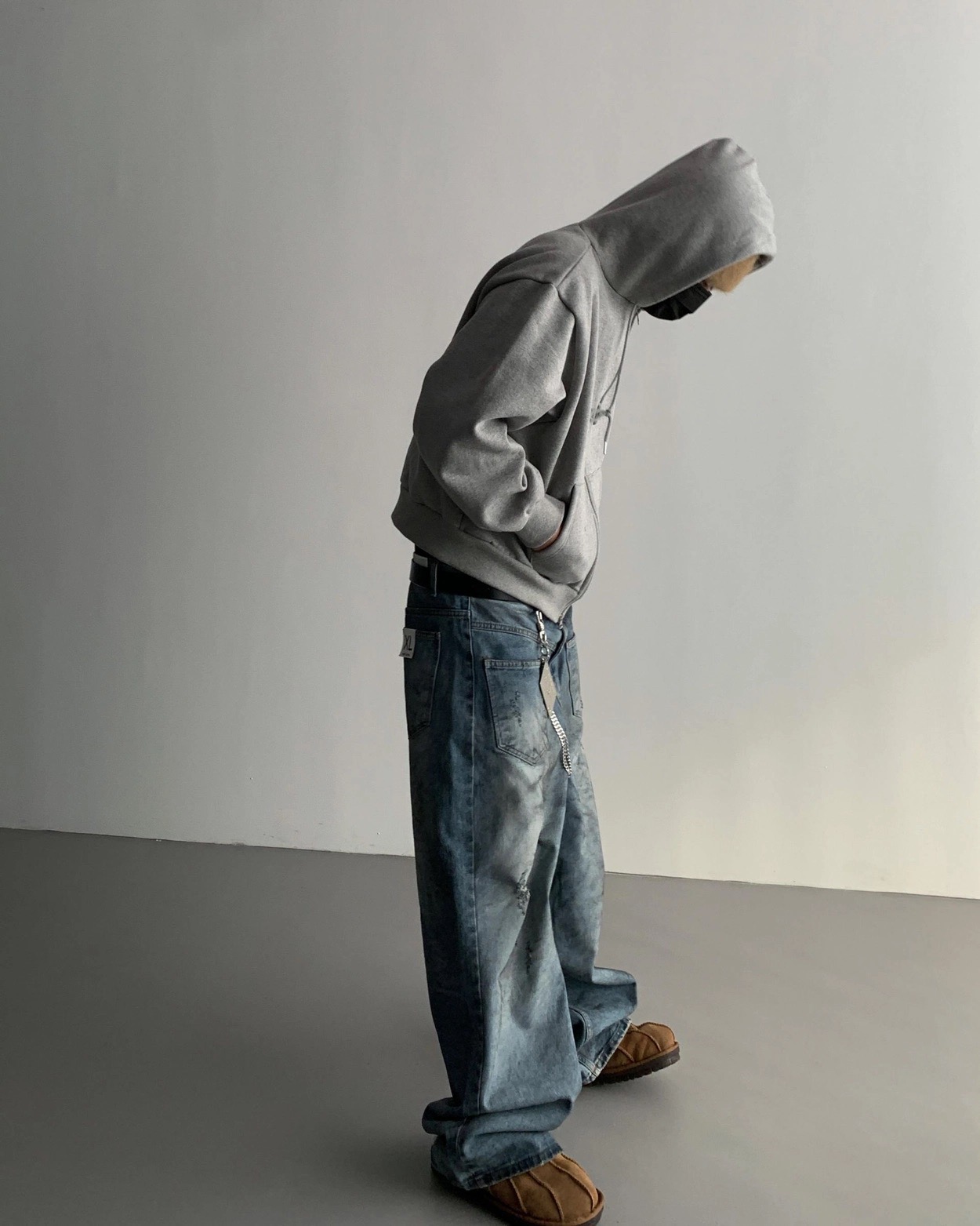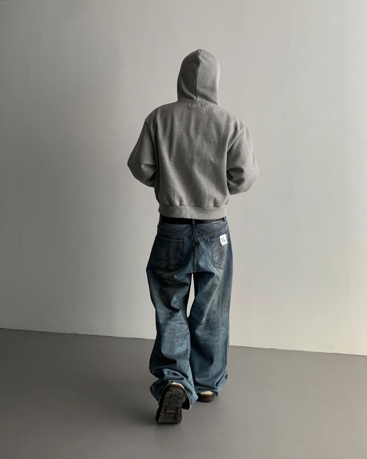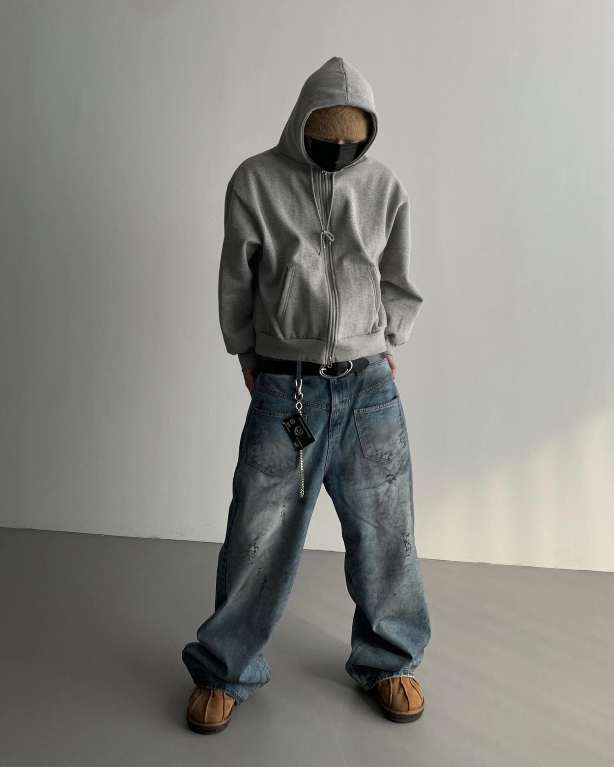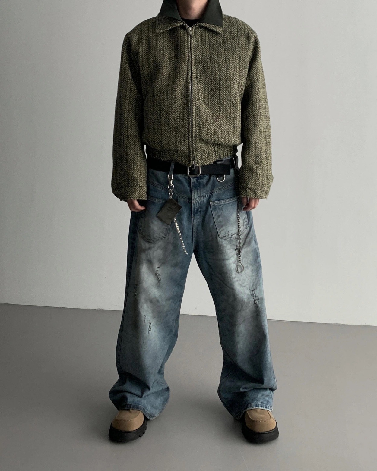 韓國 口袋 翻轉 髒汙 水洗 寬版 牛仔褲