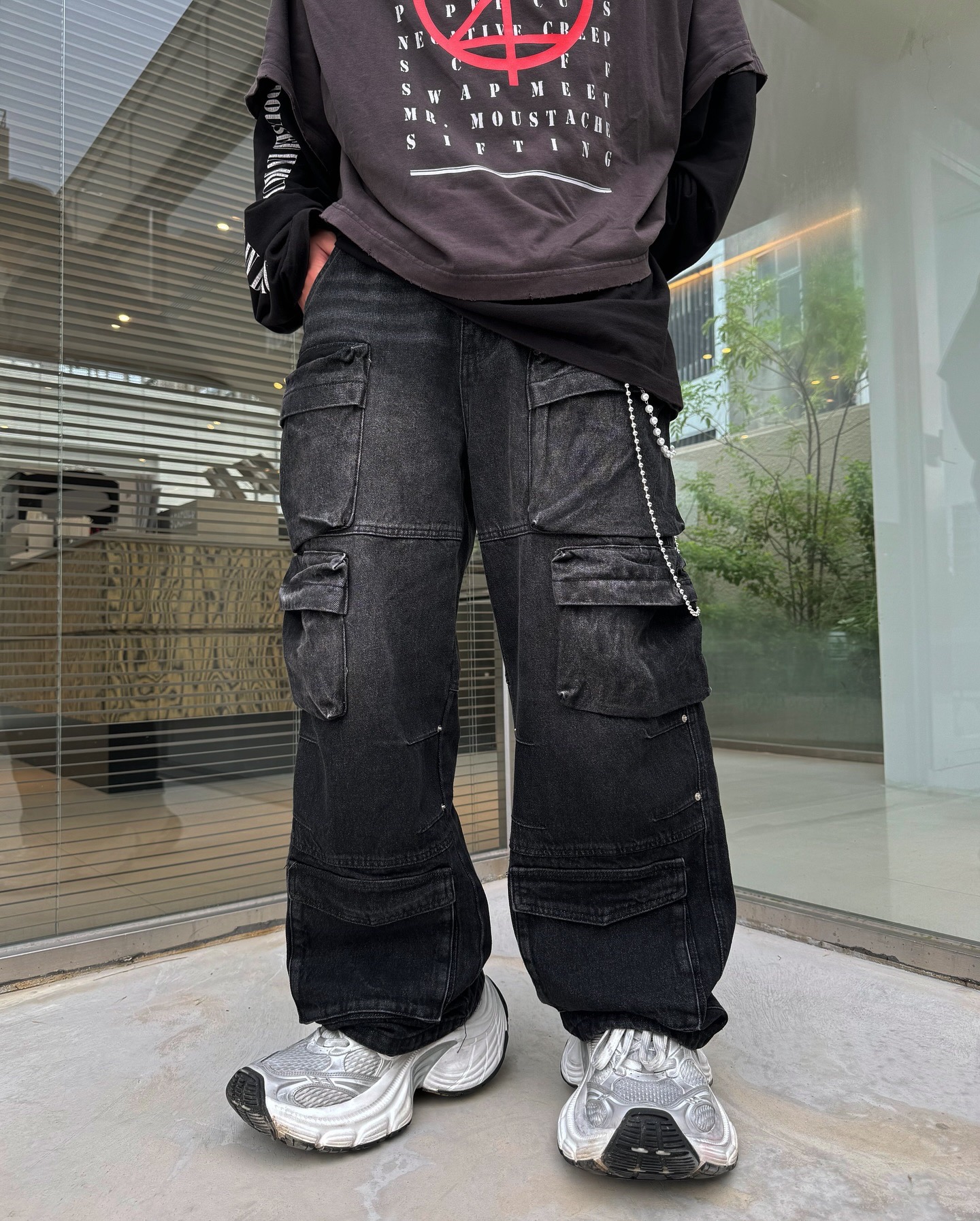 韓國 砲彈 多口袋 水洗 做舊感 重磅 黑牛仔褲 工作褲