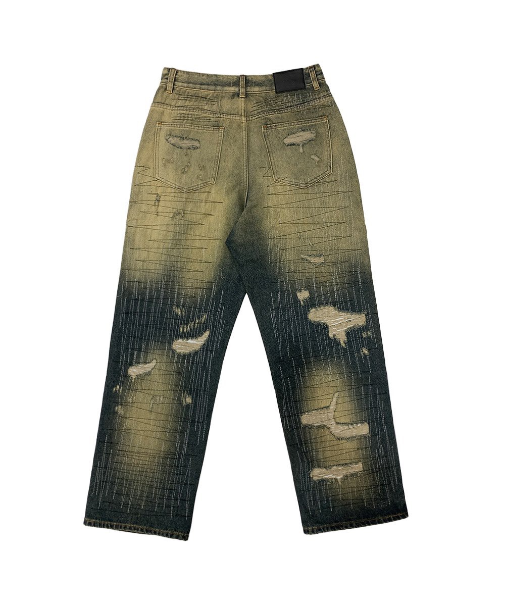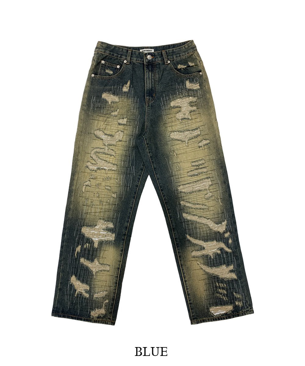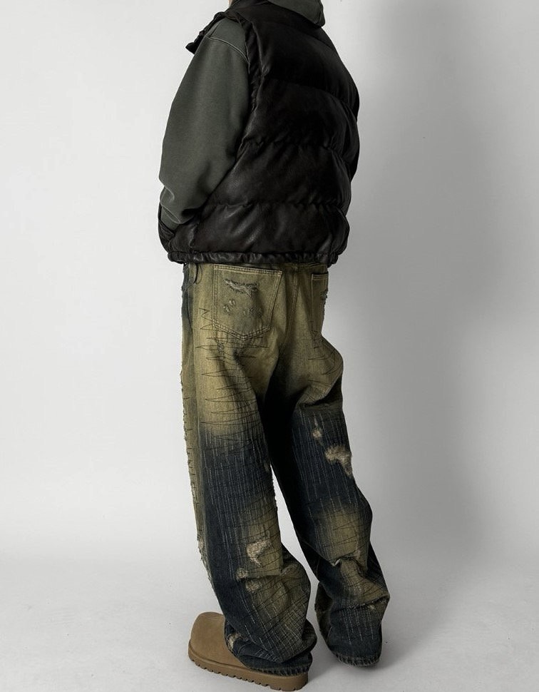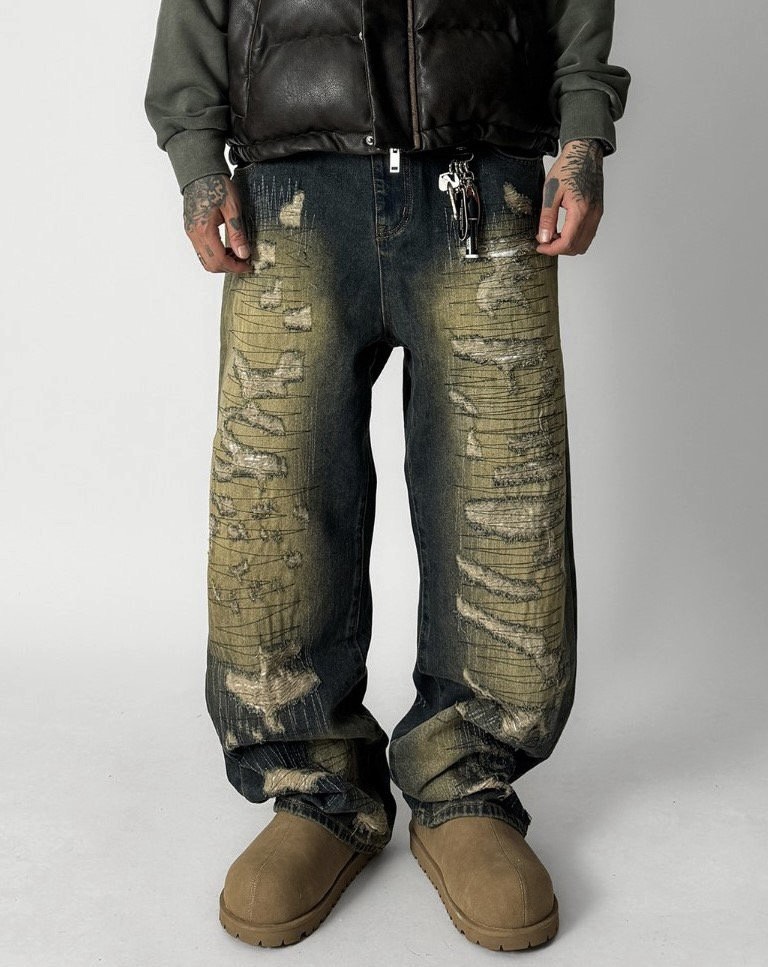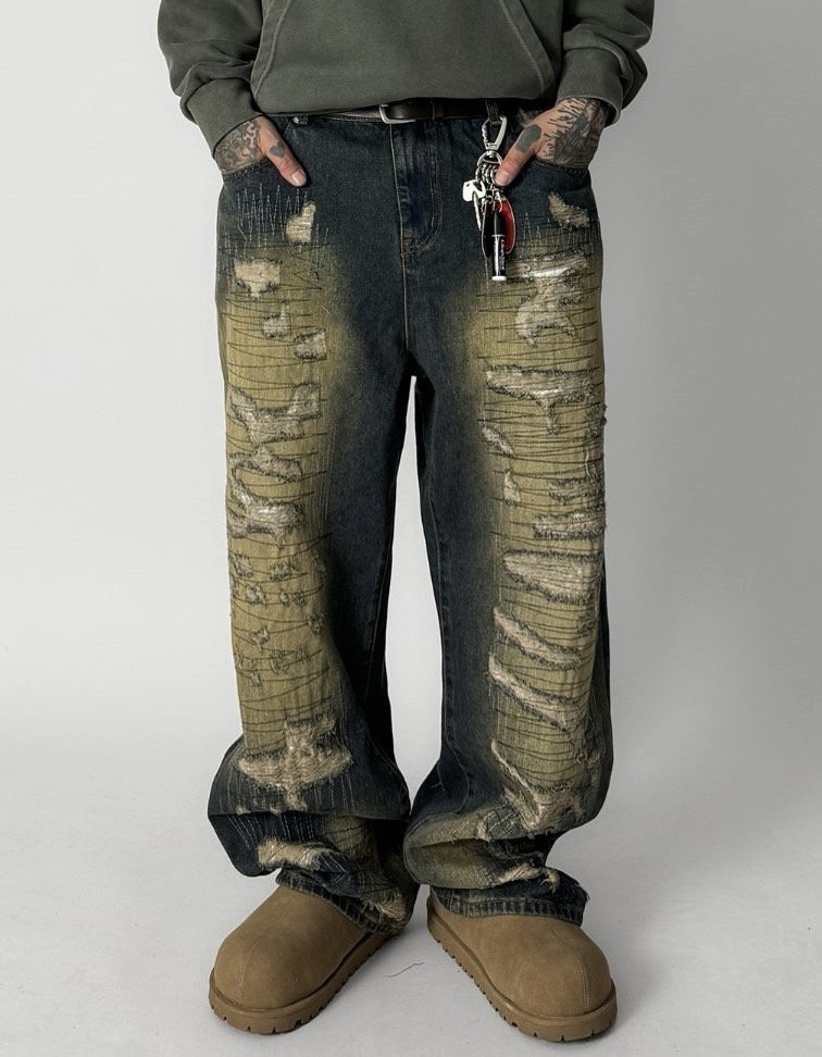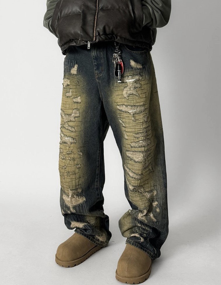 韓國 伐木工 泥汙 多層次 割線 破壞 水洗 寬版 牛仔褲