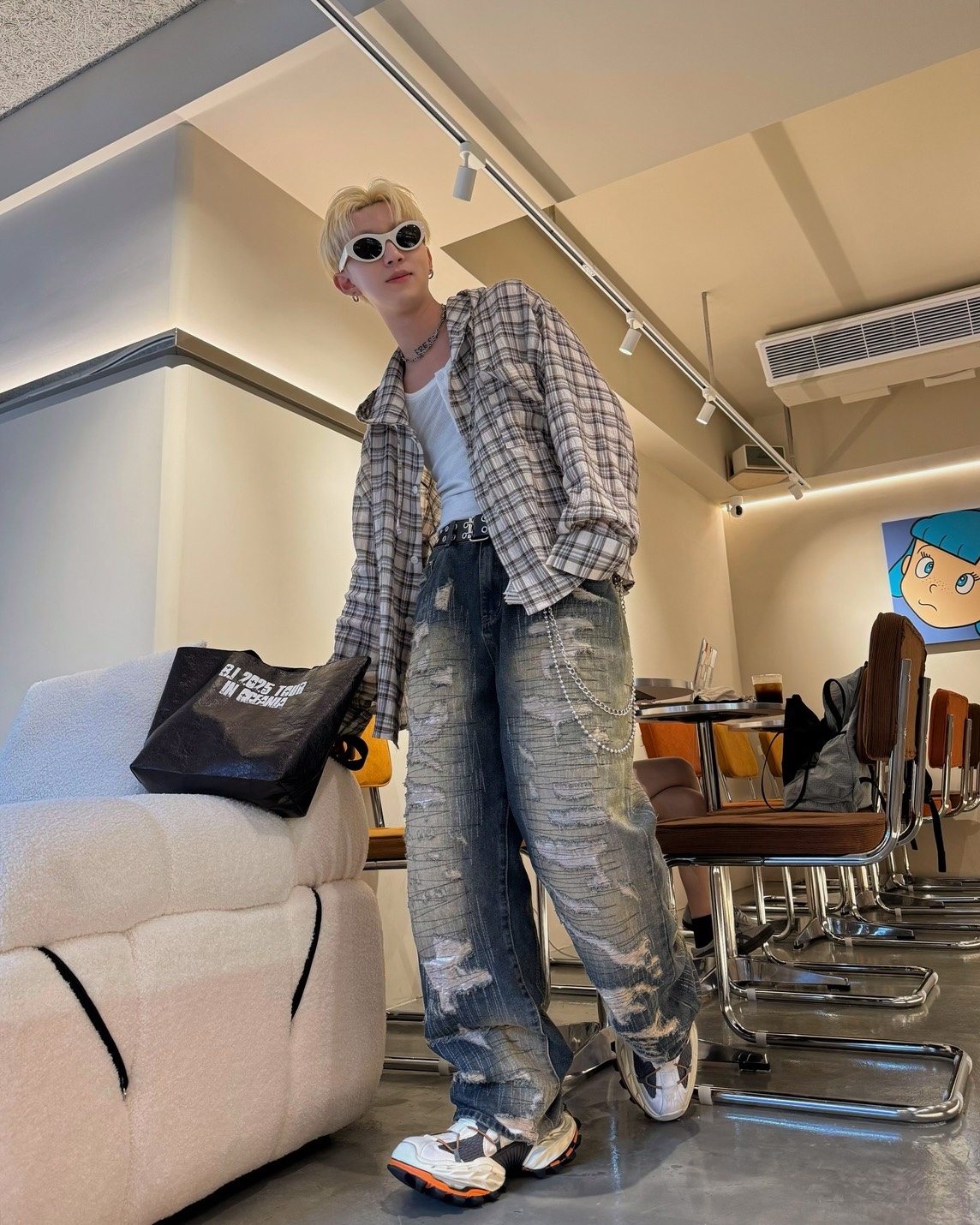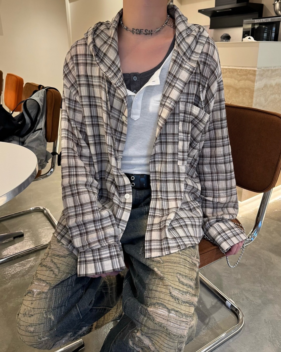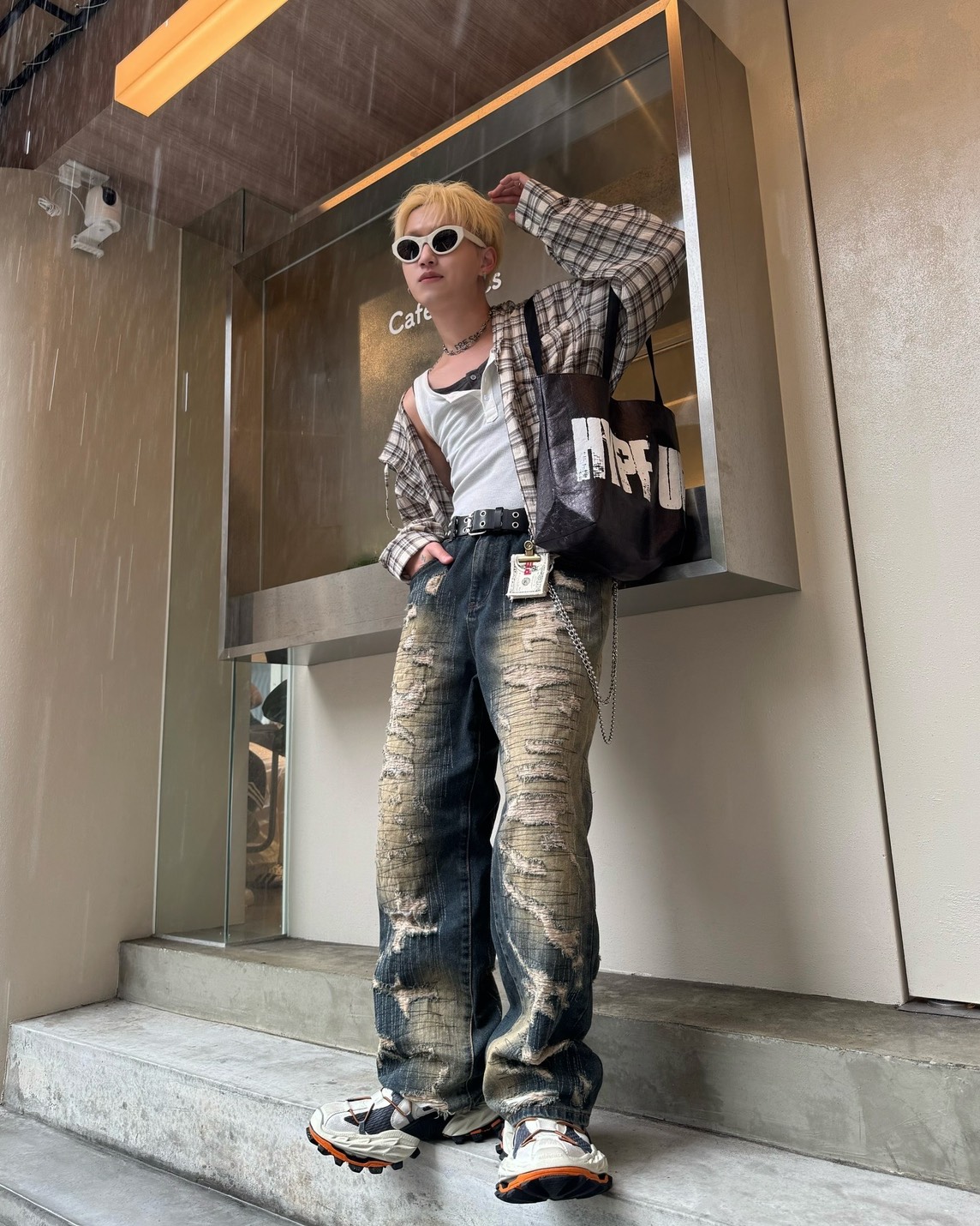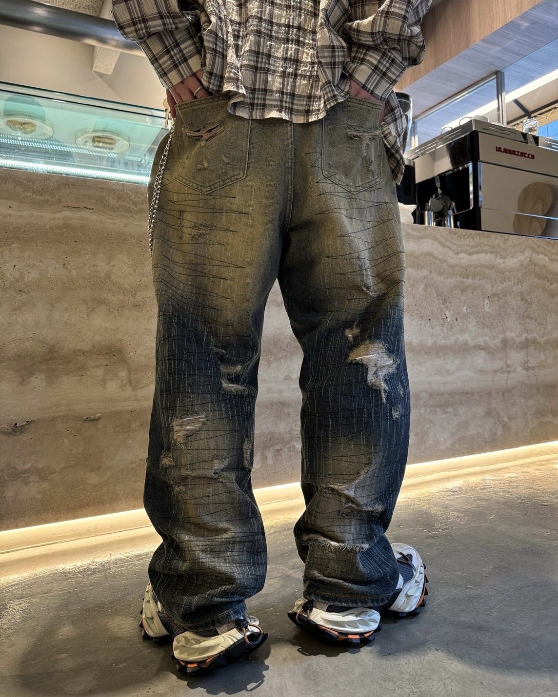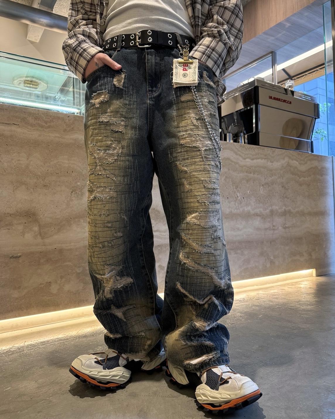 韓國 伐木工 泥汙 多層次 割線 破壞 水洗 寬版 牛仔褲