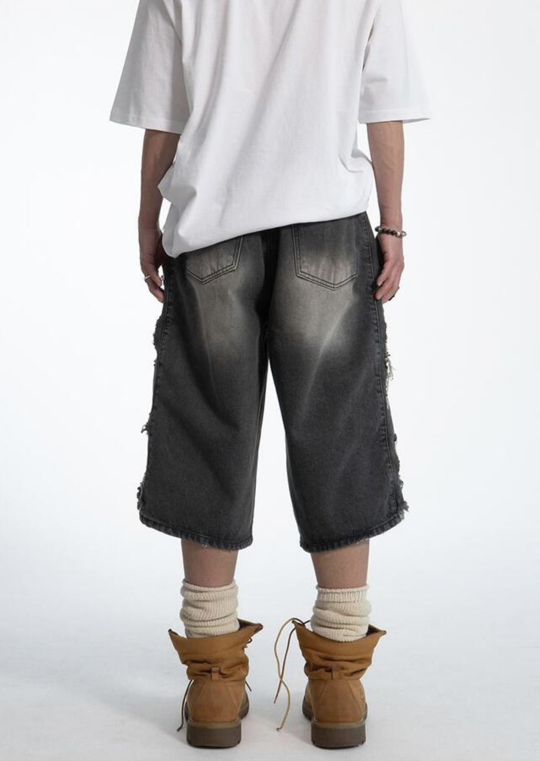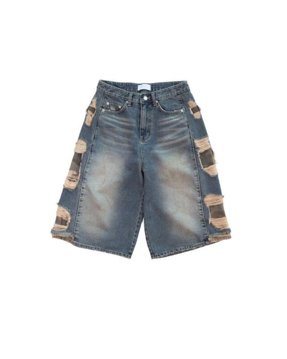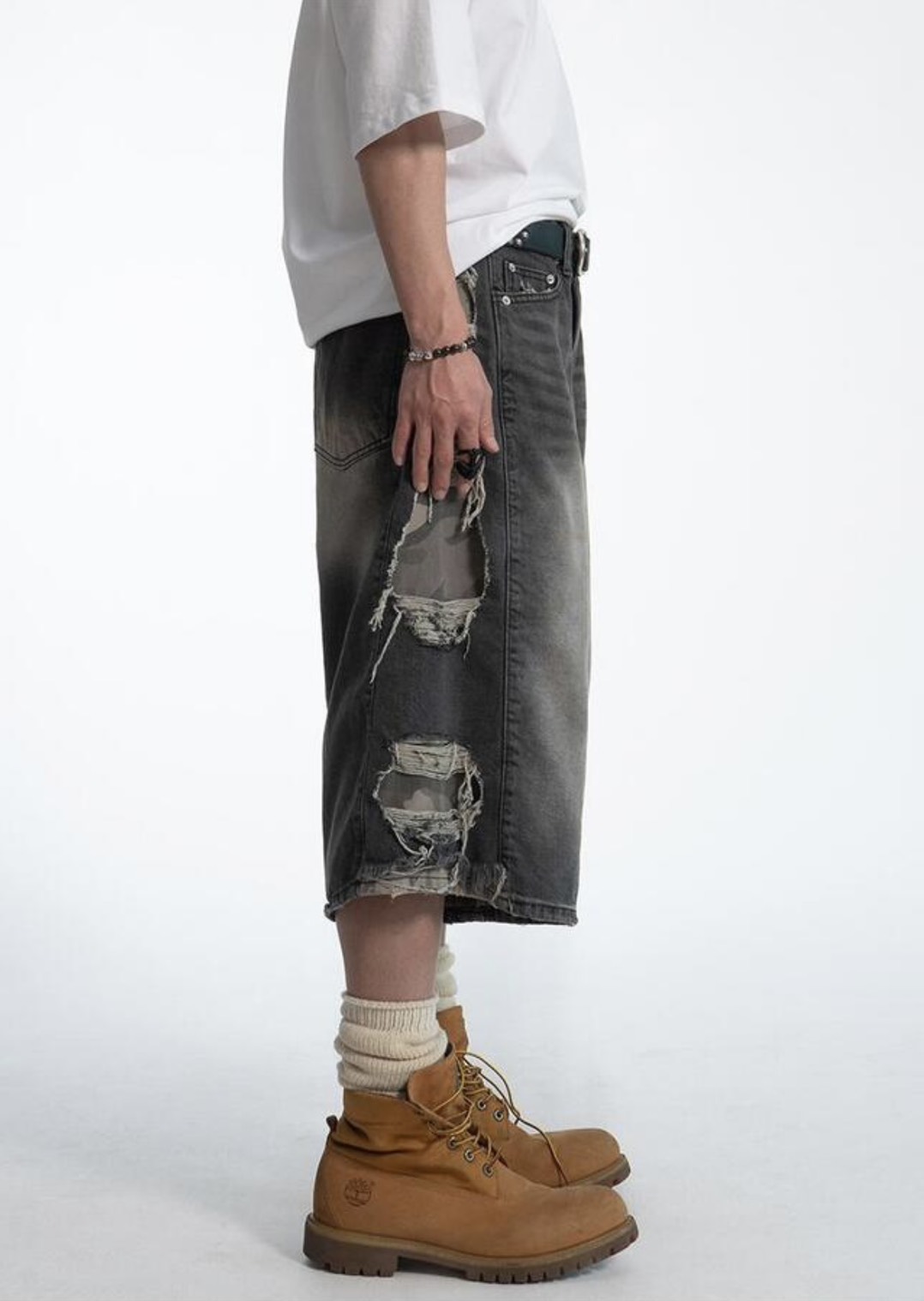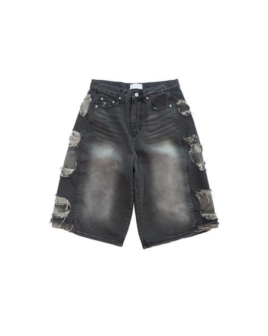 (新款短褲版本!) 韓國 迷彩 側破壞 復古 水洗 膝下 牛仔短褲 (2color)