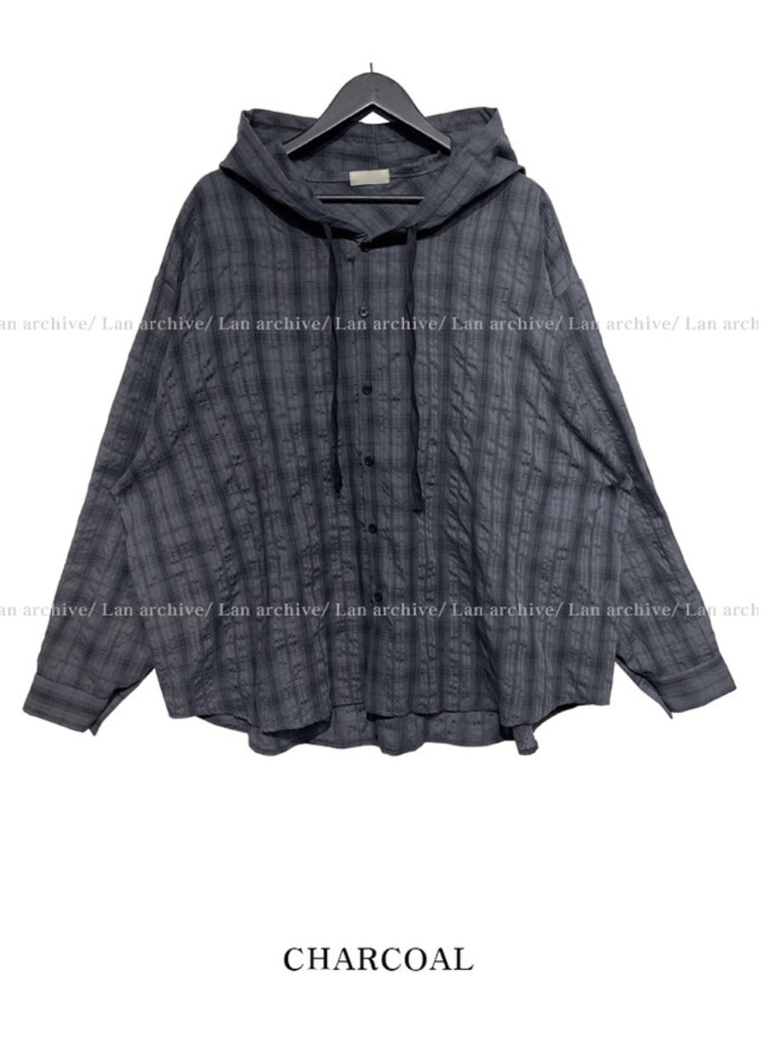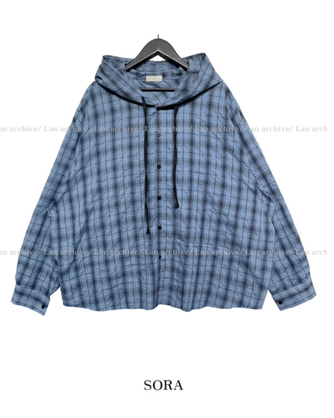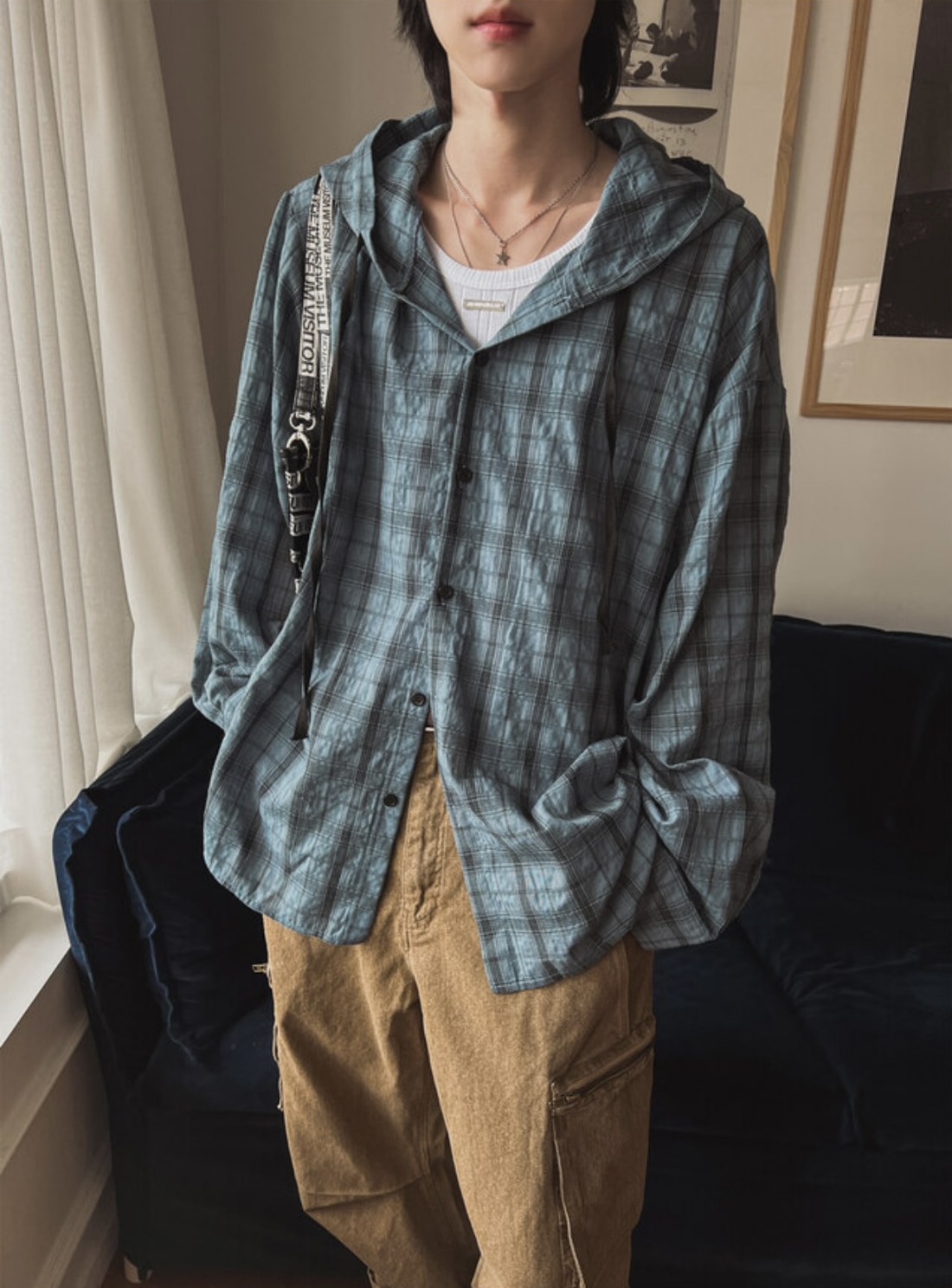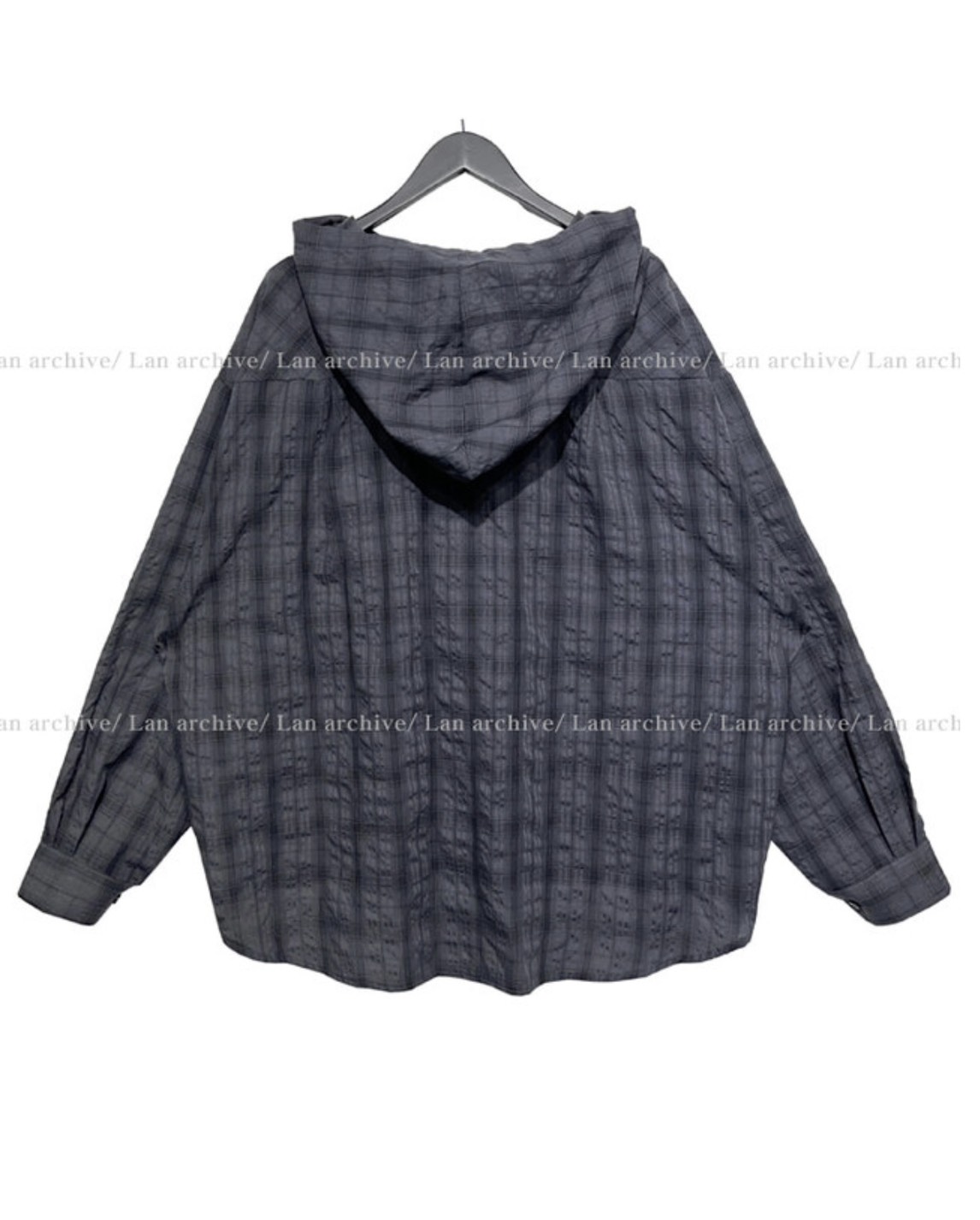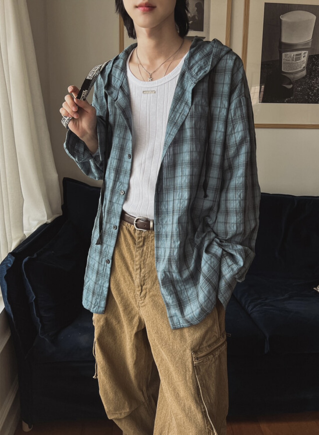 韓國 格紋 做舊感 冰絲 輕薄 防曬 長袖 連帽襯衫 (3color)