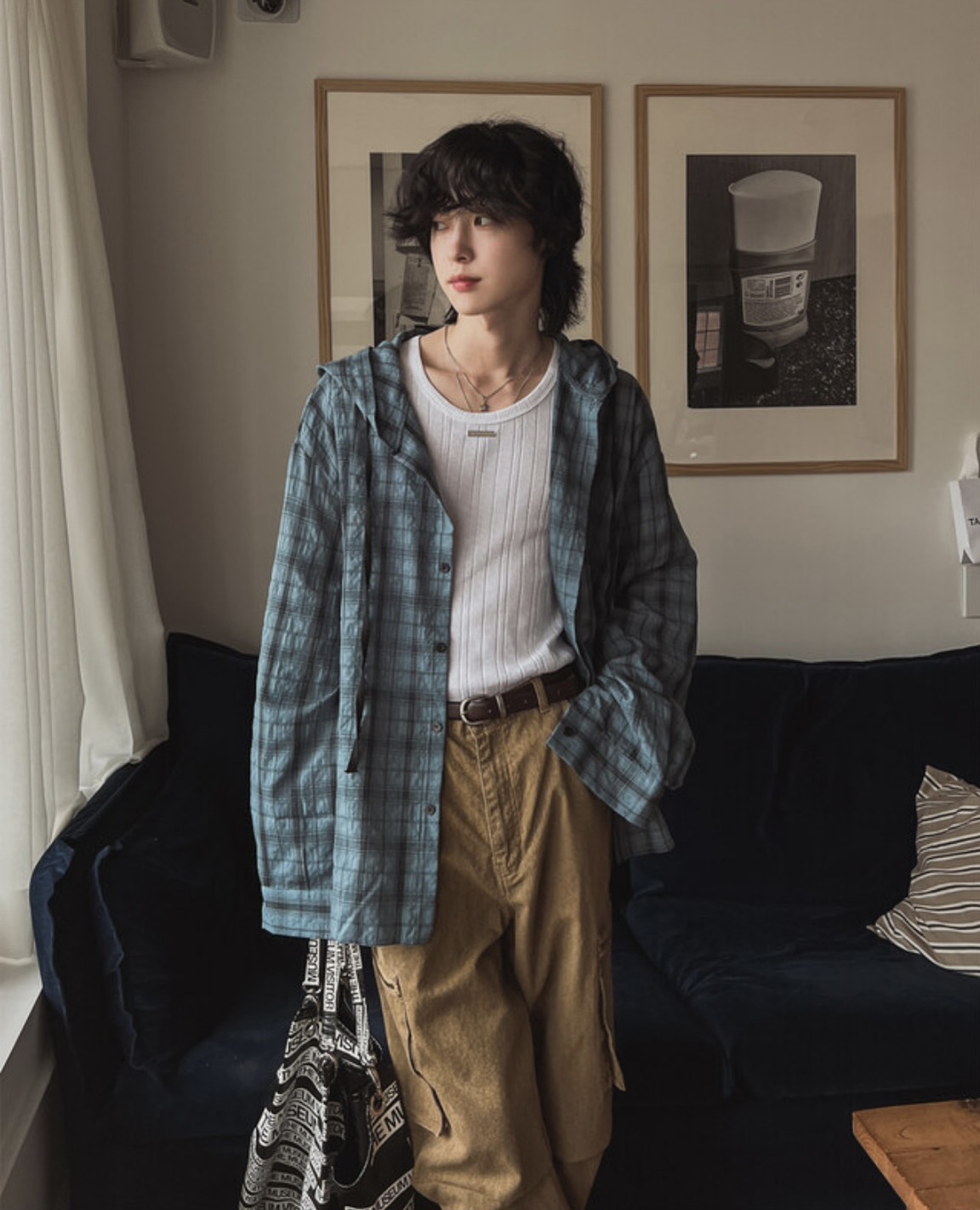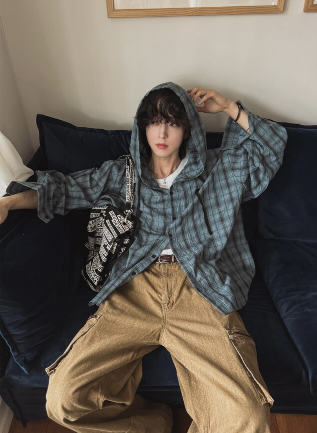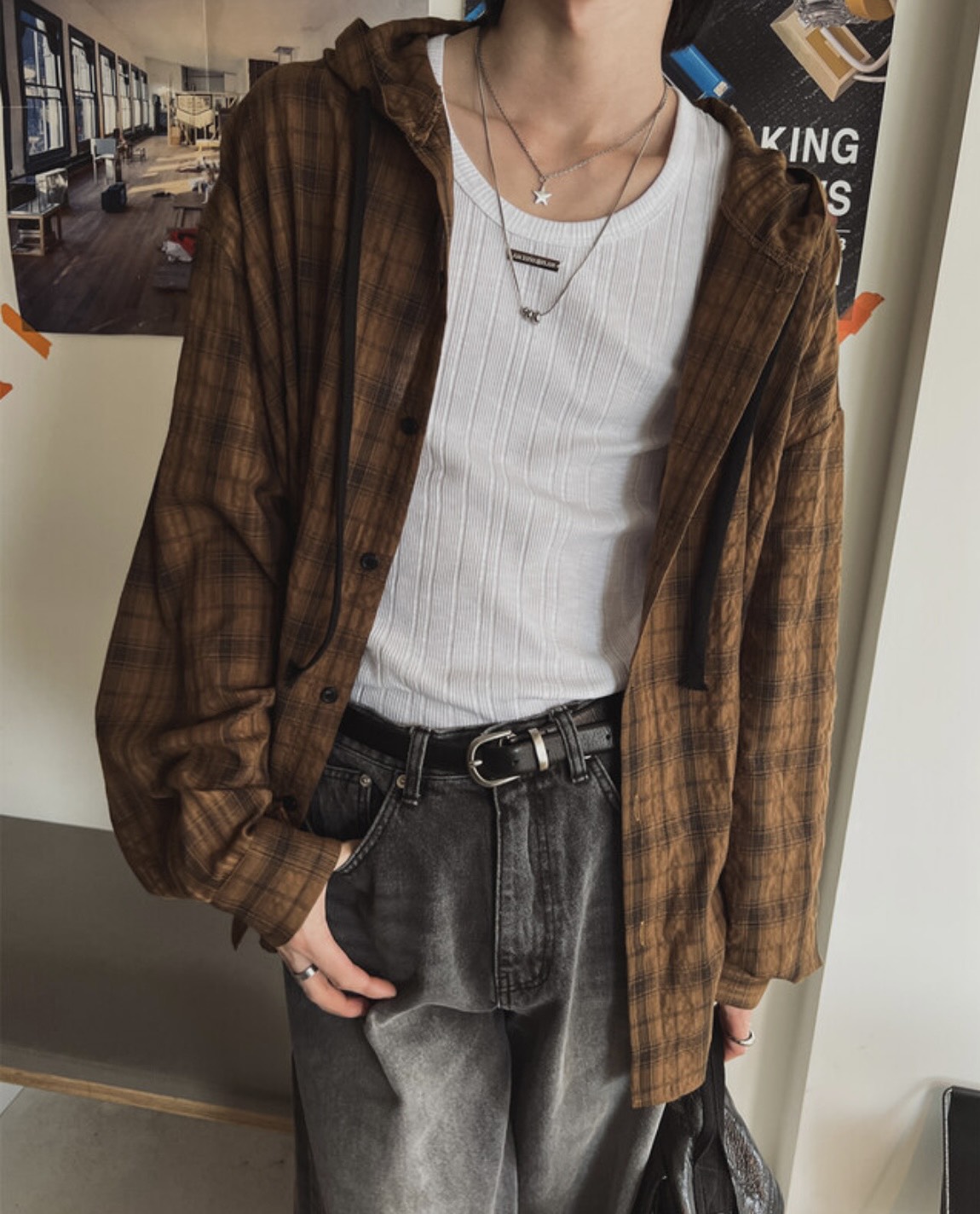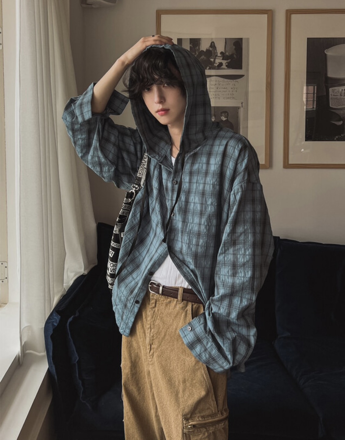 韓國 格紋 做舊感 冰絲 輕薄 防曬 長袖 連帽襯衫 (3color)