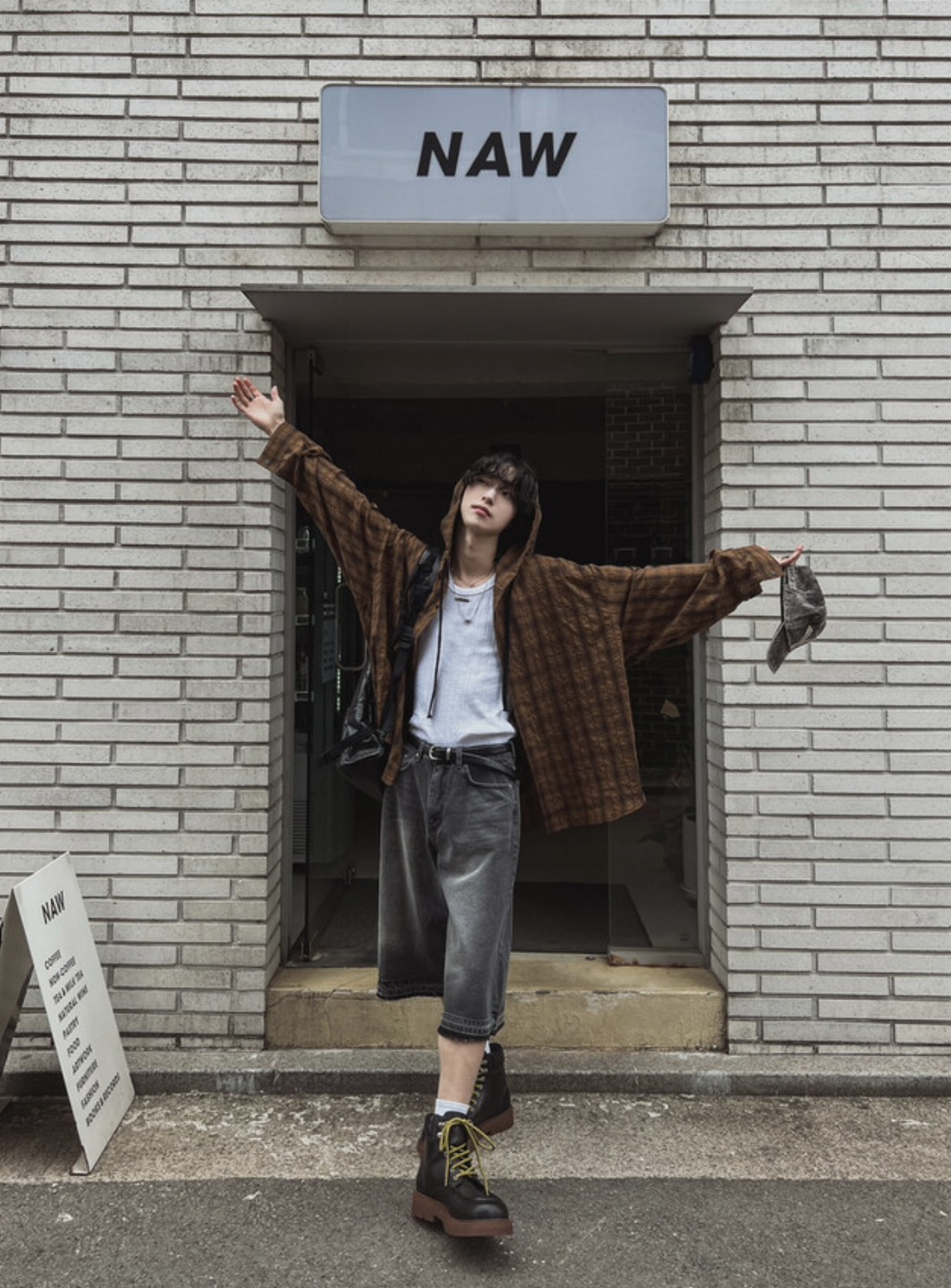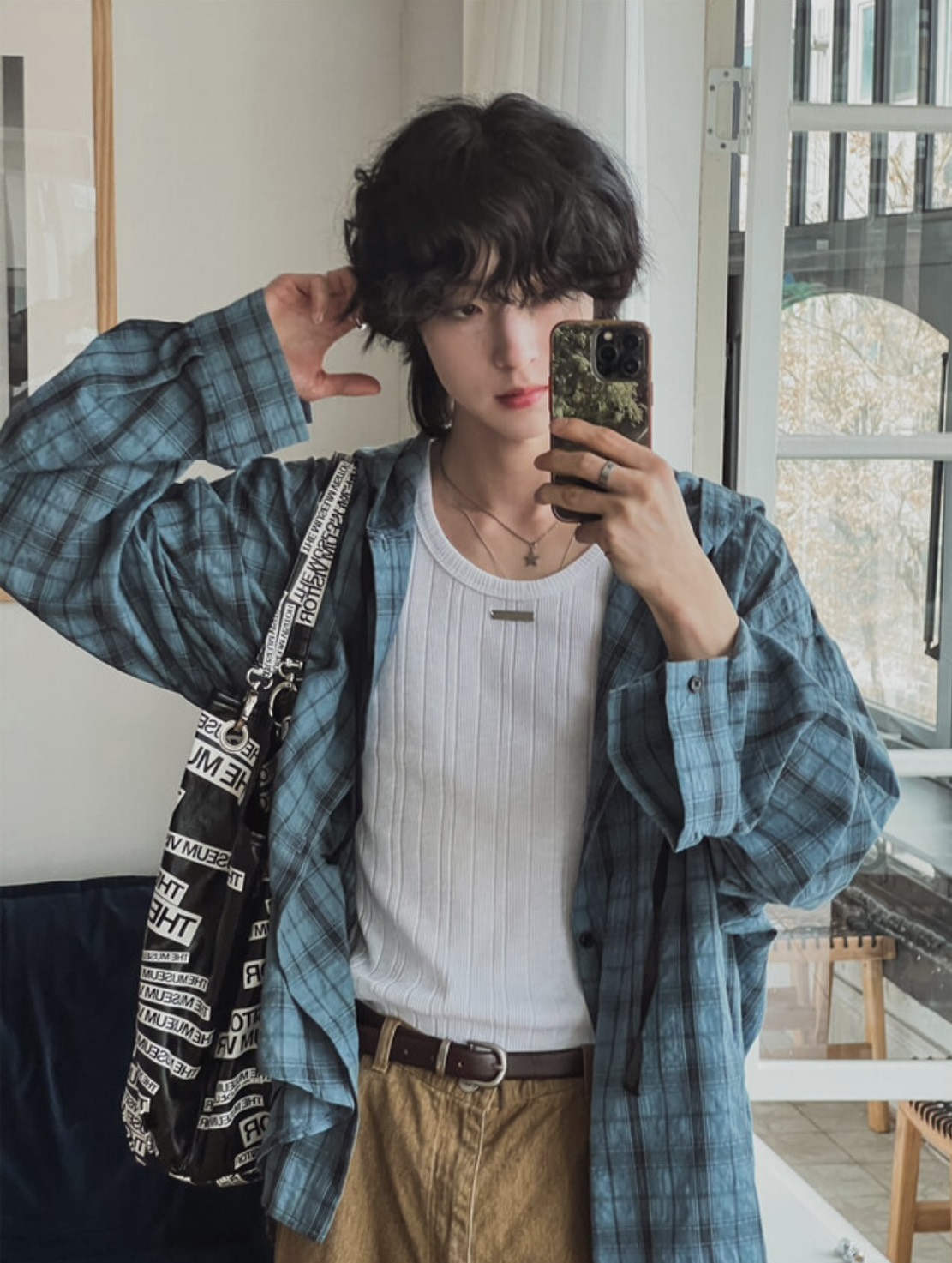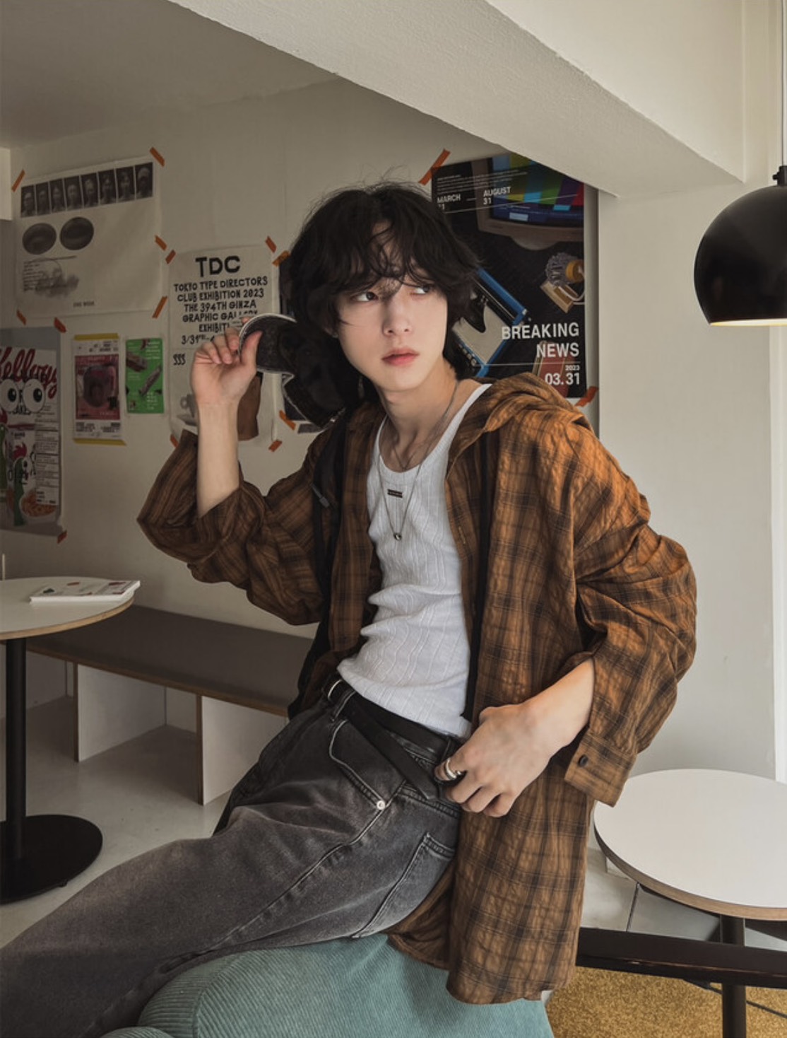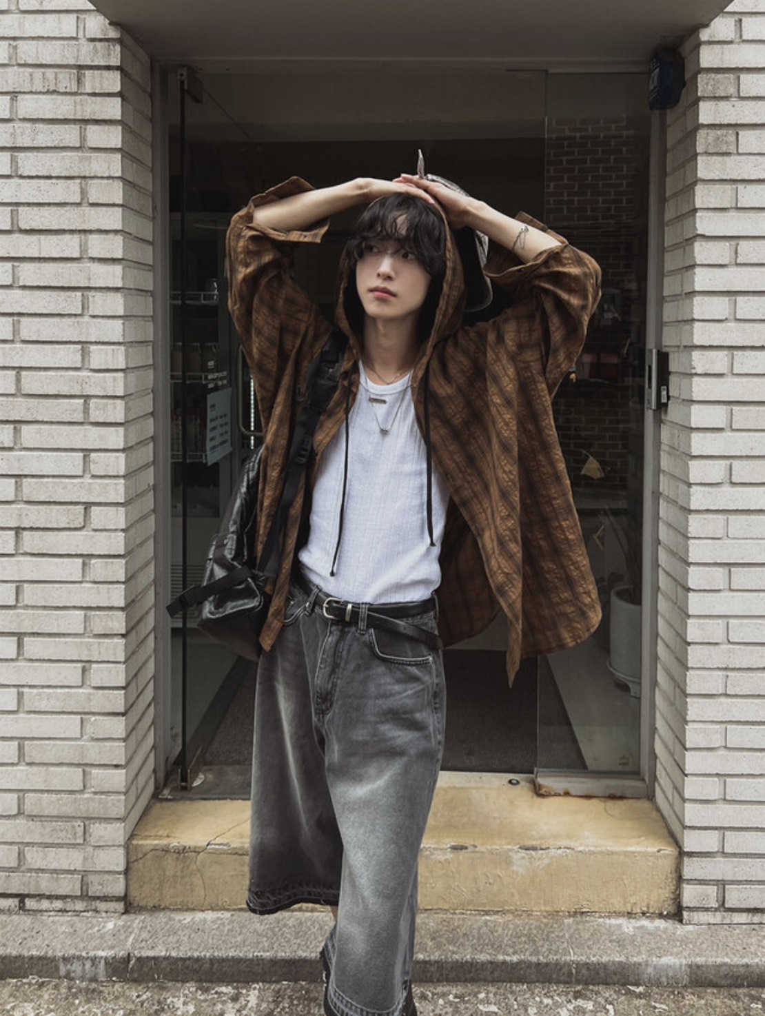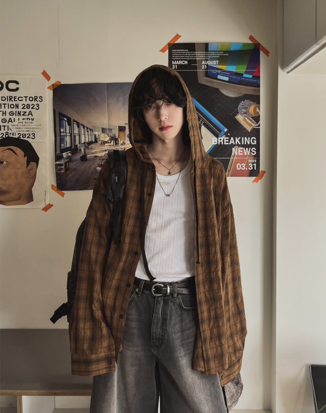 韓國 格紋 做舊感 冰絲 輕薄 防曬 長袖 連帽襯衫 (3color)