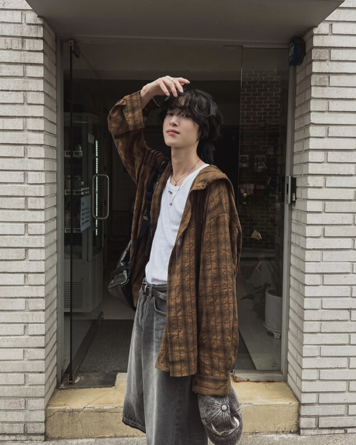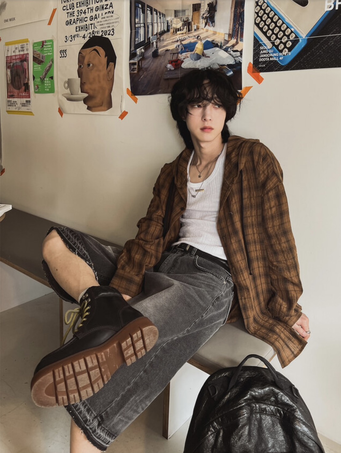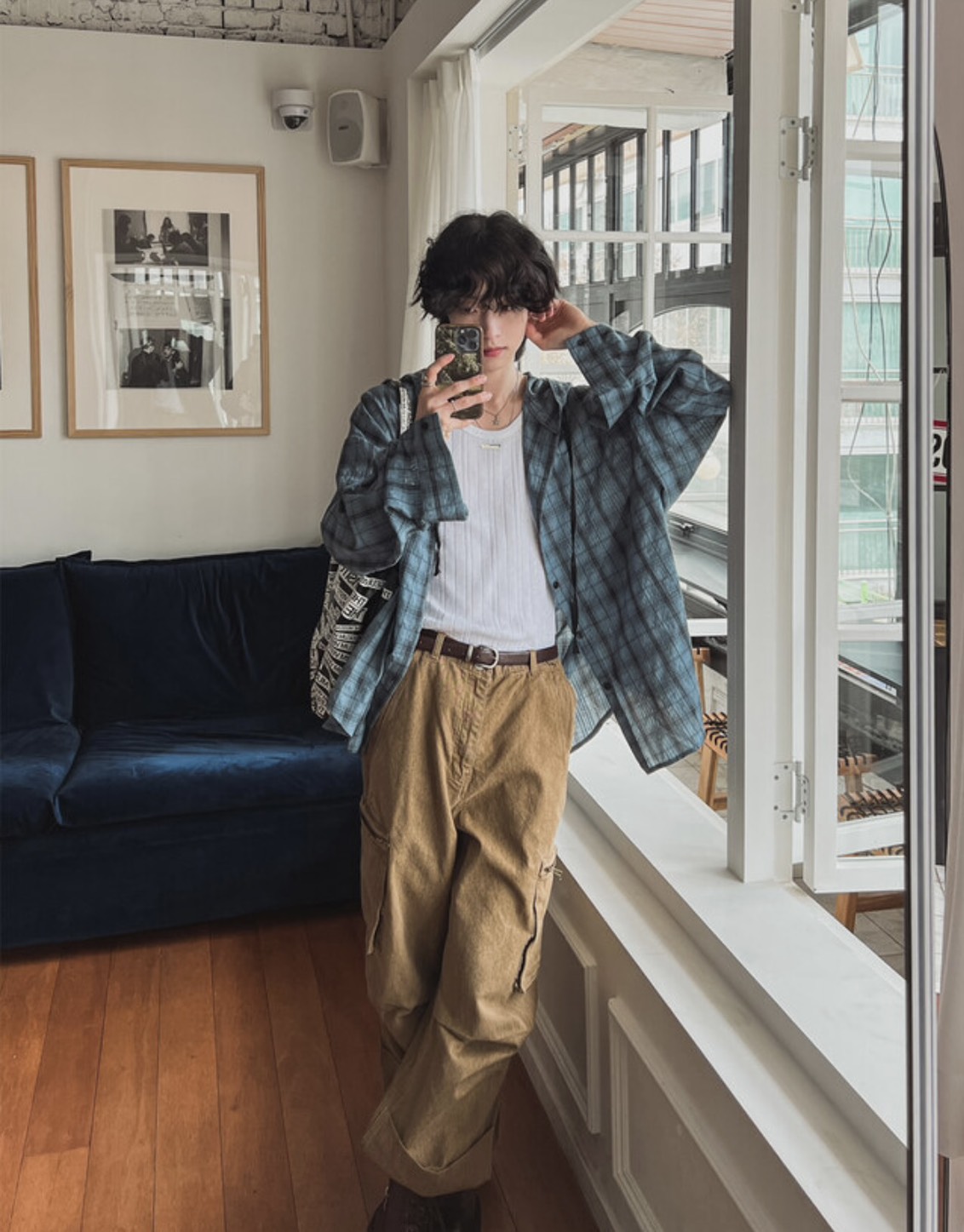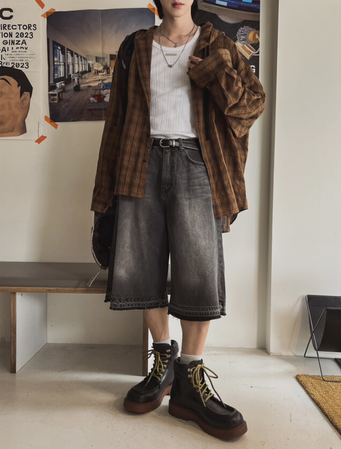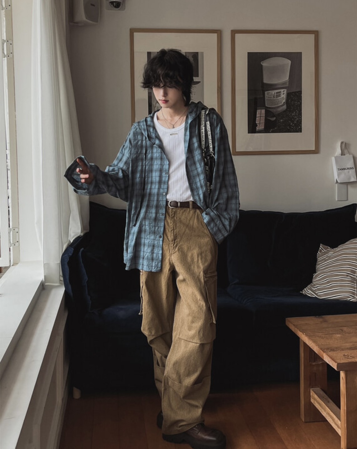 韓國 格紋 做舊感 冰絲 輕薄 防曬 長袖 連帽襯衫 (3color)