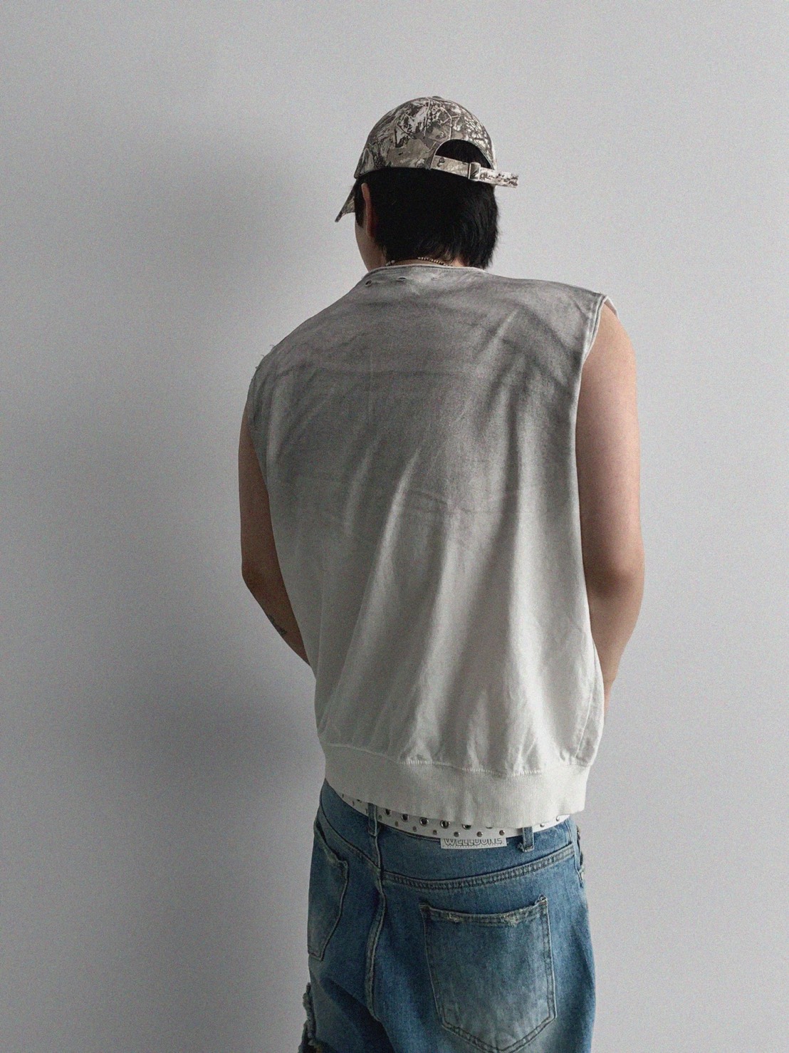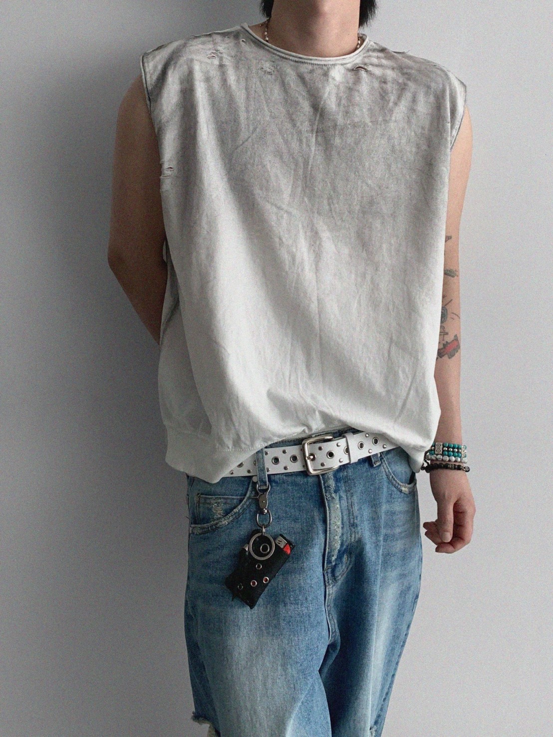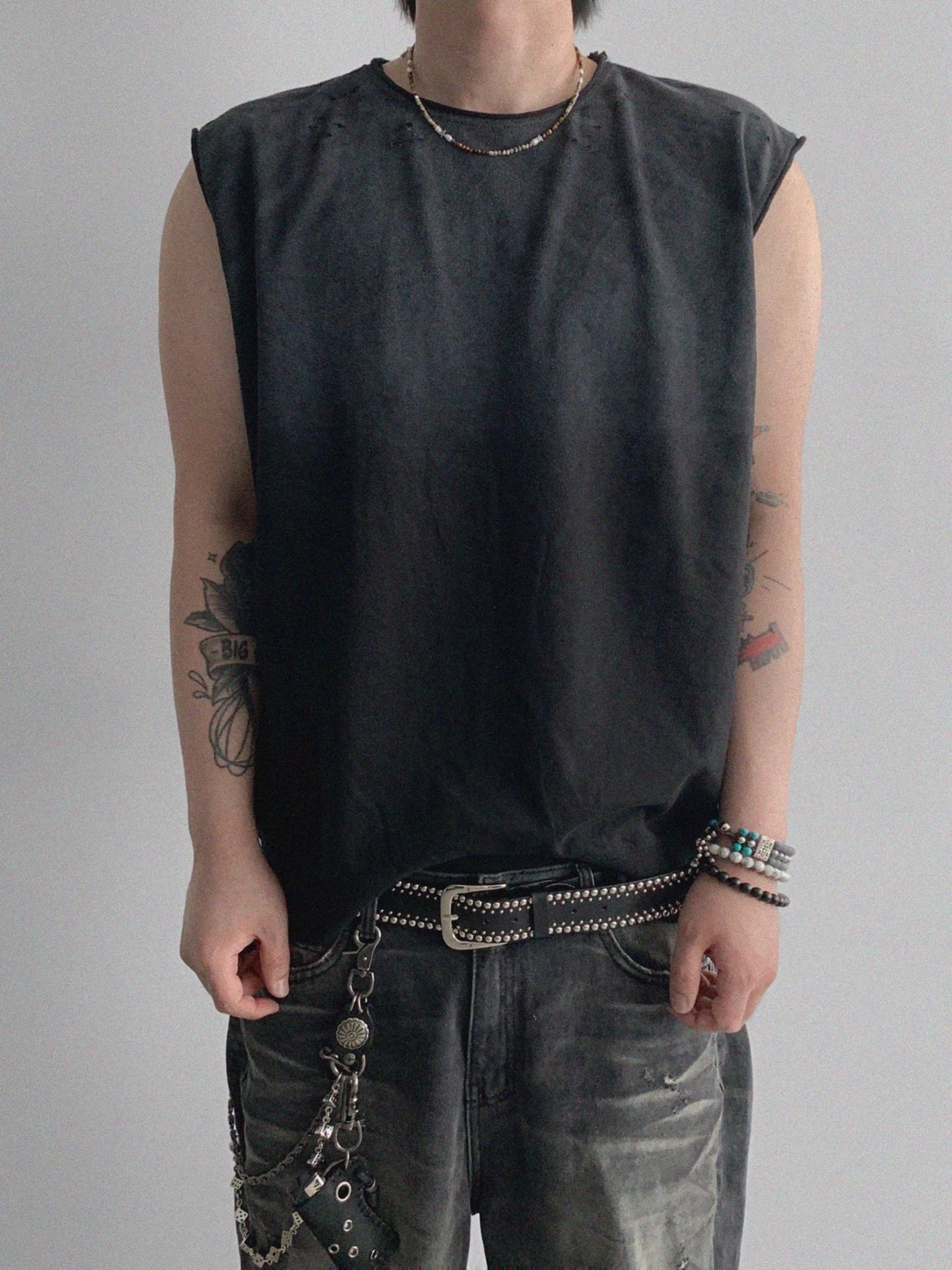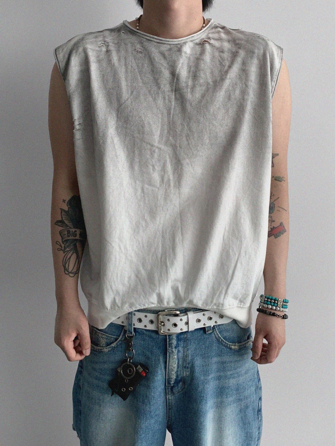 韓國 水洗 做舊 褪色感 寬肩 無袖 背心 上衣 (2color)