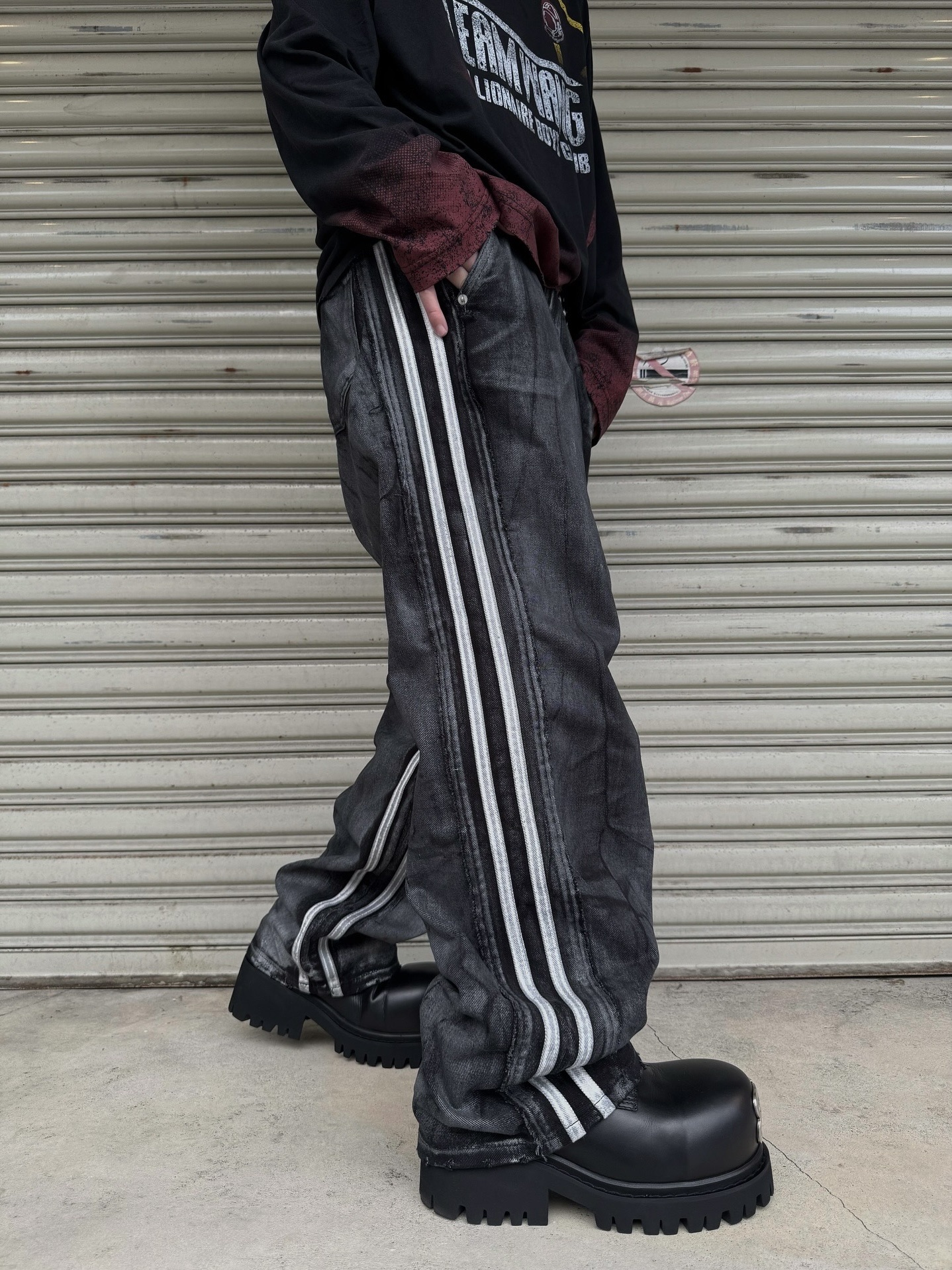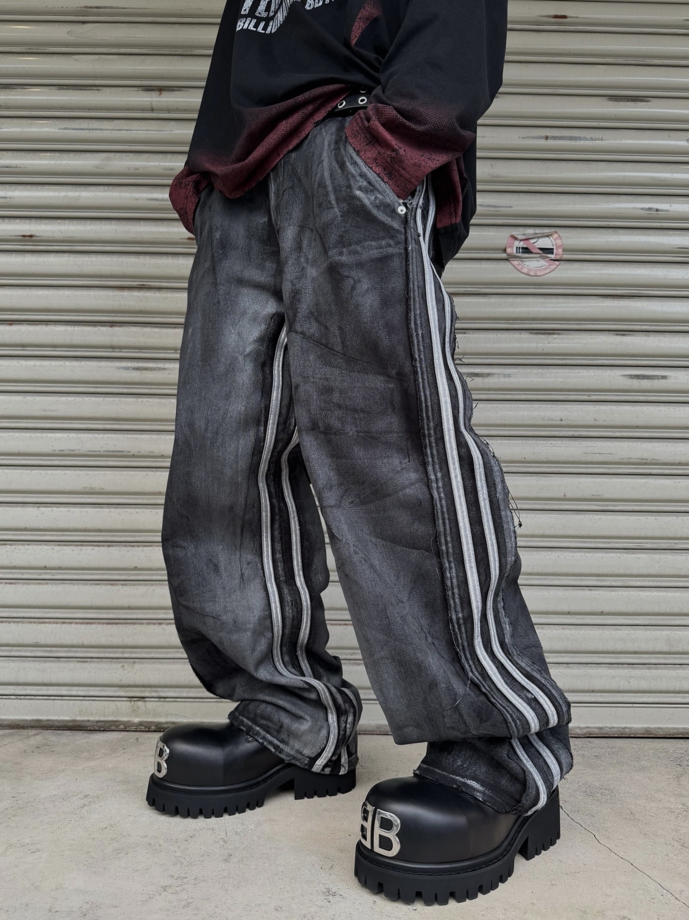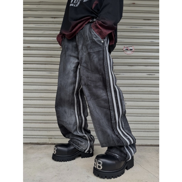 韓國 雙線條 金屬 做舊感 上漿 刷漆 褪色 寬版 長褲 (2color)