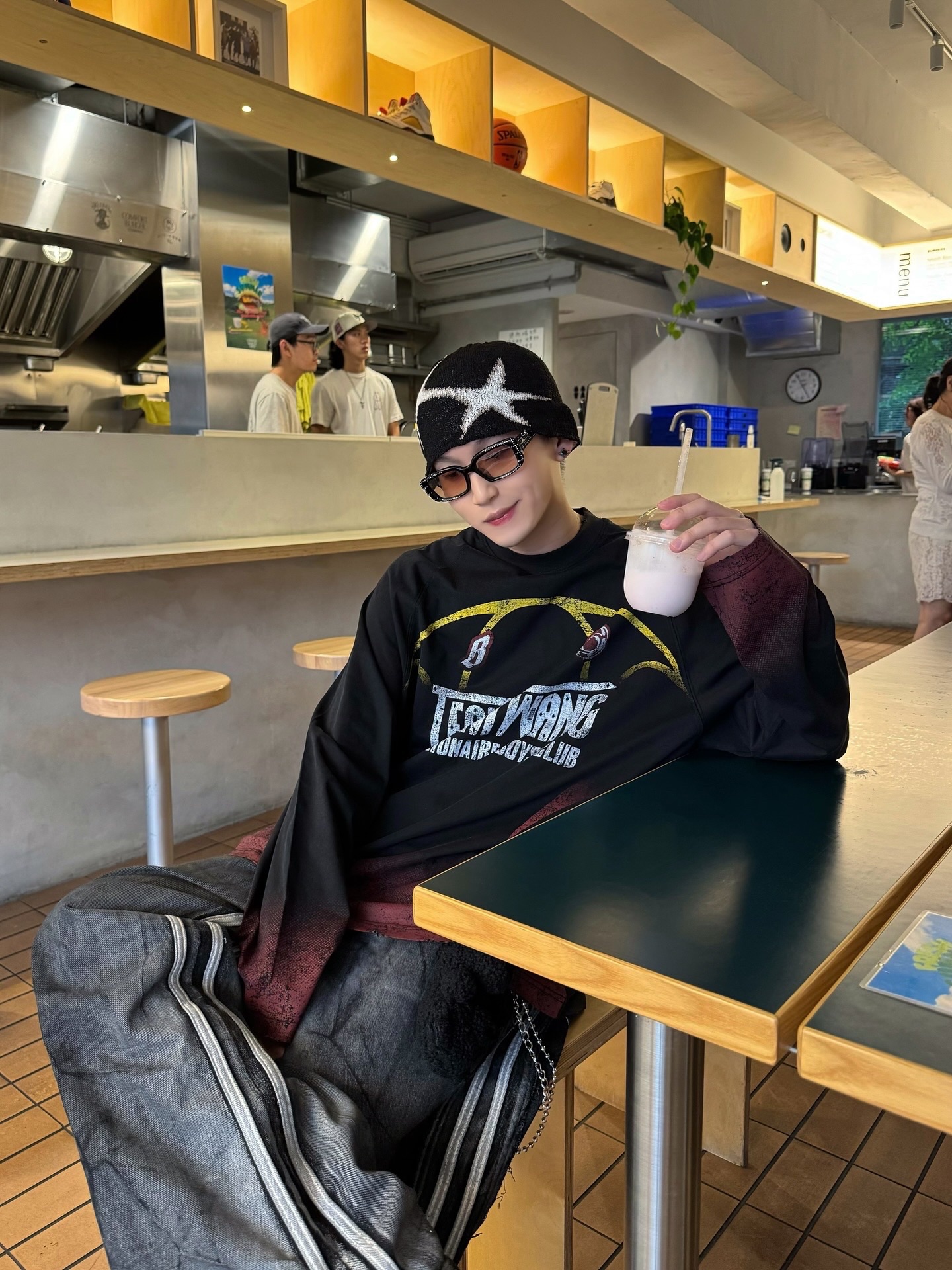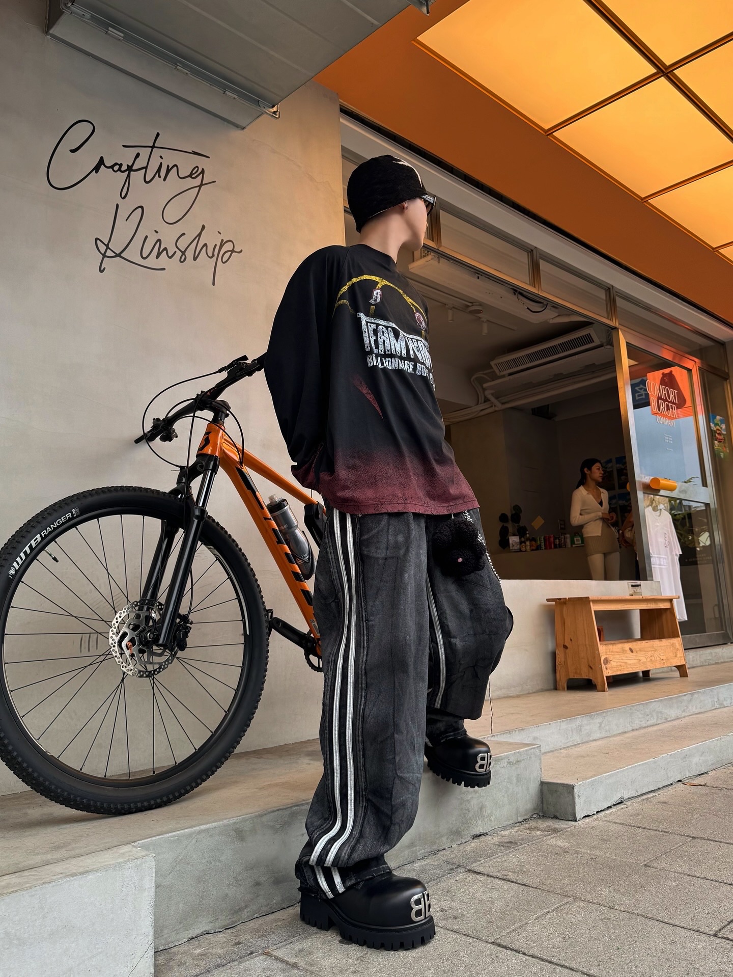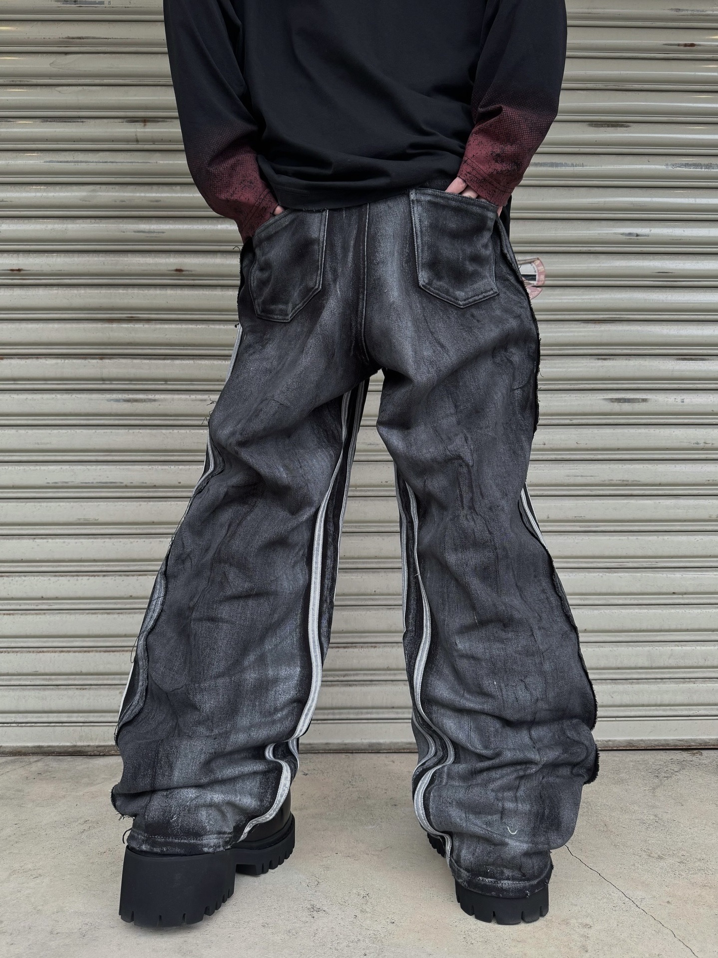 韓國 雙線條 金屬 做舊感 上漿 刷漆 褪色 寬版 長褲 (2color)