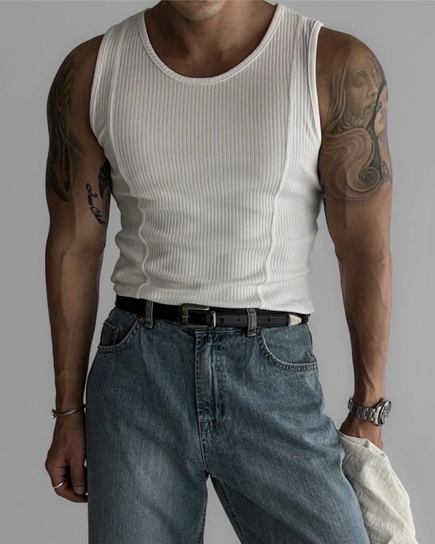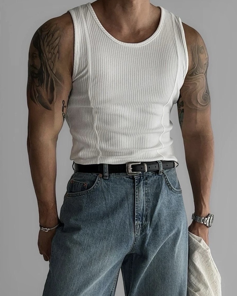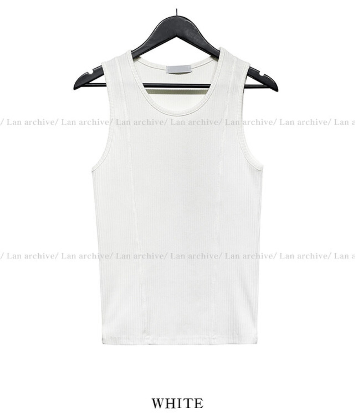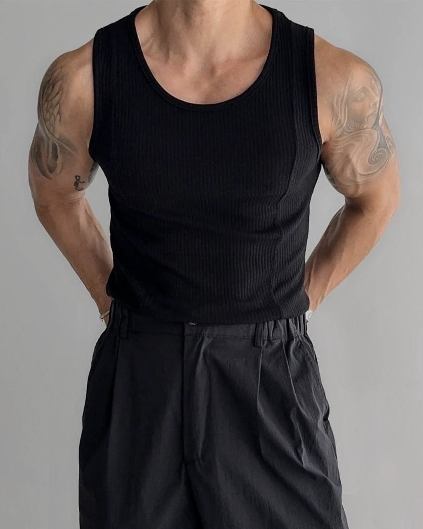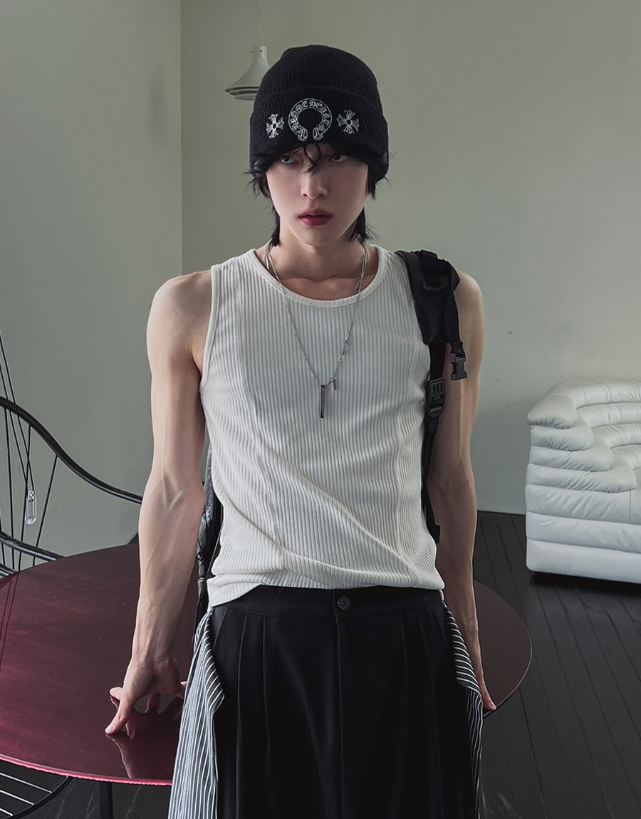 韓國 雙弧線 螺紋 拼接 坑條 剪裁 貼身 背心 (2color)