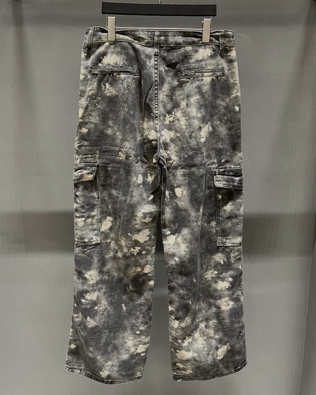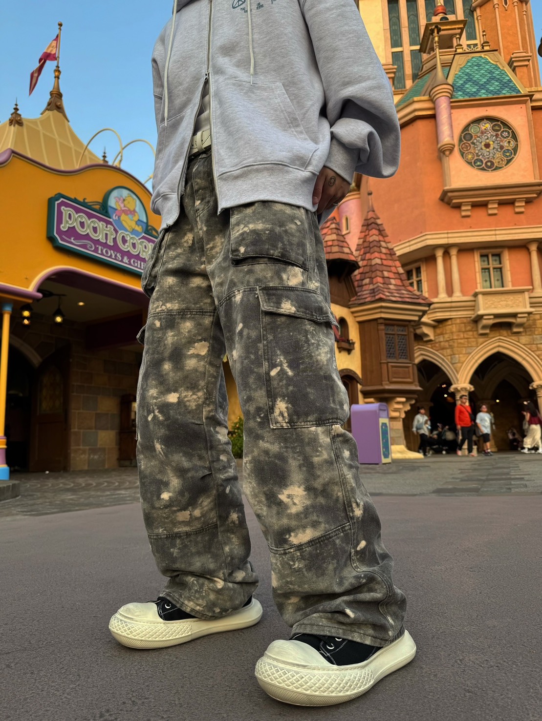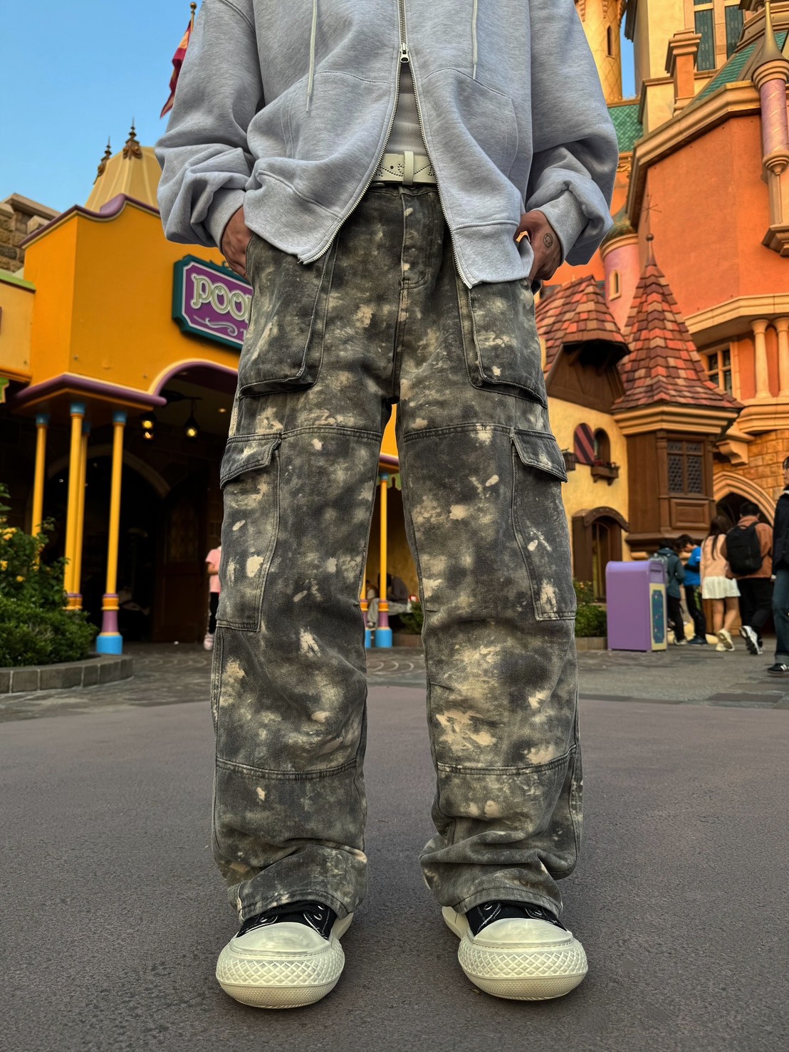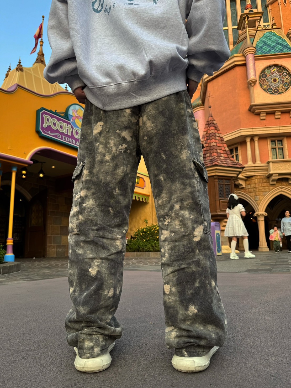 韓國 迪士尼 雪花 潑墨 渲染 多口袋 小直筒 工作褲 Cargo Pants