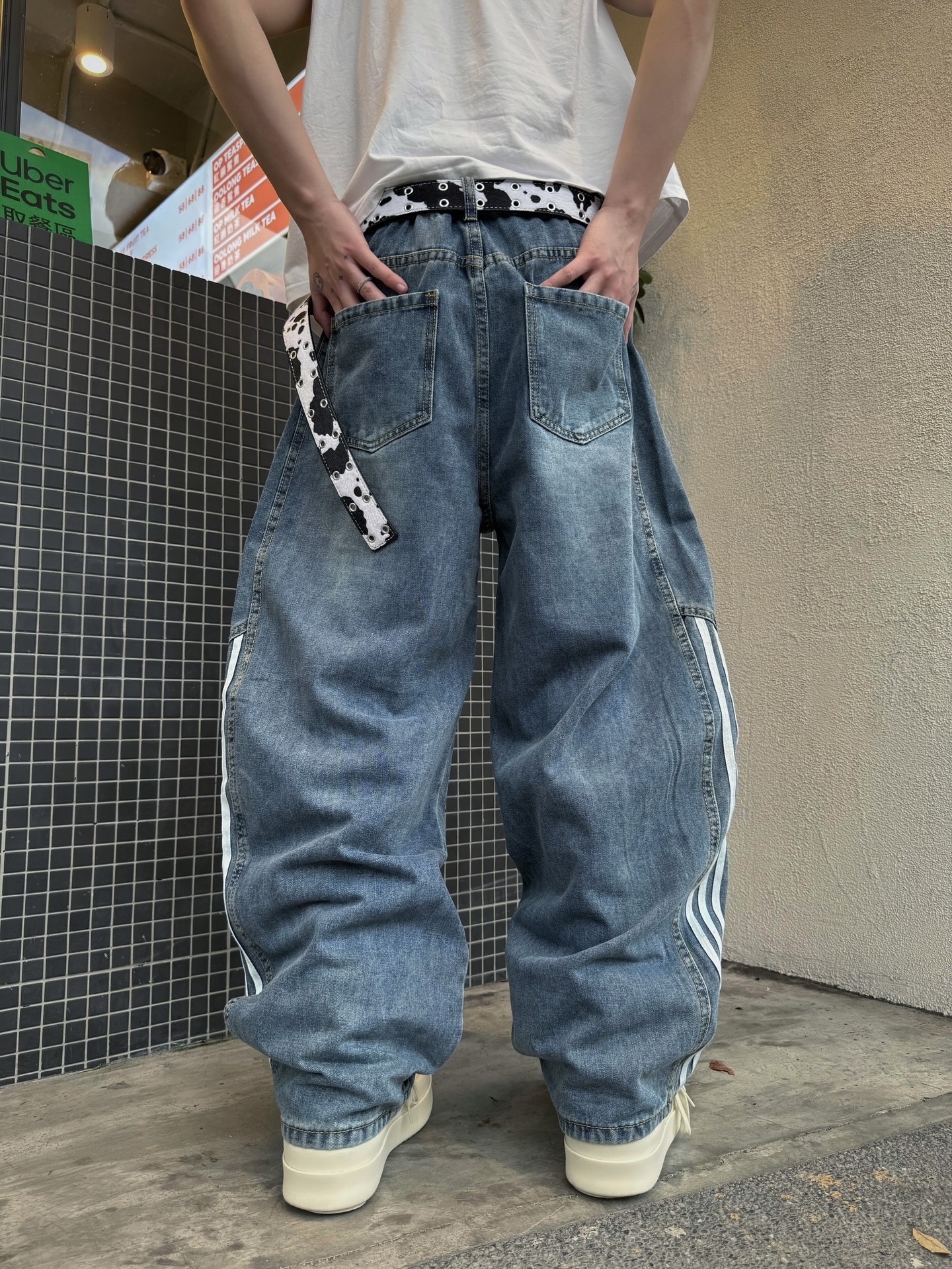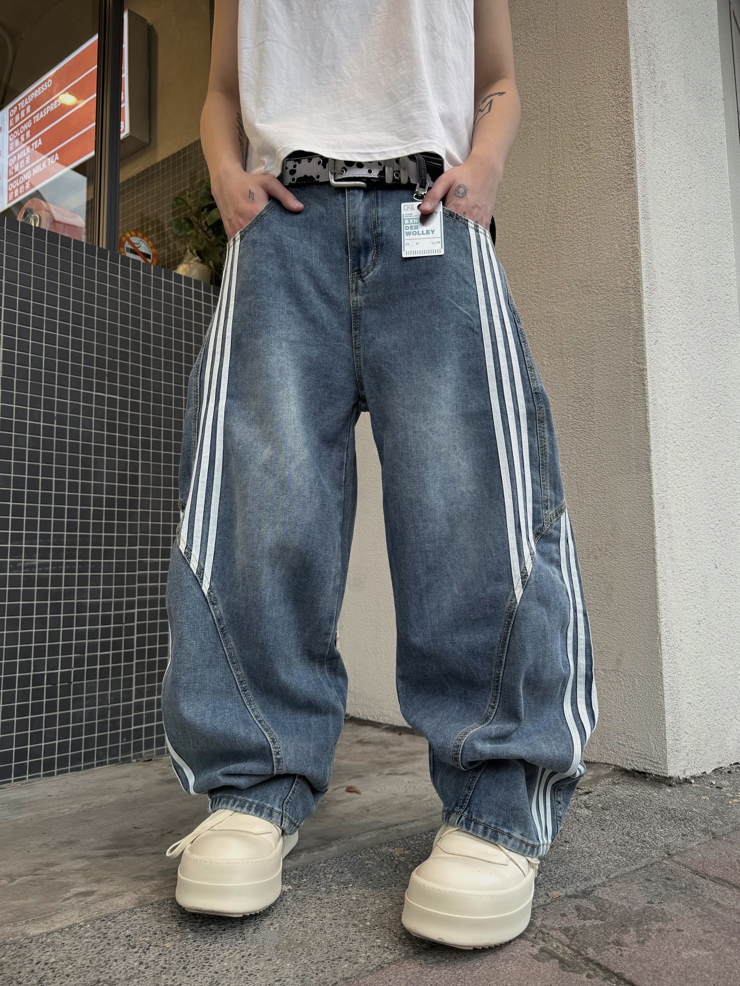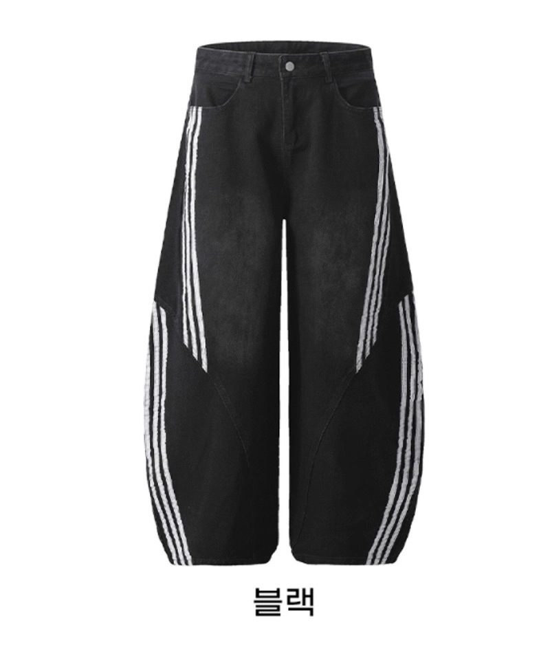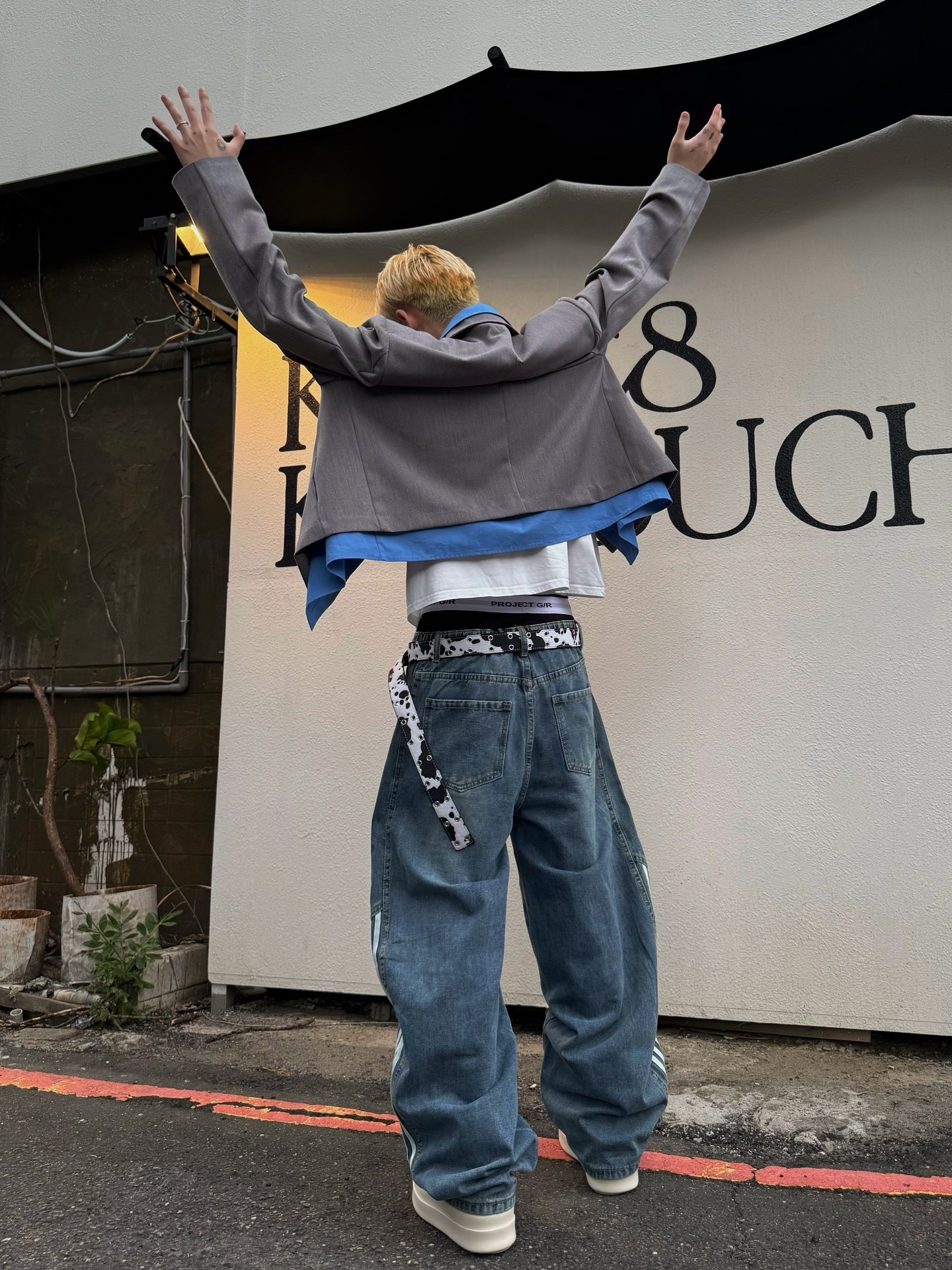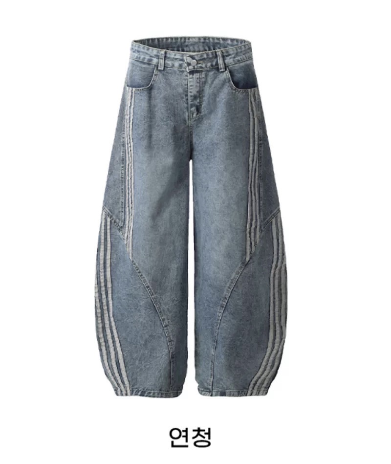 韓國 線條 錯位 弧形 拼接 輪廓 水洗 寬版 牛仔褲 (2color)