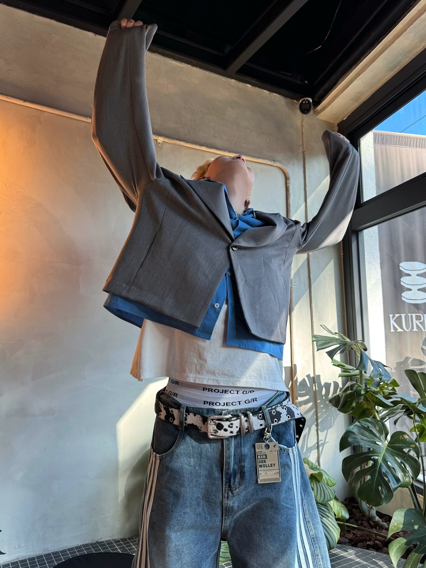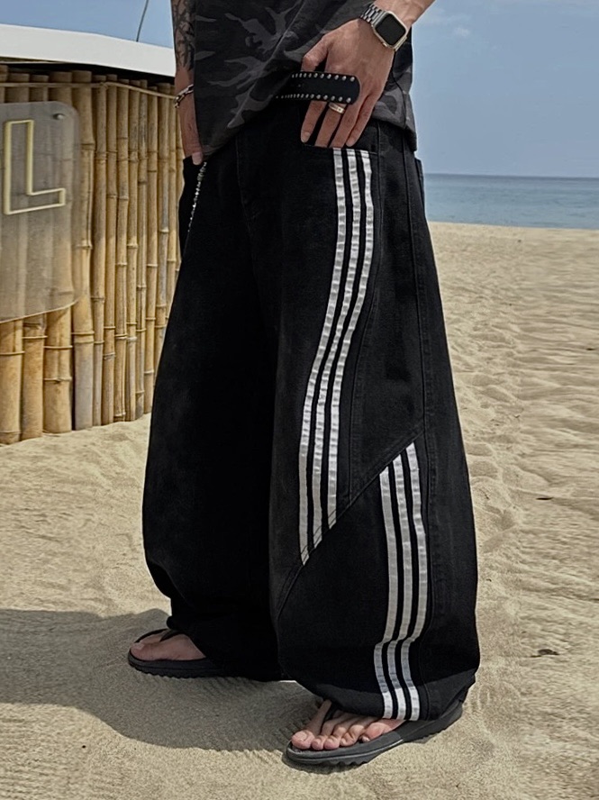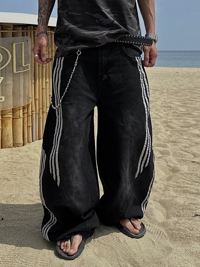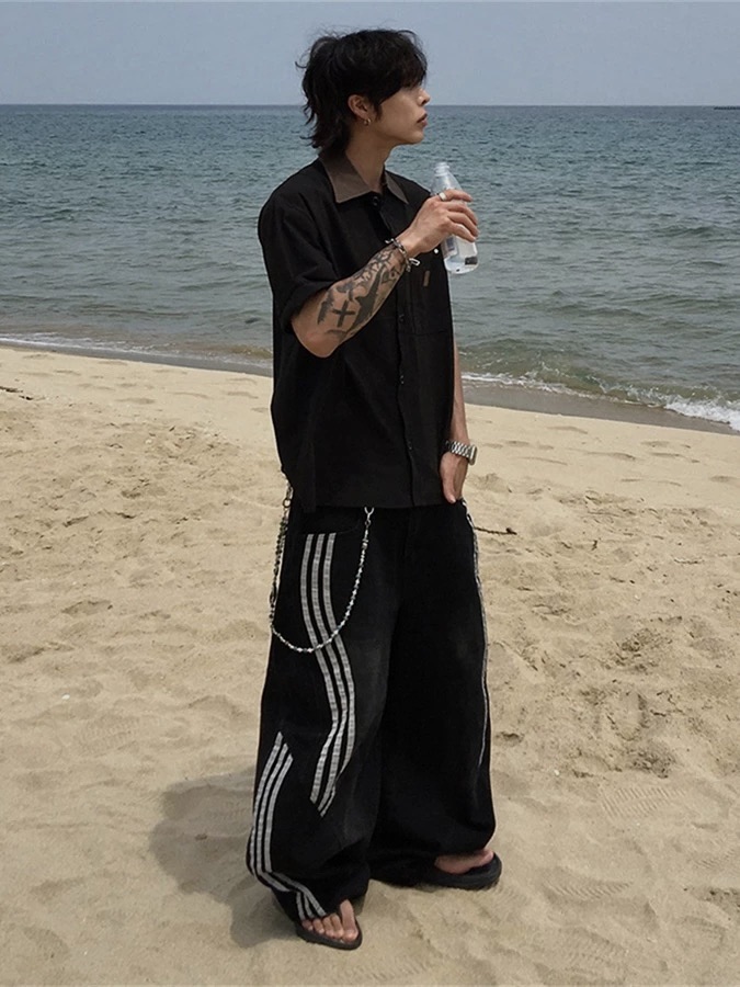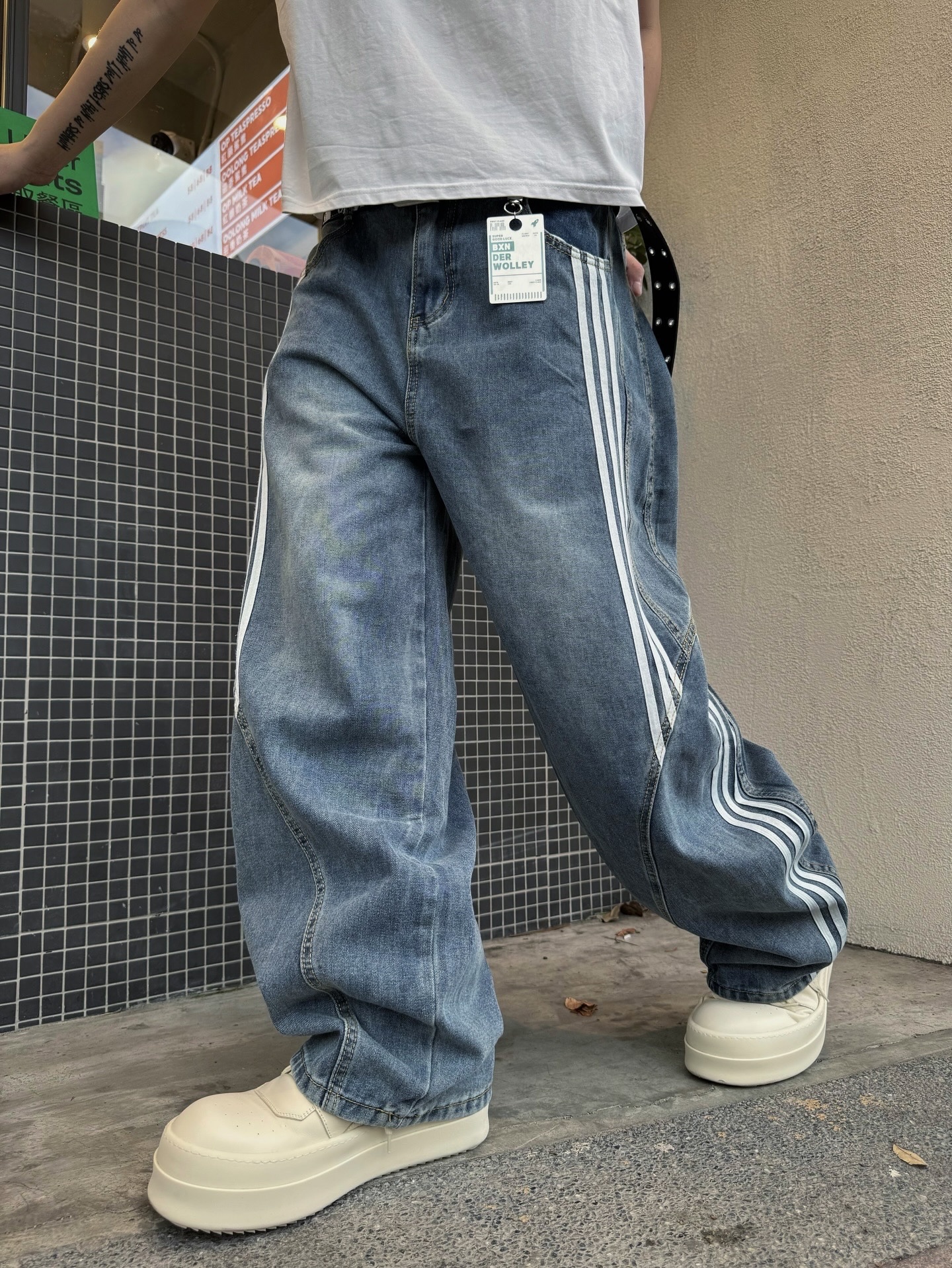 韓國 線條 錯位 弧形 拼接 輪廓 水洗 寬版 牛仔褲 (2color)