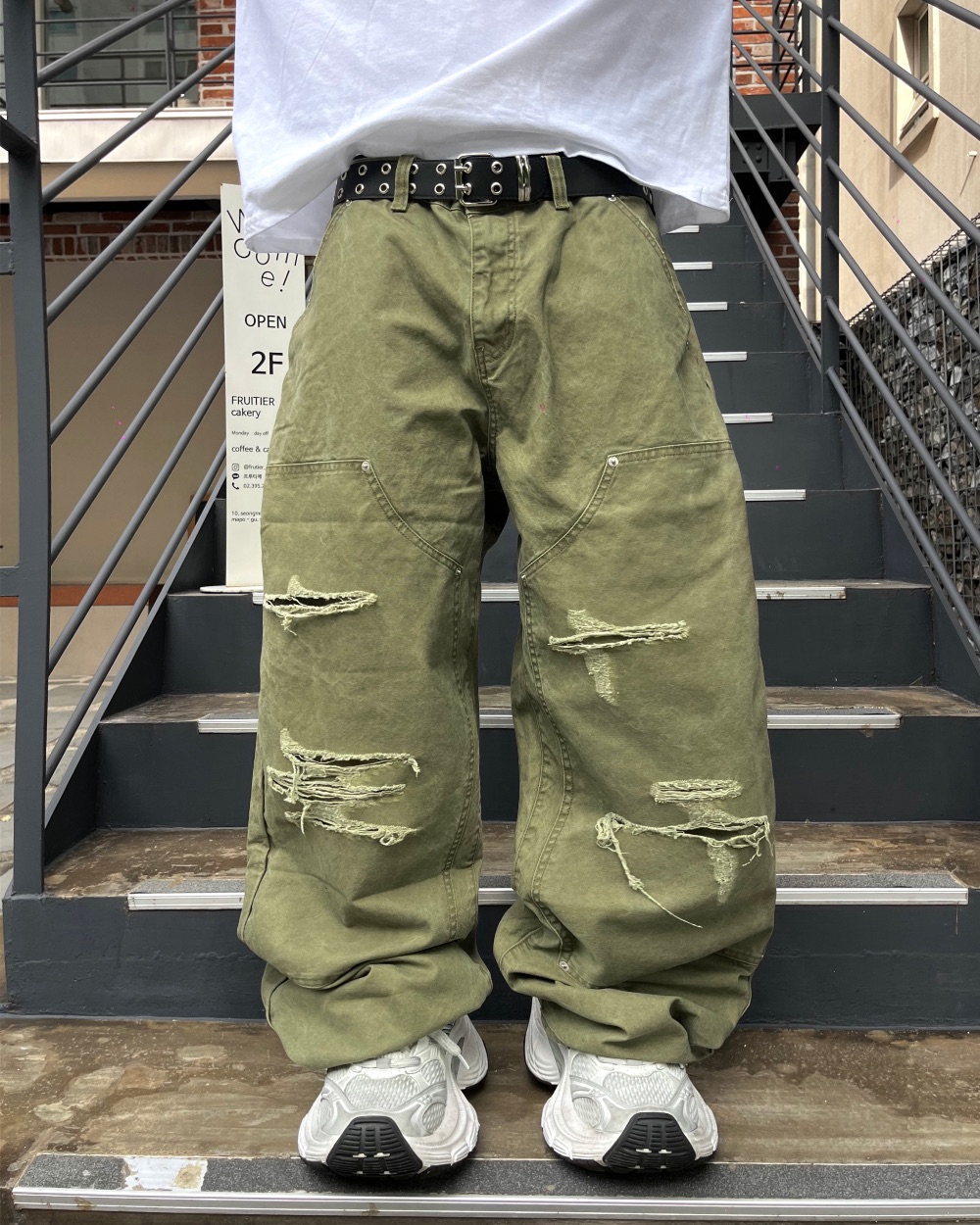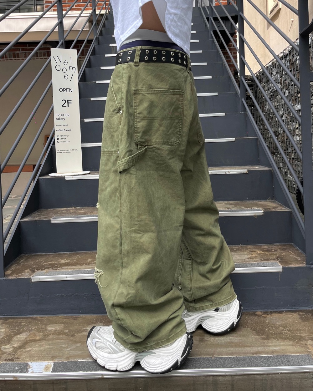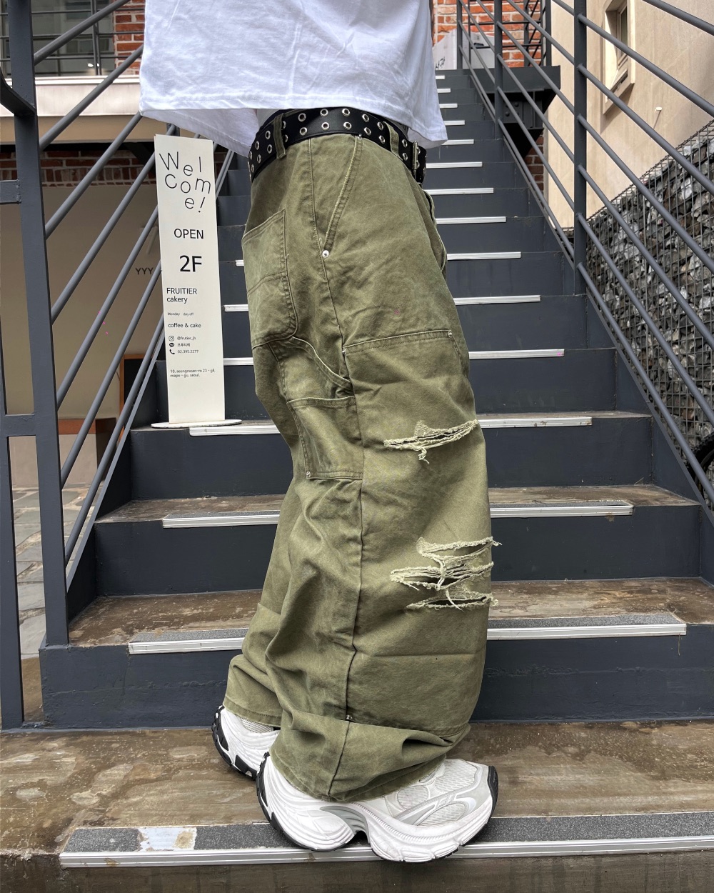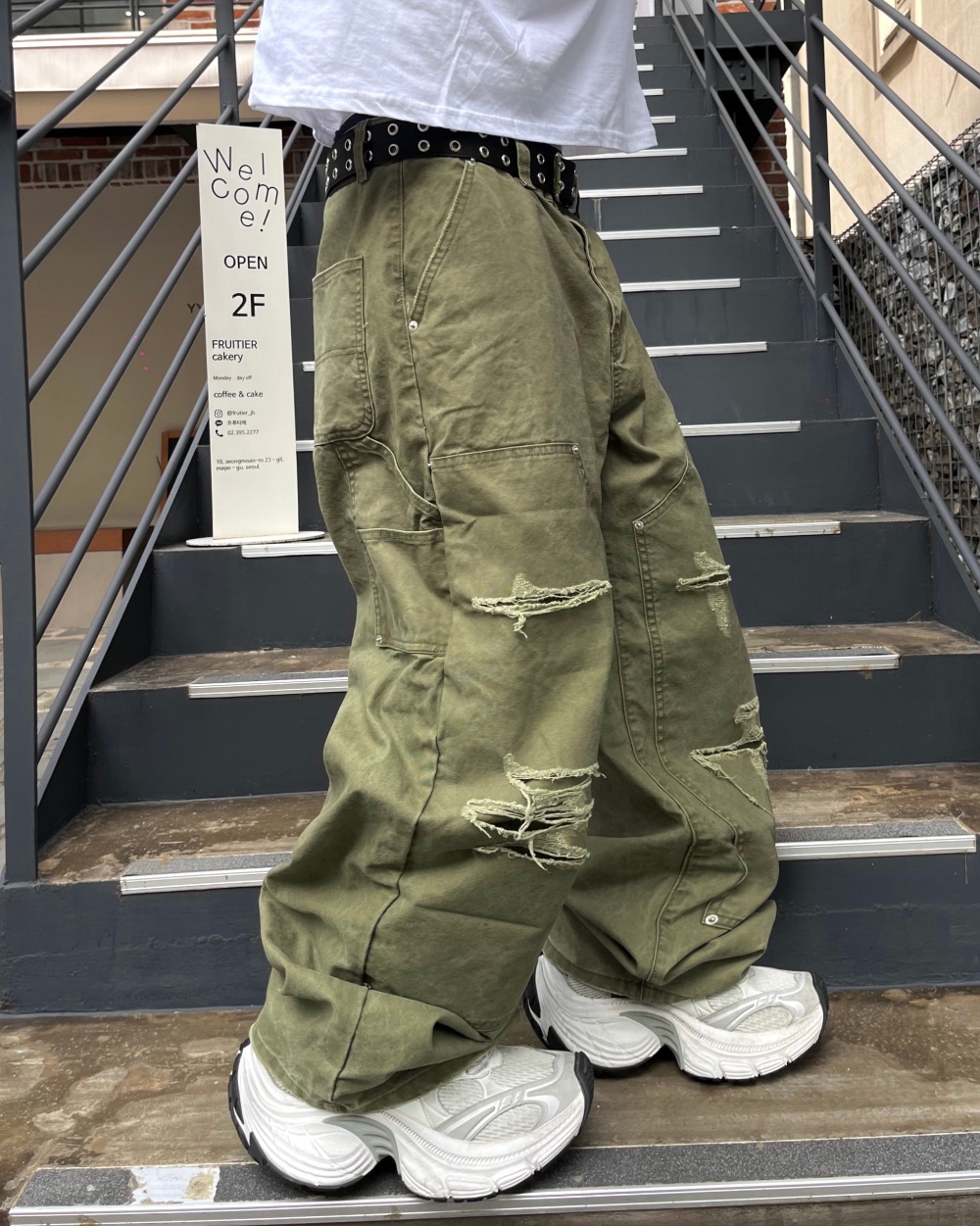 (大推軍綠!) Cause closet 不規則 刀割 破壞 水洗 寬版 工作褲 (3color)