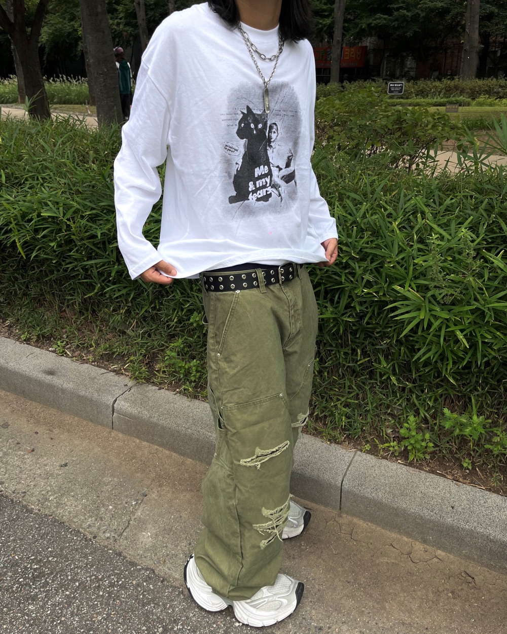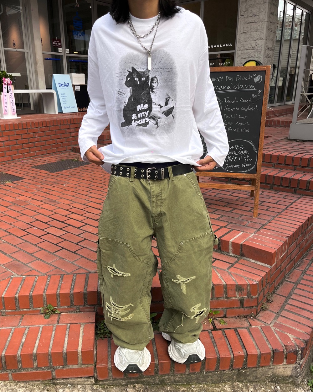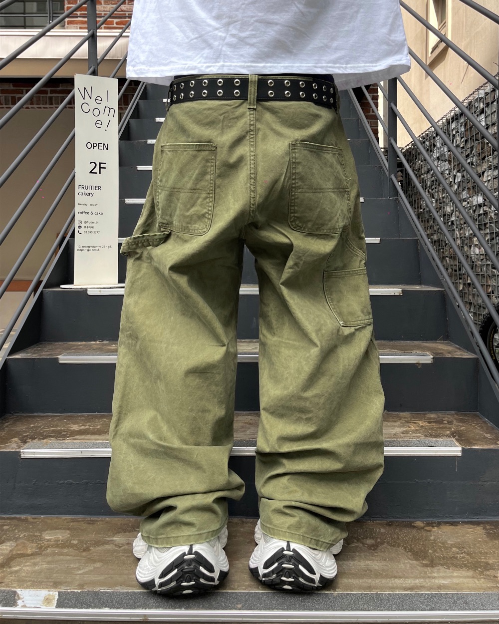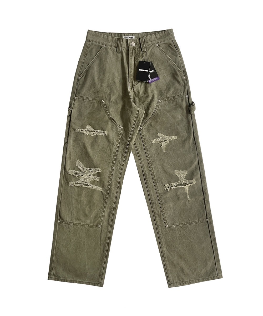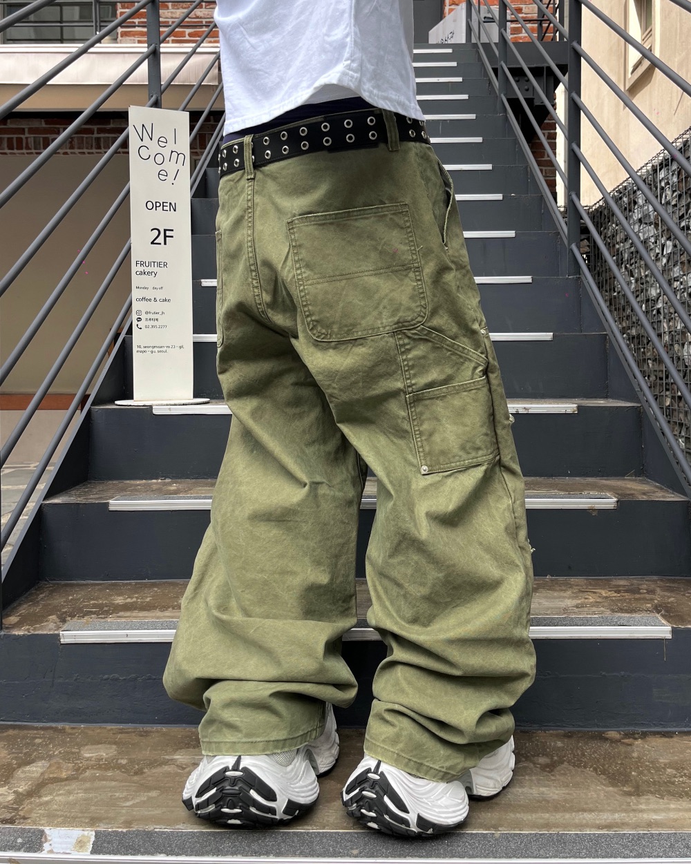 (大推軍綠!) Cause closet 不規則 刀割 破壞 水洗 寬版 工作褲 (3color)